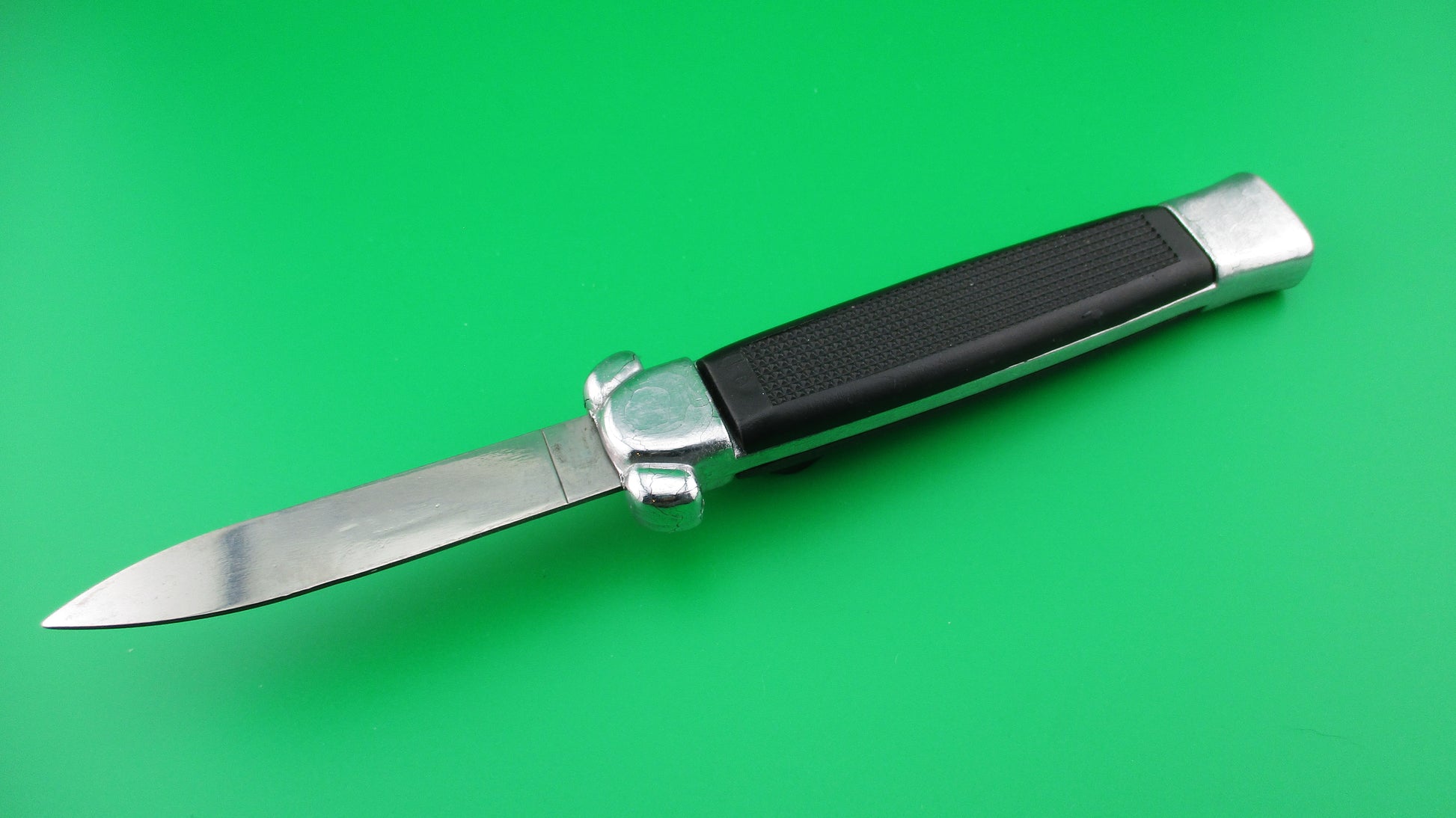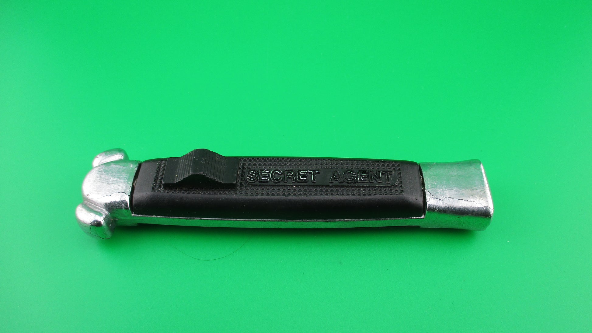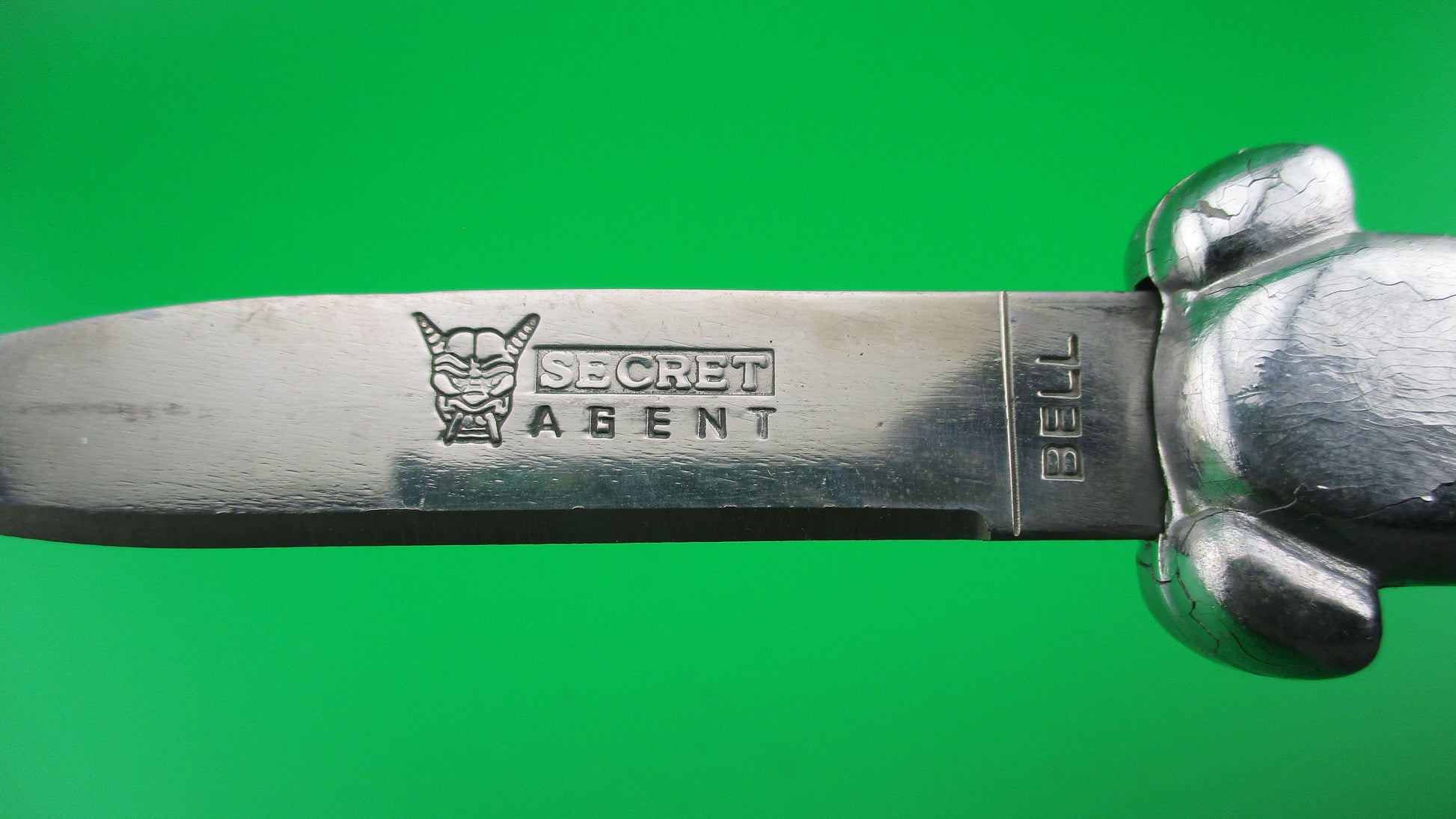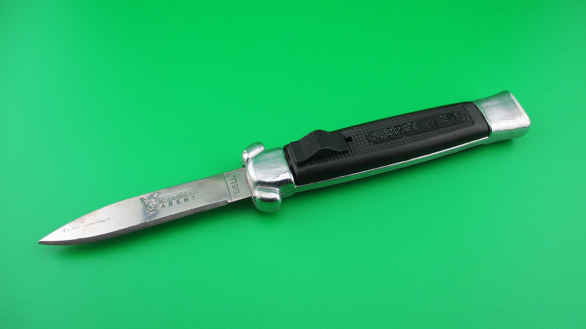Vintage BELL SECRET AGENT 20cm Out the Front OTF DA automatic knife black measures 19.9cm (7 13/16 inches) open with plastic frame w chrome painted bolsters and edges. The flat grind spear point blade is full with original finish and is stamped SECRET AGENT with image of a Horned Demon on the face of the blade and stamped BELL on the ricasso. It has the original factory edge, sharpened on the front. The knife works well with blade opening fully and locking when button is pushed forward and retracts fully into the frame when button is pulled backward. Ex- condition.
