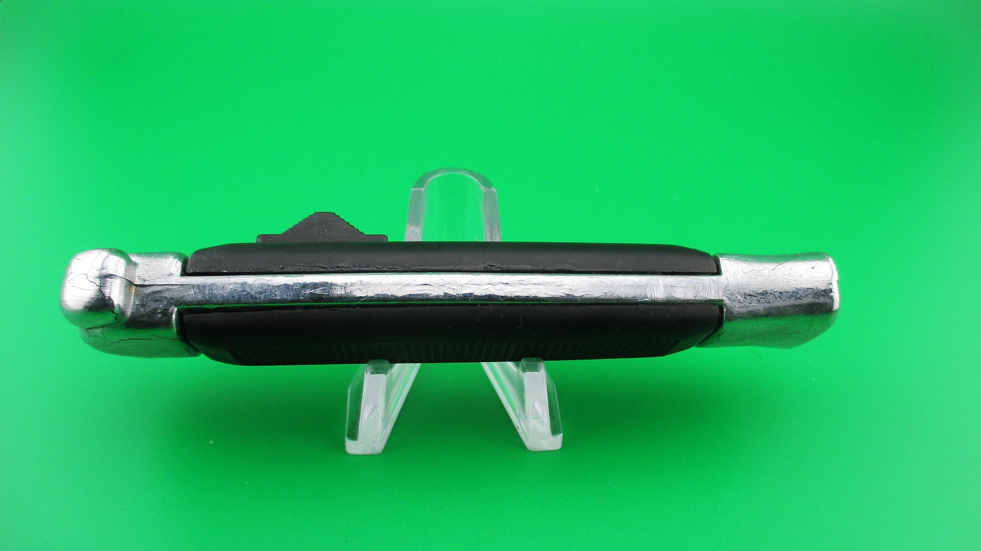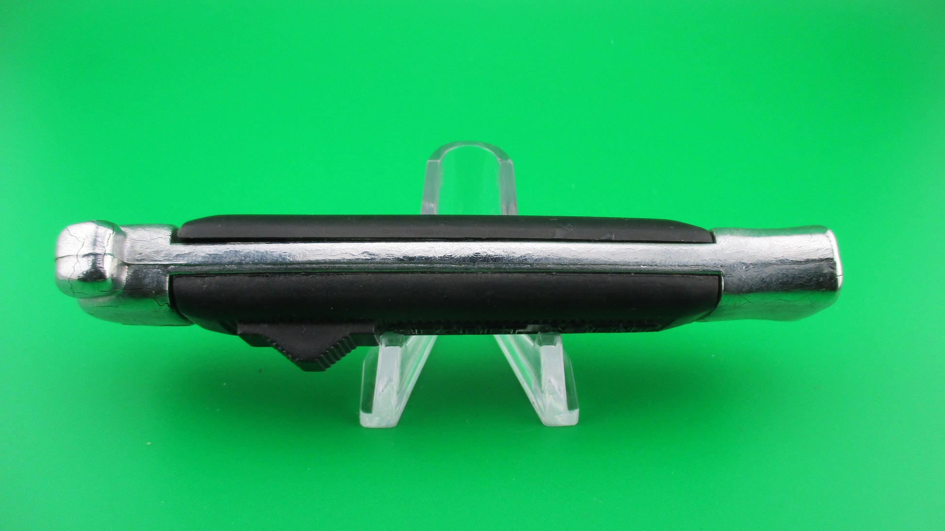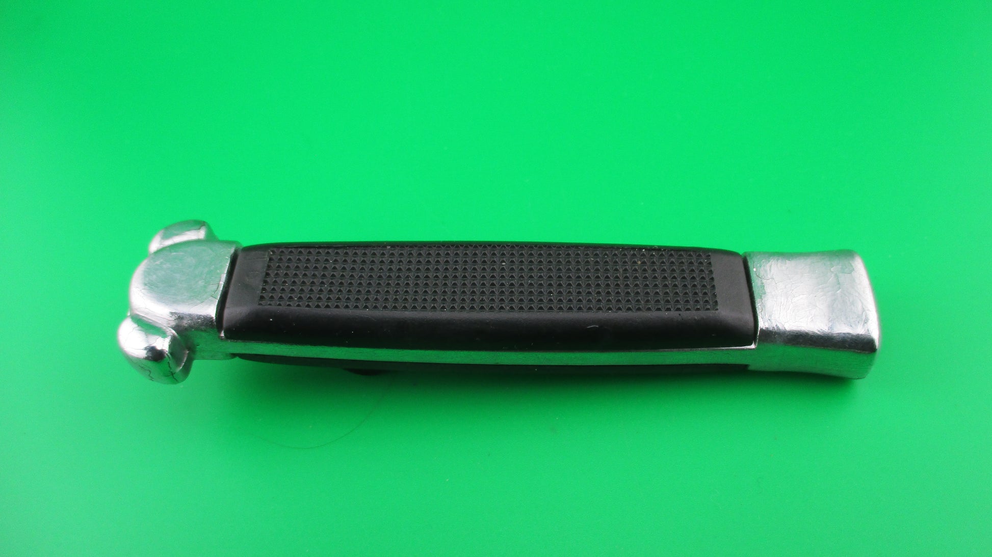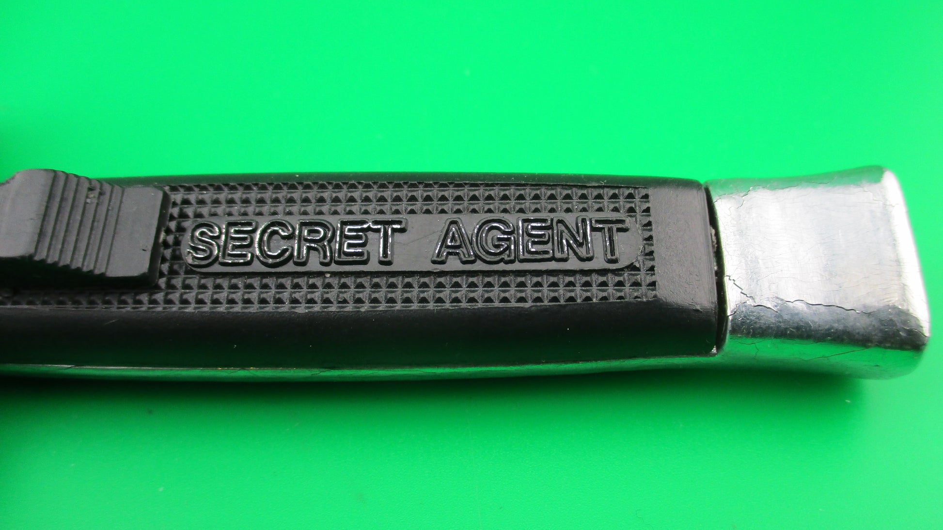Vintage BELL SECRET AGENT 20cm Out the Front OTF DA automatic knife black measures 19.9cm (7 13/16 inches) open with plastic frame w chrome painted bolsters and edges. The flat grind spear point blade is full with original finish and is stamped SECRET AGENT with image of a Horned Demon on the face of the blade and stamped BELL on the ricasso. It has the original factory edge, sharpened on the front. The knife works well with blade opening fully and locking when button is pushed forward and retracts fully into the frame when button is pulled backward. Ex- condition.