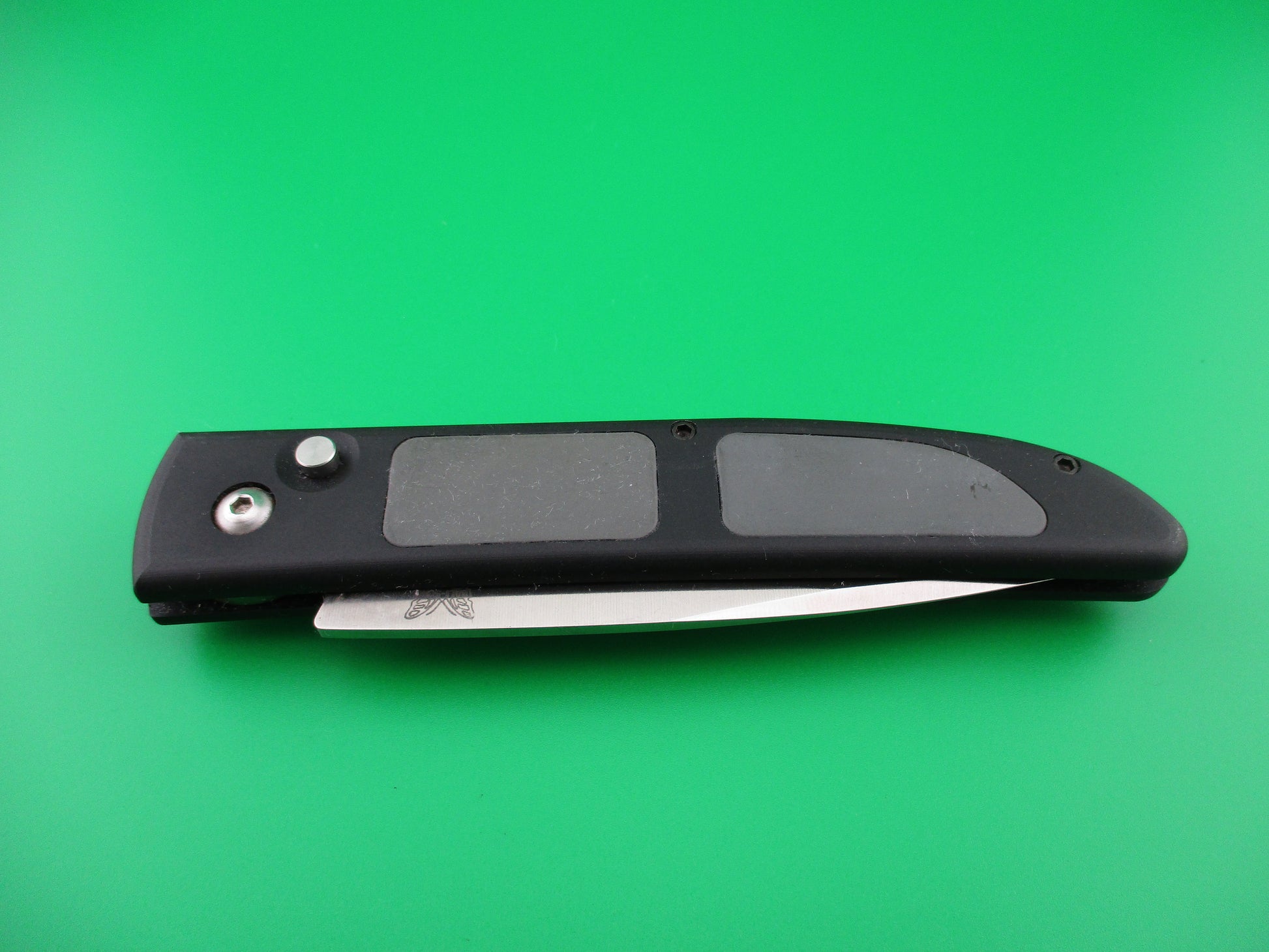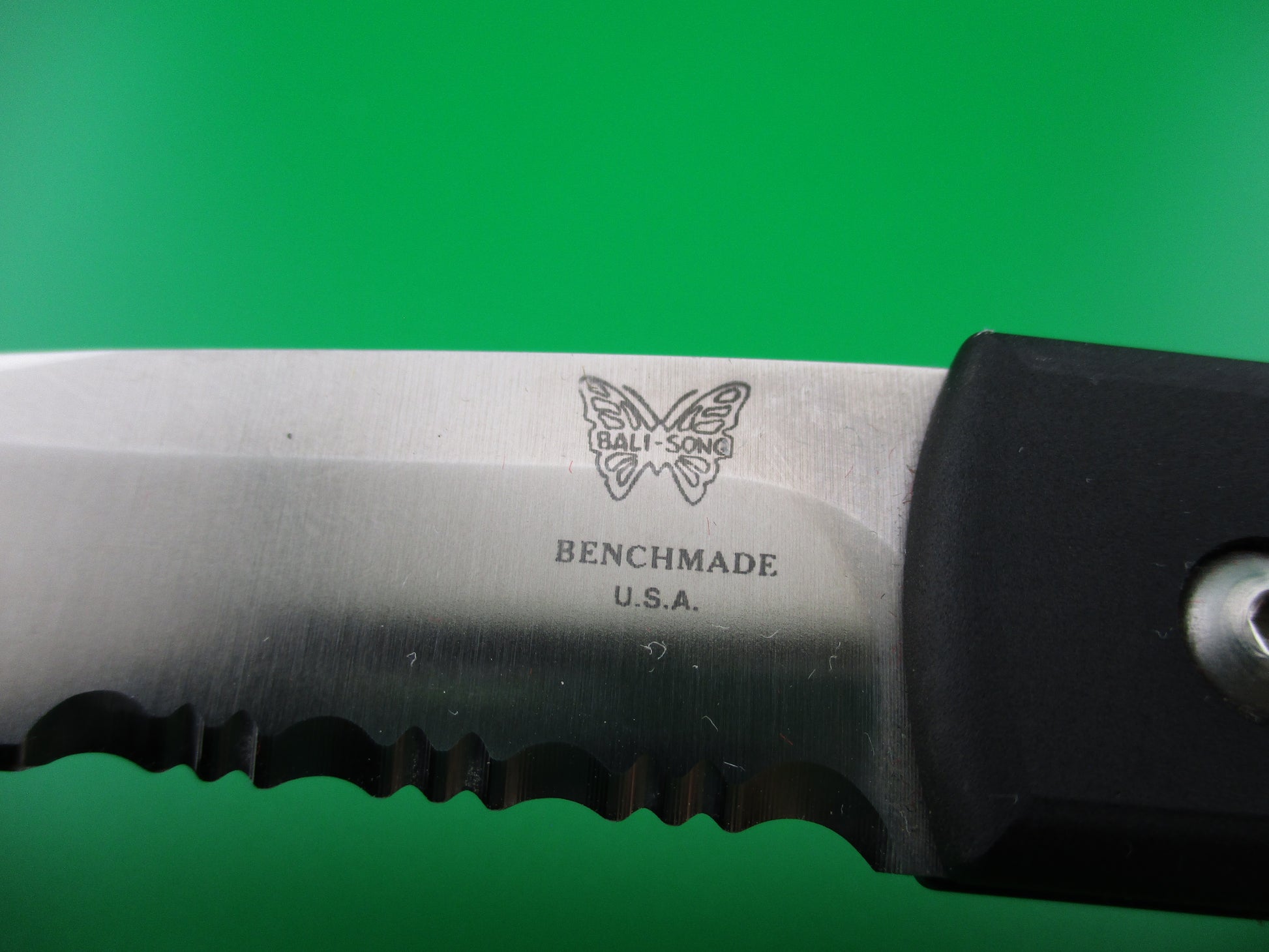 BENCHMADE 3000S nine inch MEL PARDUE design Semi serrated blade automatic knife. This knife doesn't appear to have ever been used, but has been played with and shows some light signs of handling on the scales. It measures just over 5 inches closed an 9 1/8" open. Semi serrated stain finish blade is marked BENCHMADE USA with a picture of a Butterfly that says BALI SONG inside. The back of the blade is marked MEL PURDUE DESIGN. The frame is black aluminum with gray rubberized inserts. The knife works like new! Blade tip deep, strong snap and TIGHT lockup open!