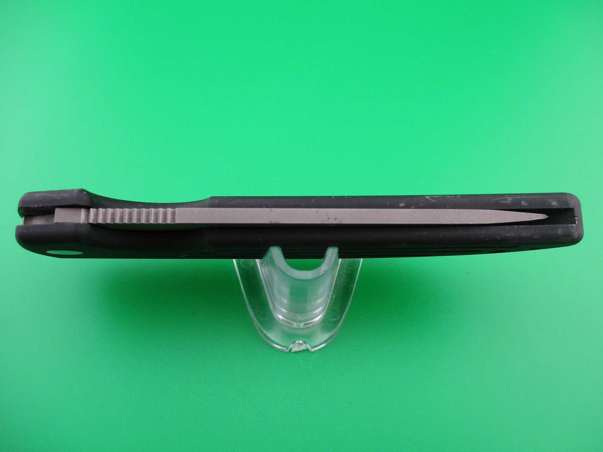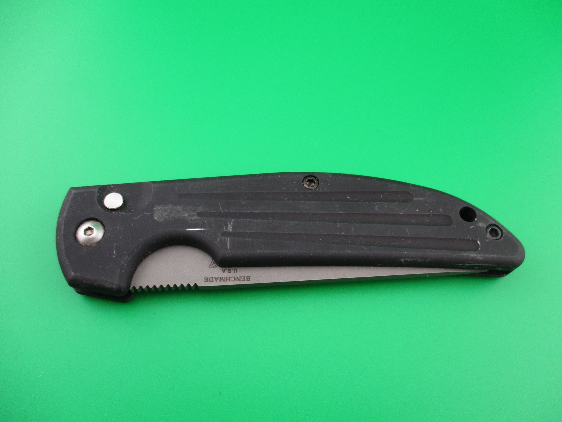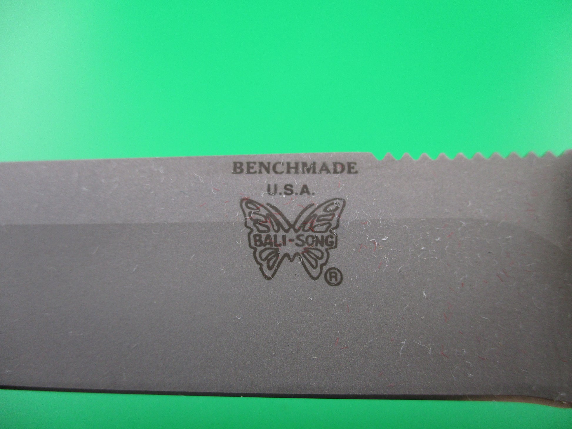 BENCHMADE 7500 9 inch Tsunami Tanto blade automatic knife made in the USA. The knife is like new, measures 5 inches closed and 9 inches open and is marked BENCHMADE USA with a picture of a butterfly with the words BALI SONG inside. The Tanto style blade is bead blasted finish and 100% full and factory edge. The black aluminum scales are black powder coated and in nice condition with a few scuffs from handling. Works perfectly, sits deep, strong snap and Super Tight lockup open. Except for the scuffs on the handles it's like new.