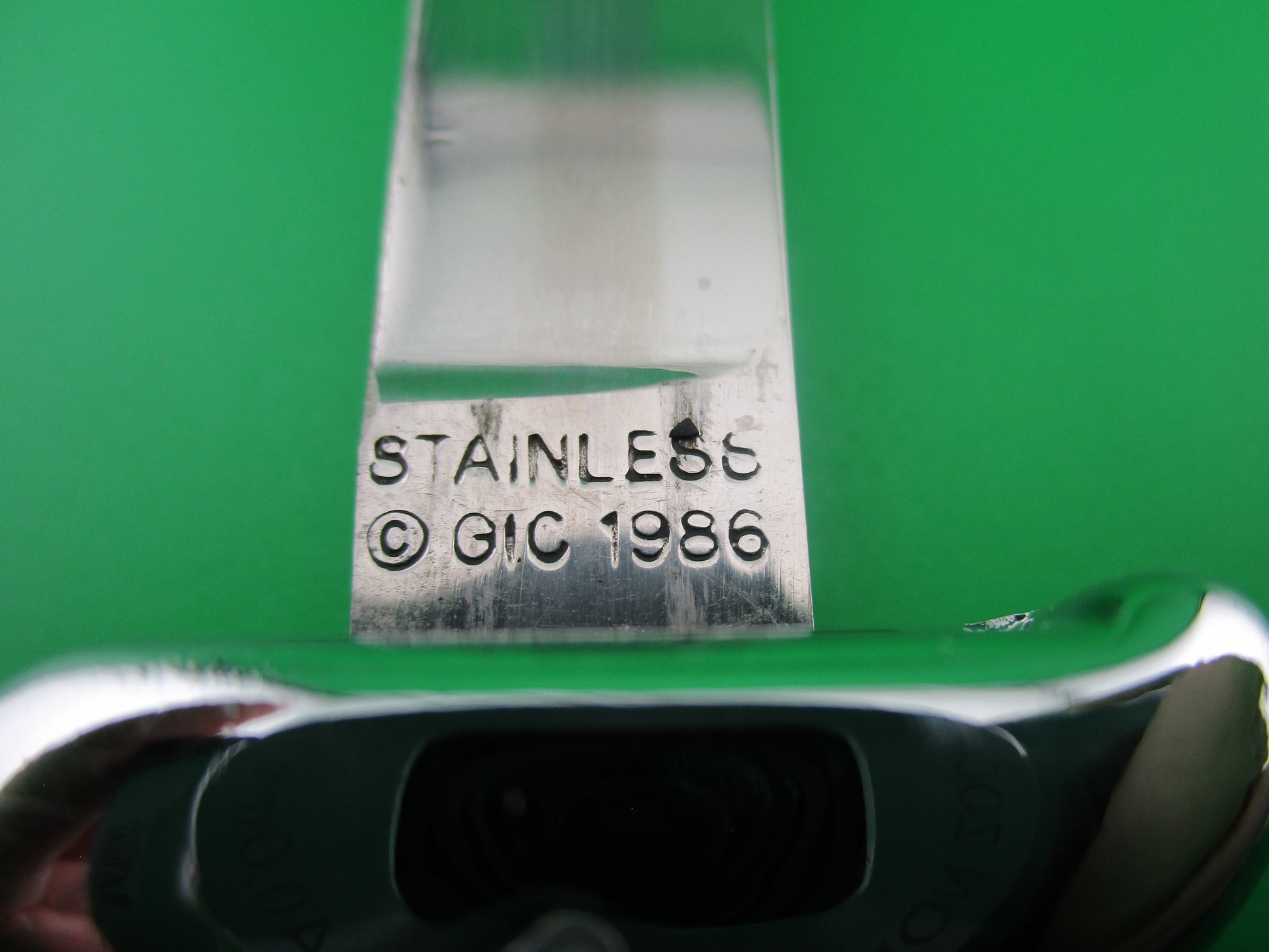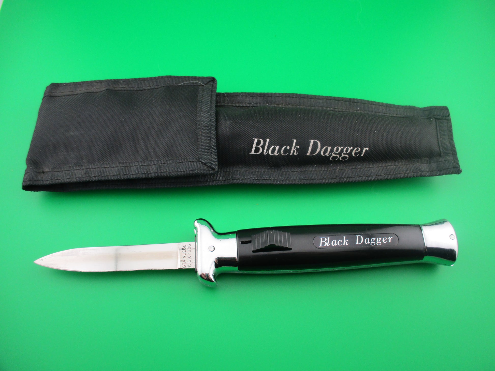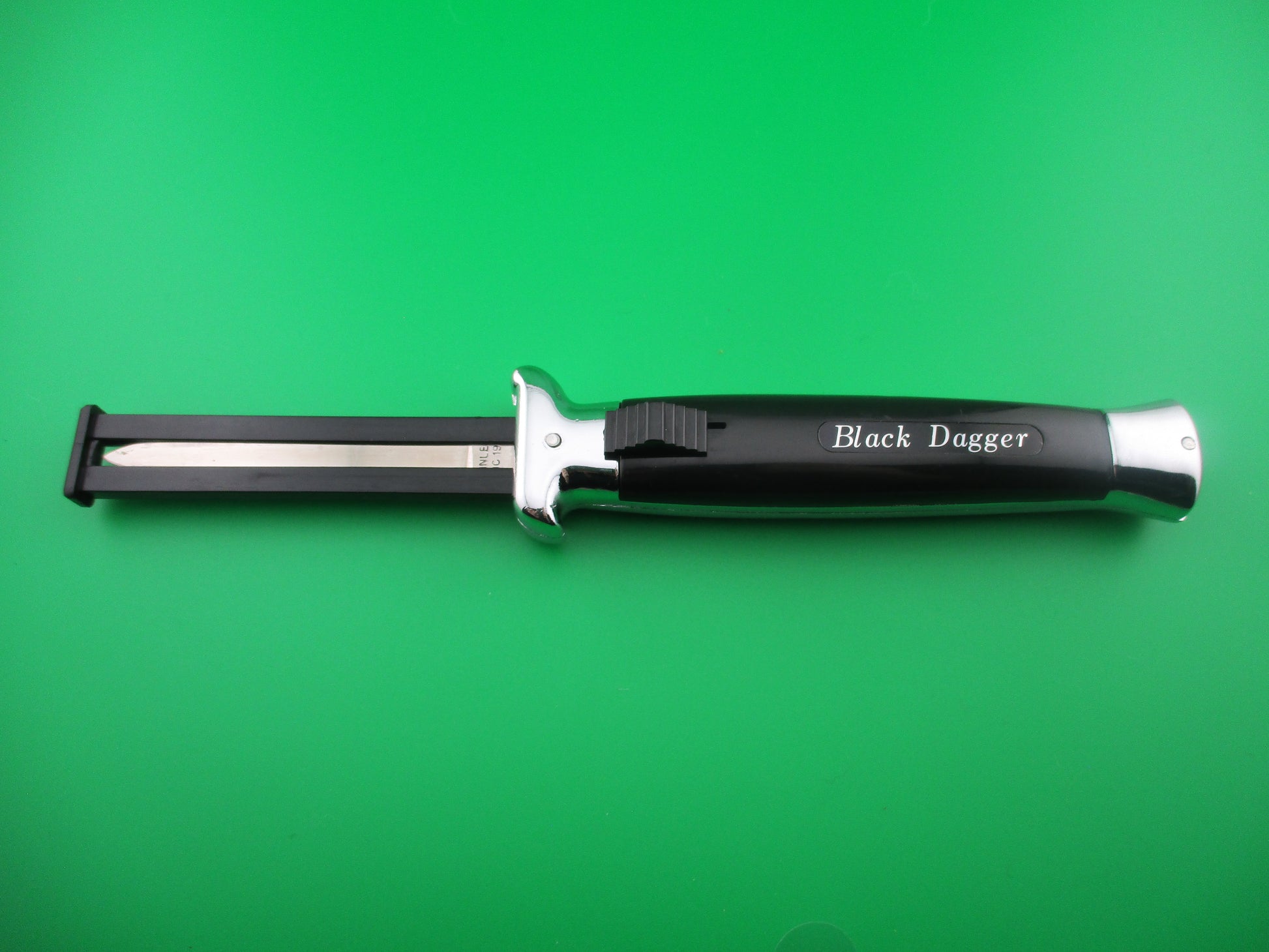 Unusual knife with fixed blade and retractable blade guard. The knife is marked Black Dagger on the handle and on the nylon sheath. It measures a little under 9 inches and is in nearly new condition. Blade marked STAINLESS over GIC 1986. Works well.