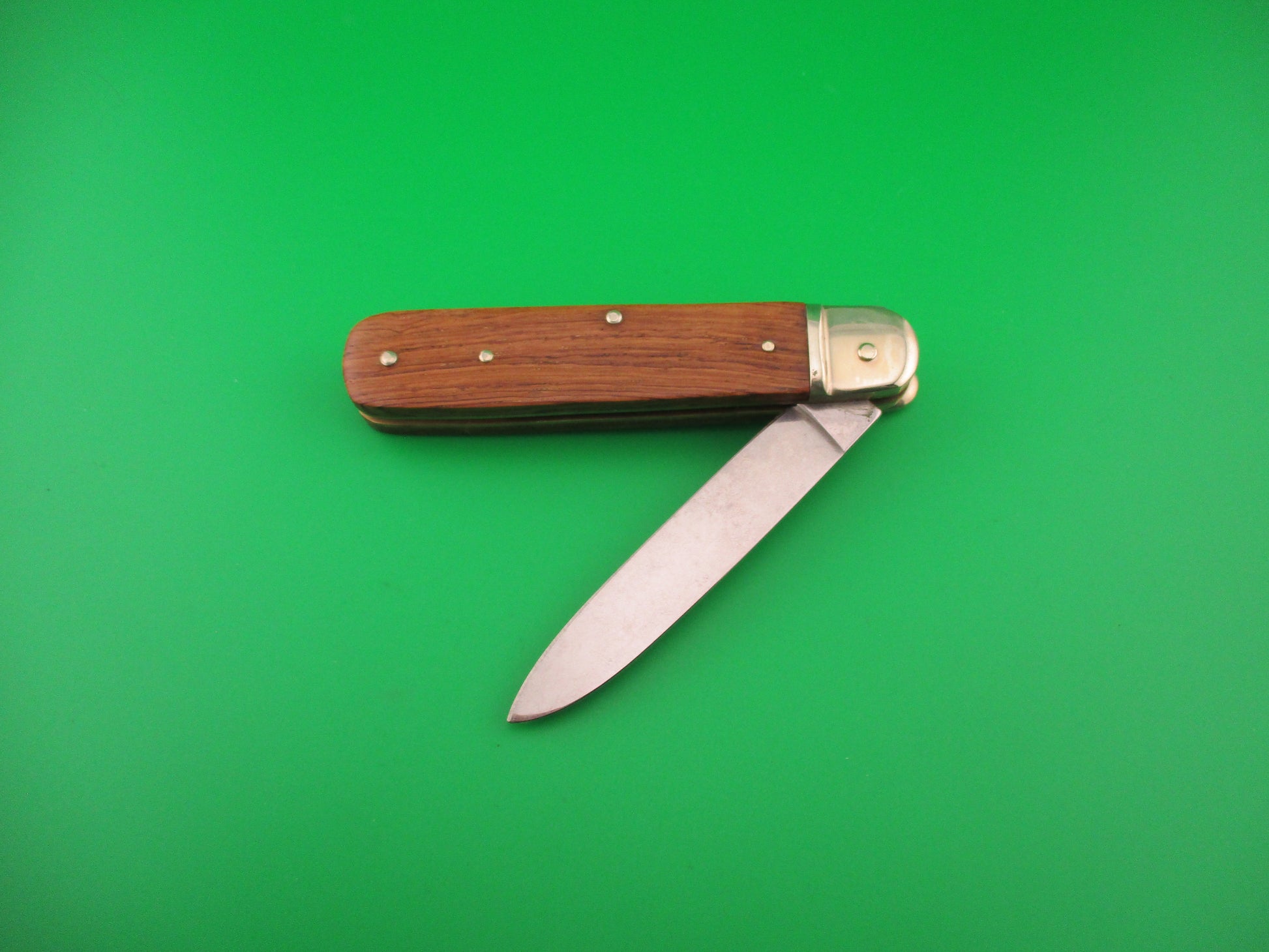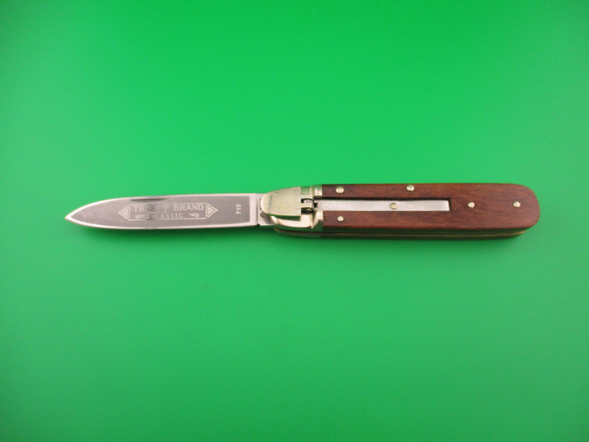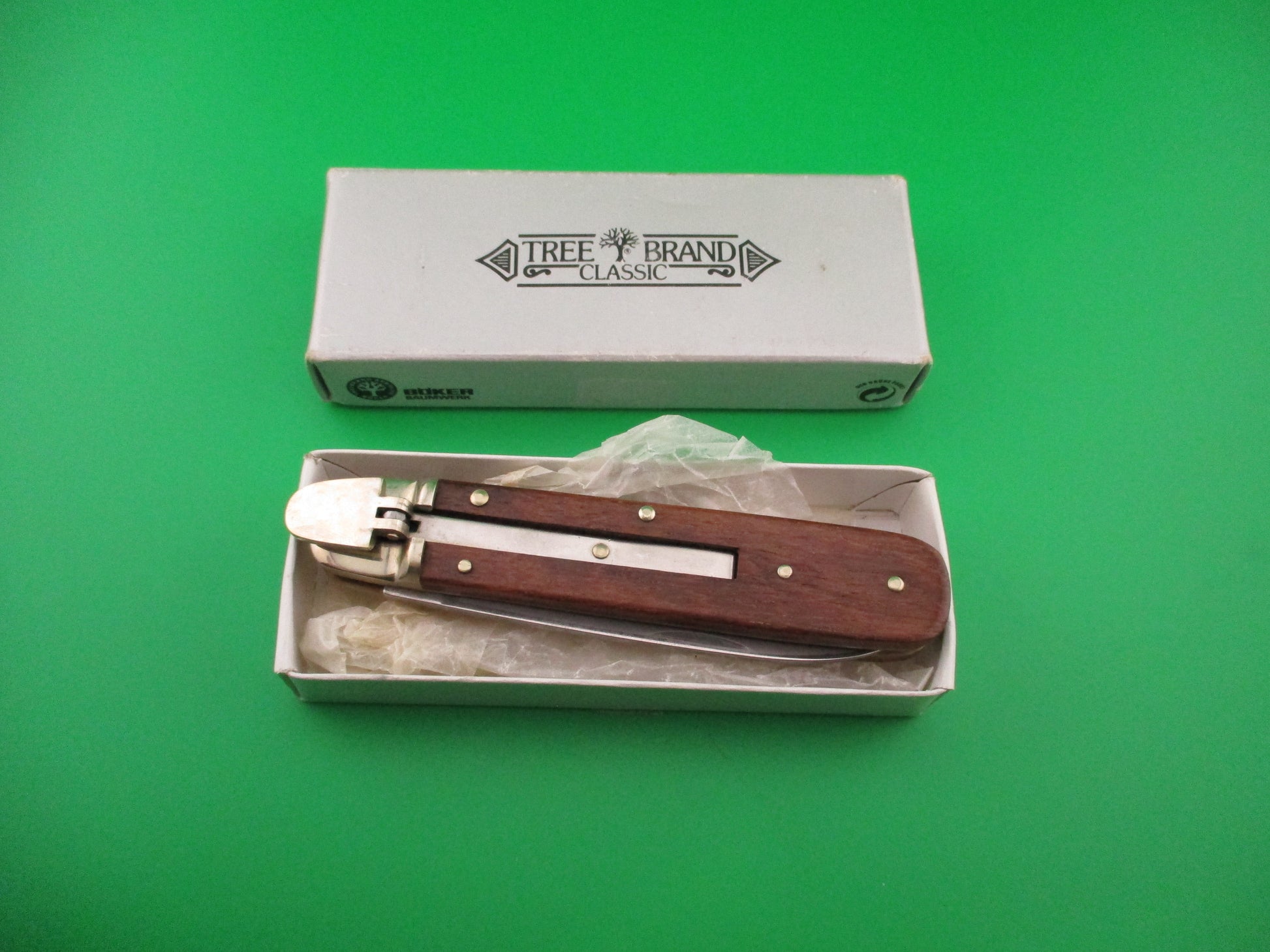 BOKER Tree Brand Classic 712 Lever knife made in Germany. This knife measures 11cm closed and 19.5cm (7.75 inches) open with brass liners and nickel silver bolsters, lever and pins. The spear point blade is 100% full with a strong etch TREE BRAND CLASSIC 712. The tang is stamped BOKER SOLINGEN GERMANY STAINLESS with a picture of a Tree. Blade looks to have been lightly sharpened and shows signs of light use. The scales (handles) are medium colored wood and in very good condition. The knife works great with blade tip below liners when closed, strong snap and Tight lockup open. Nice example of a German BOKER 712 Tree Brand lever knife in original box and wax paper. EX- condition.