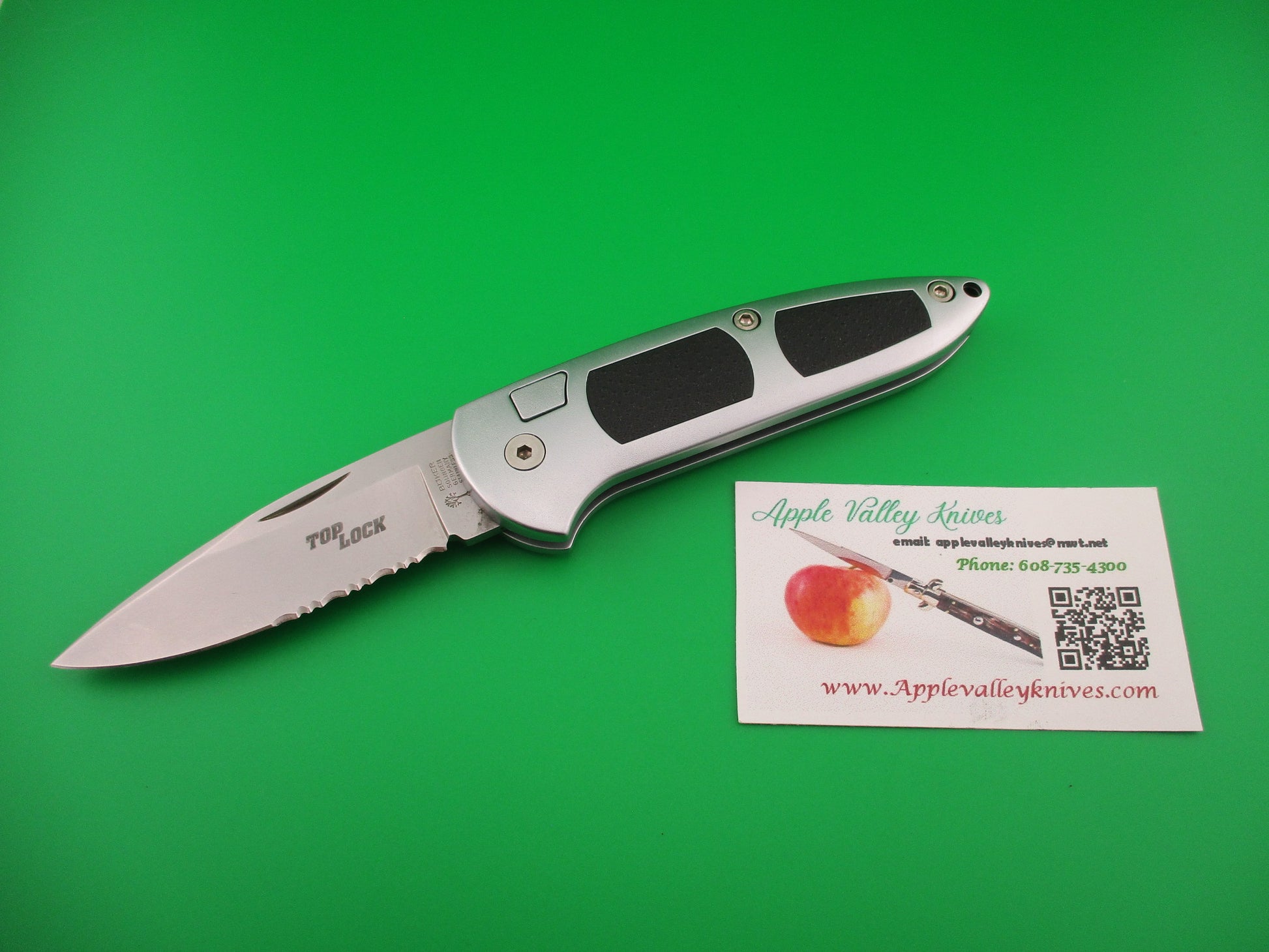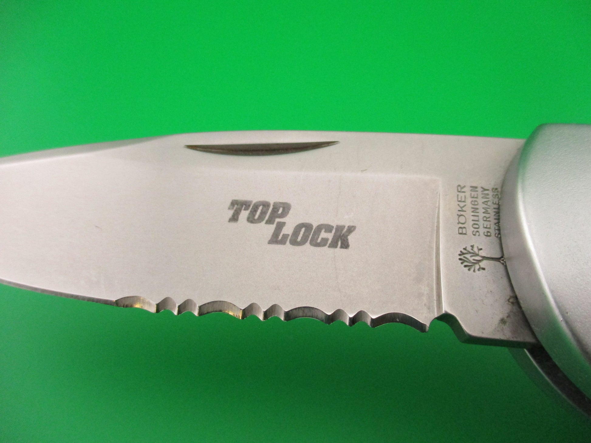 BOKER SOLINGEN GERMANY STAINLESS TOPLOCK 21cm German Coilspring automatic knife made within past 30 years in Germany. The knife measures 20.5cm (8 inches) open and 4 11/16 inches closed with Aluminum frame. The saber spear swedge blade has partially serrated edge and is 100% full with factory finish and the tang is stamped BOKER SOLINGEN GERMANY STAINLESS and the face is etched TOP LOCK. The Aluminum frame is in excellent condition as are the black rubber inserts for better grip. The knife works perfectly with blade sitting deep closed, smooth strong snap and Tight lockup! Nearly new condition.