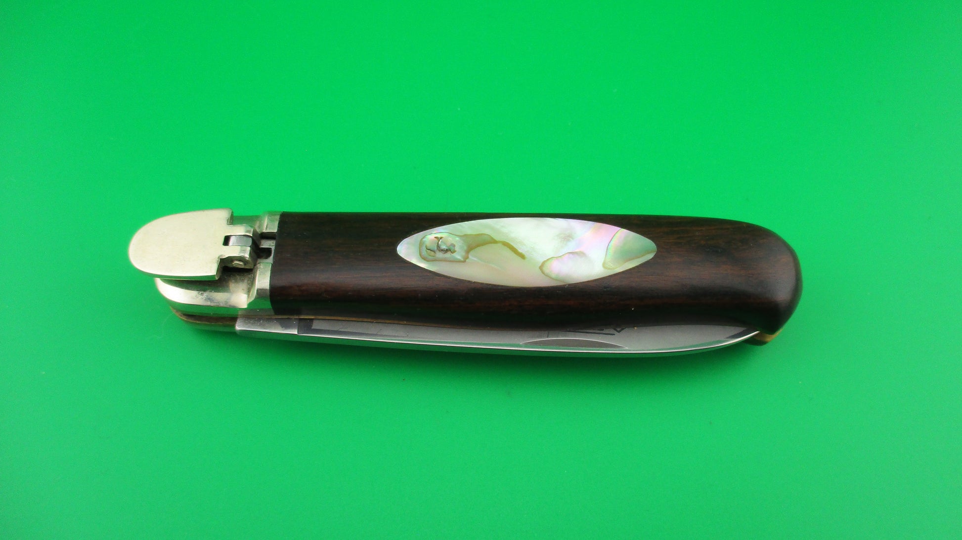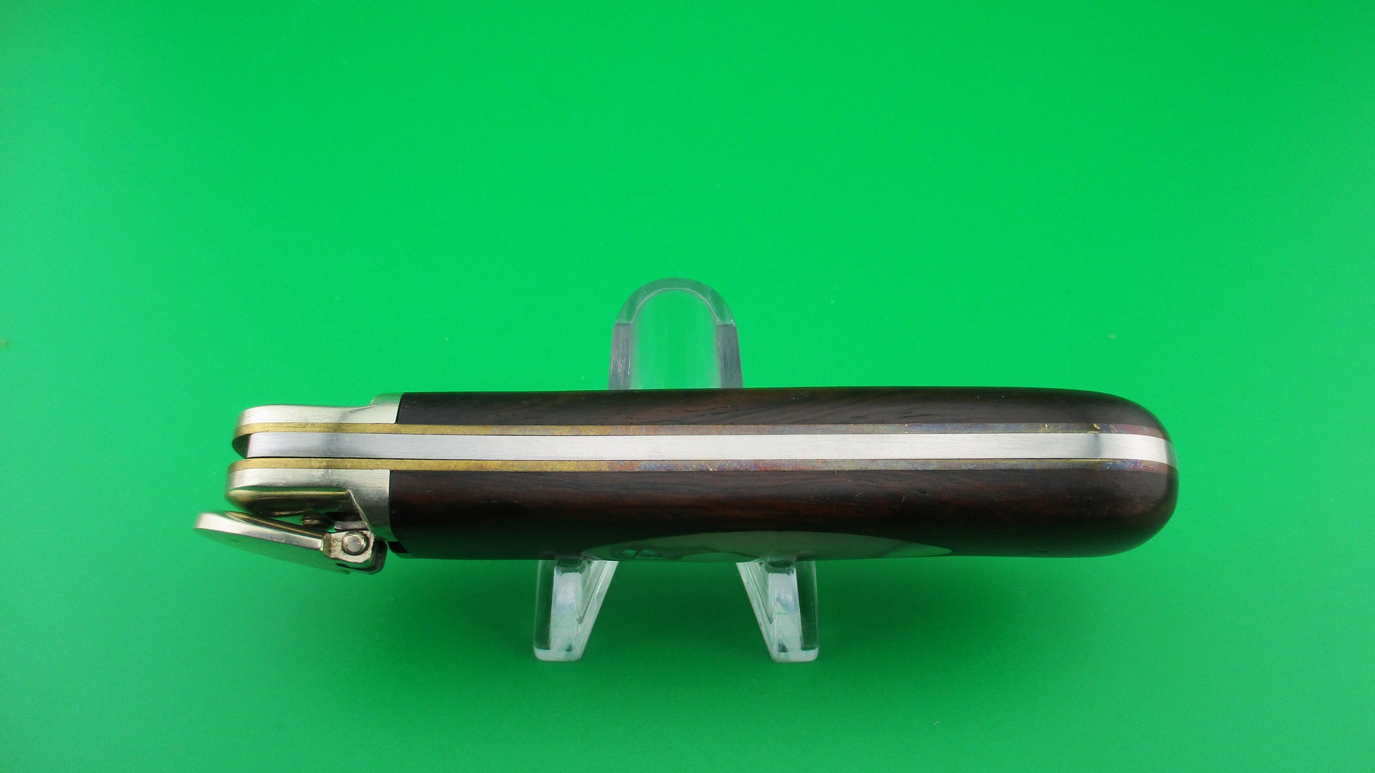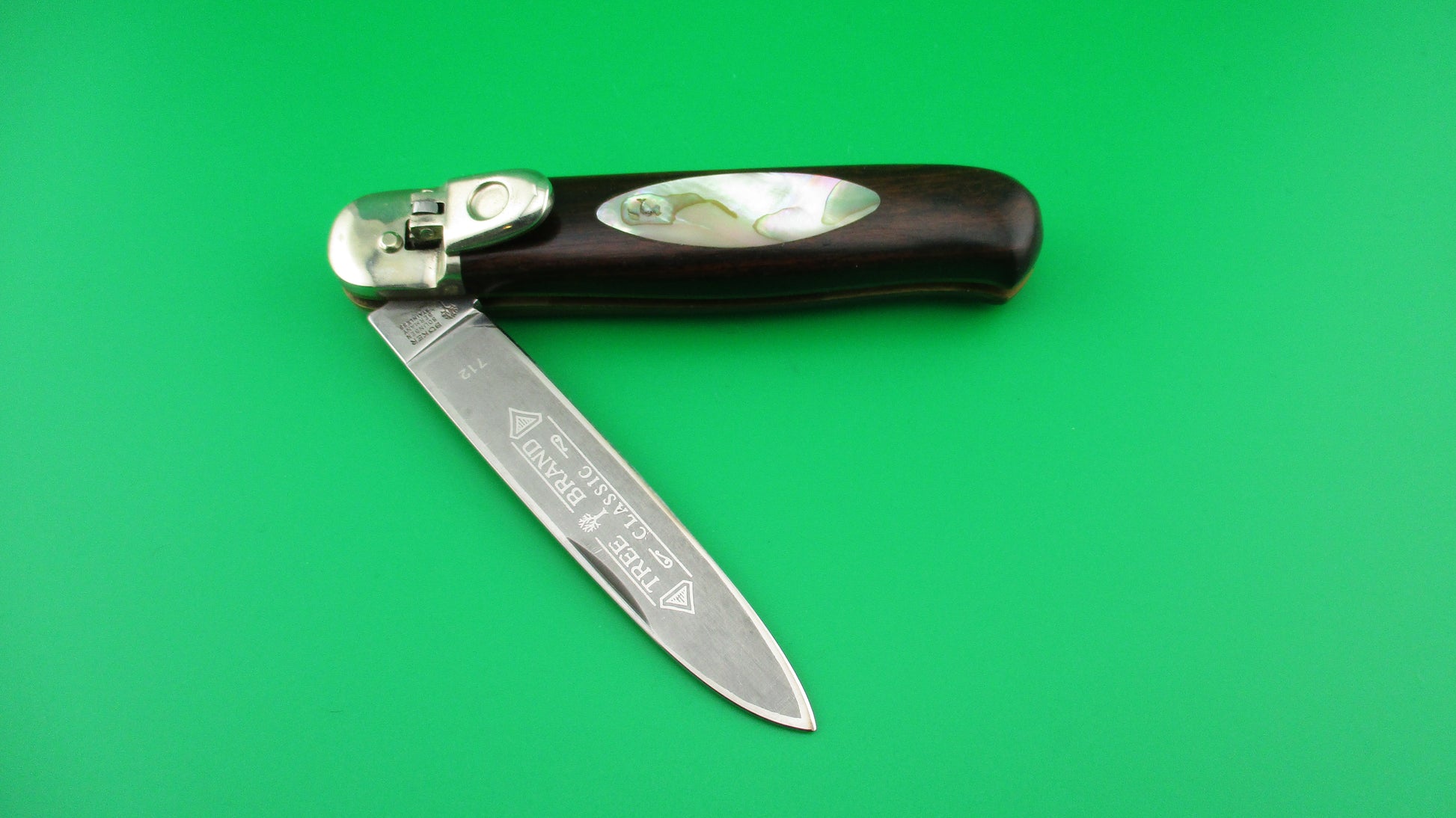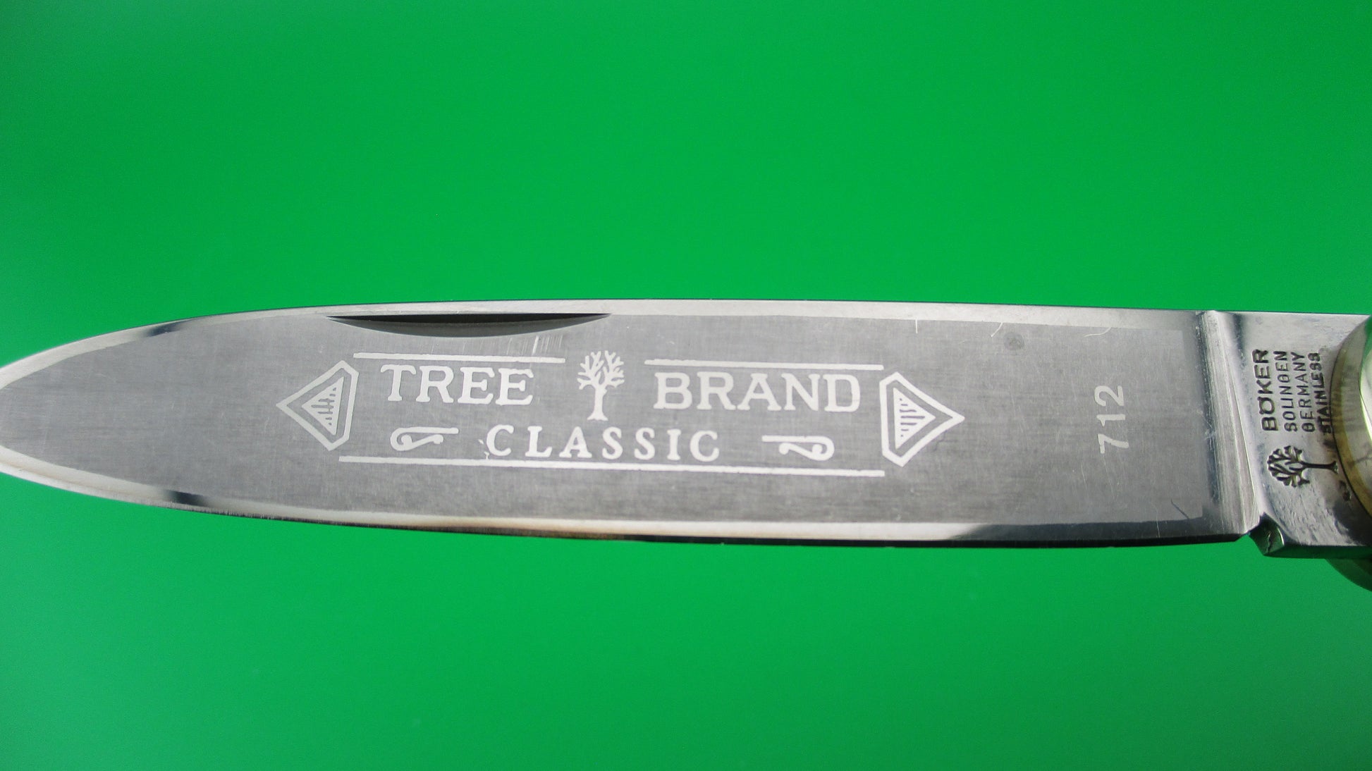 BOKER Tree Brand Classic 712 Lever knife made in Germany with wood scales and Mother of Pearl insert. This knife measures 11cm closed and 19.5cm (7.75 inches) open with brass liners and nickel silver bolsters & lever. The blade is 100% full with a strong etch. The tang is stamped BOKER SOLINGEN GERMANY STAINLESS with a picture of a Tree. The scales (handles) are wood with an oval Mother of Pearl insert. The knife works great with blade tip well below liners when closed, strong snap and Tight lockup open. Beautiful example of a German BOKER 712 Tree Brand lever knife. Nearly new condition.