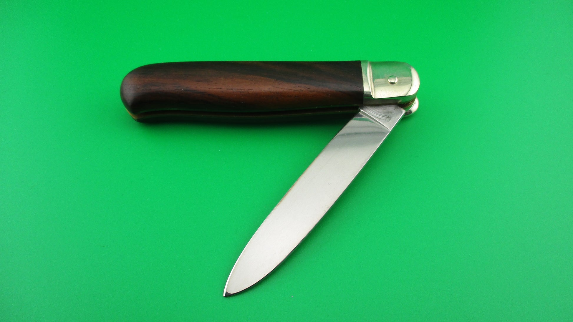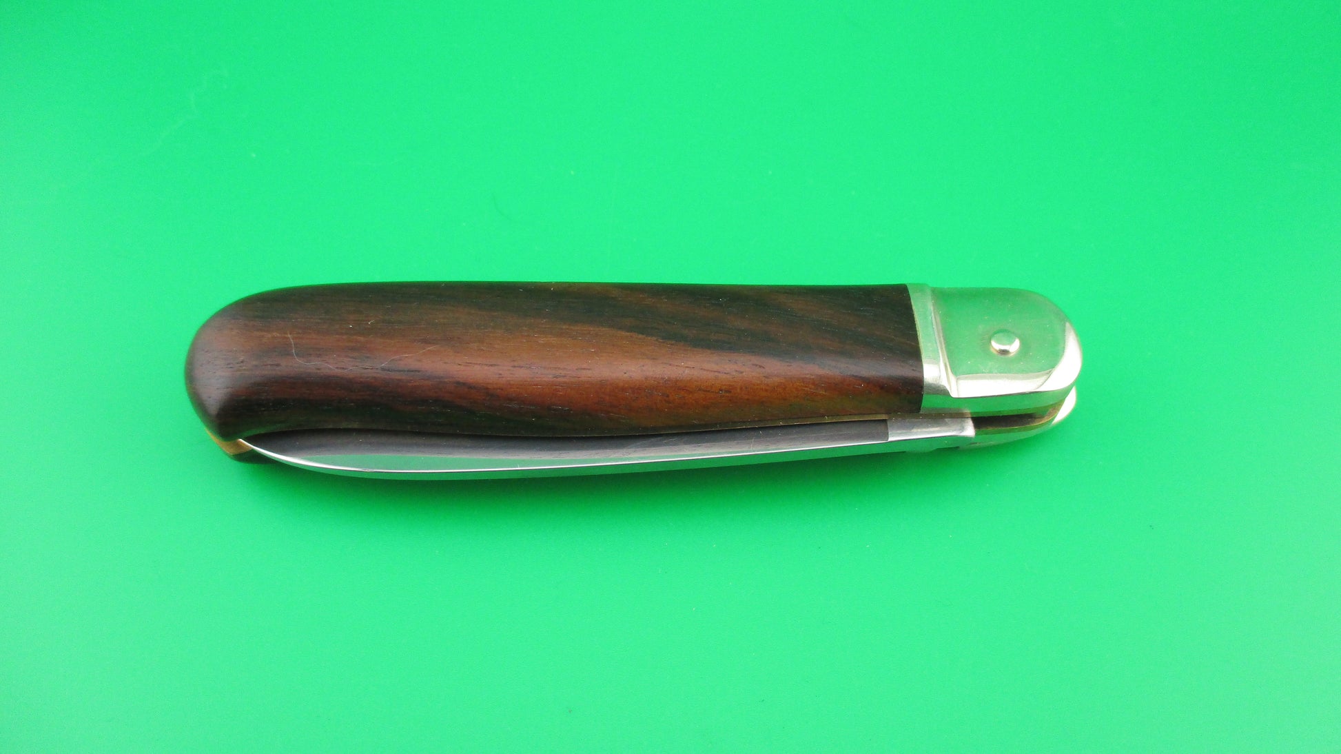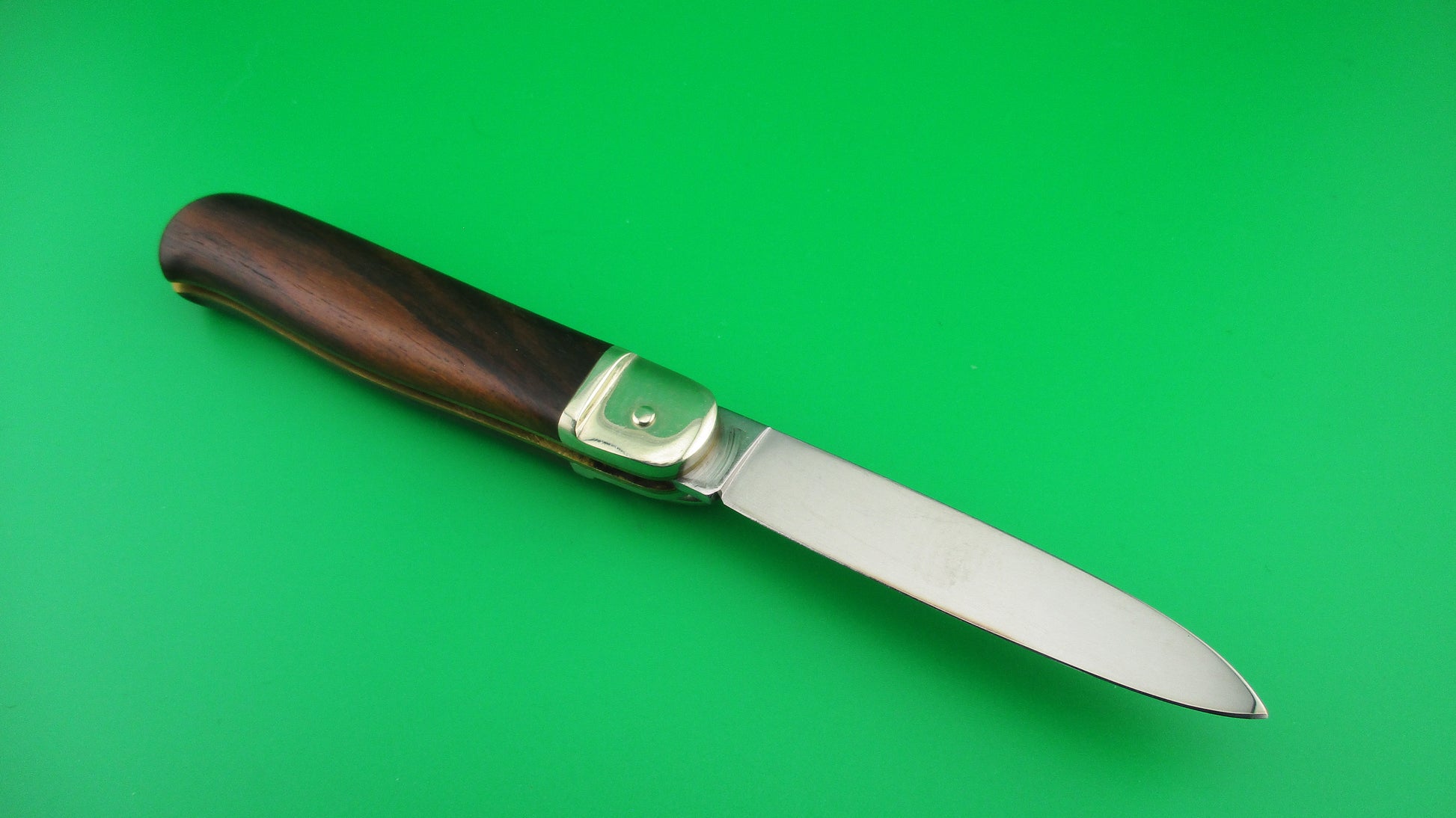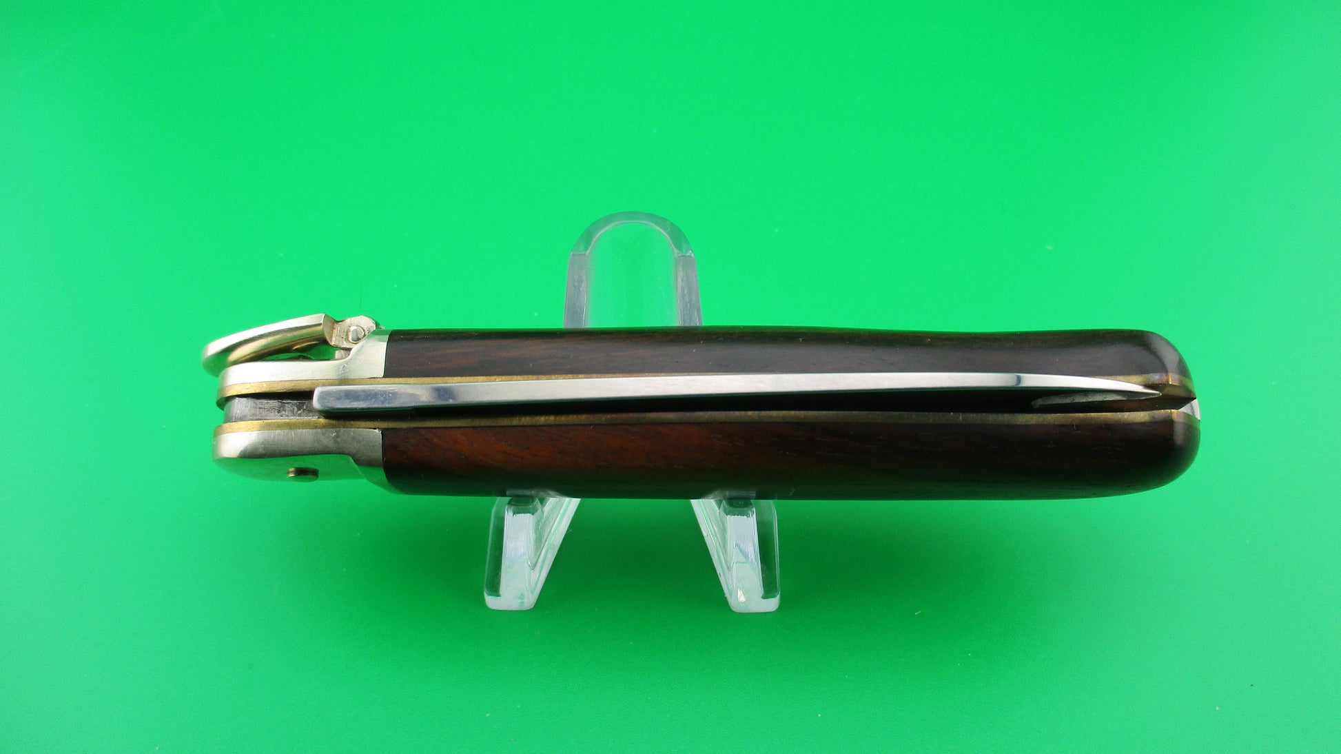 BOKER Tree Brand Classic 712 Lever knife made in Germany with wood scales and Mother of Pearl insert. This knife measures 11cm closed and 19.5cm (7.75 inches) open with brass liners and nickel silver bolsters & lever. The blade is 100% full with a strong etch. The tang is stamped BOKER SOLINGEN GERMANY STAINLESS with a picture of a Tree. The scales (handles) are wood with an oval Mother of Pearl insert. The knife works great with blade tip well below liners when closed, strong snap and Tight lockup open. Beautiful example of a German BOKER 712 Tree Brand lever knife. Nearly new condition.
