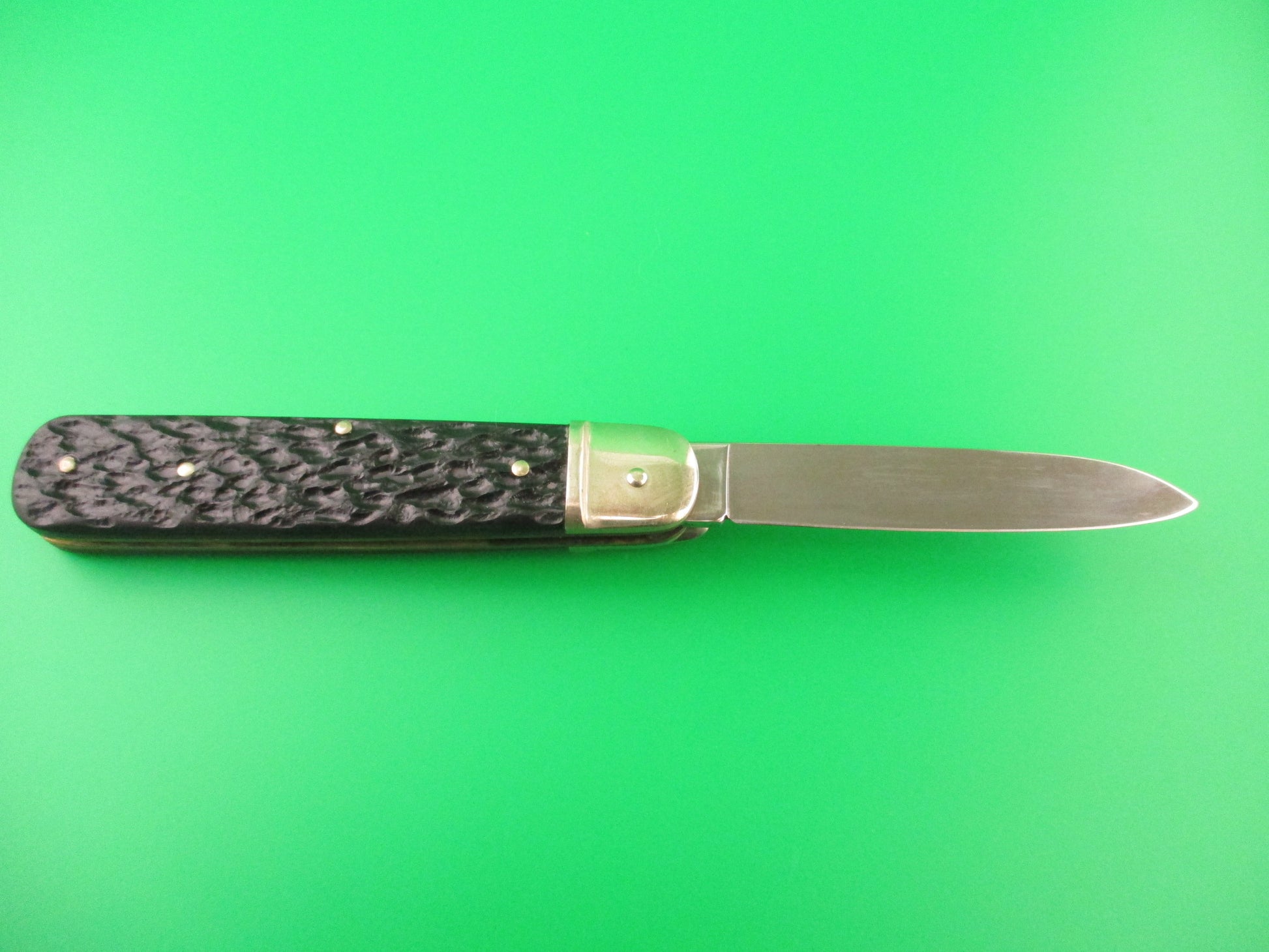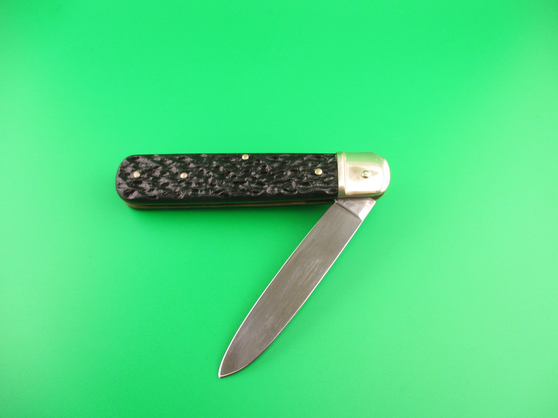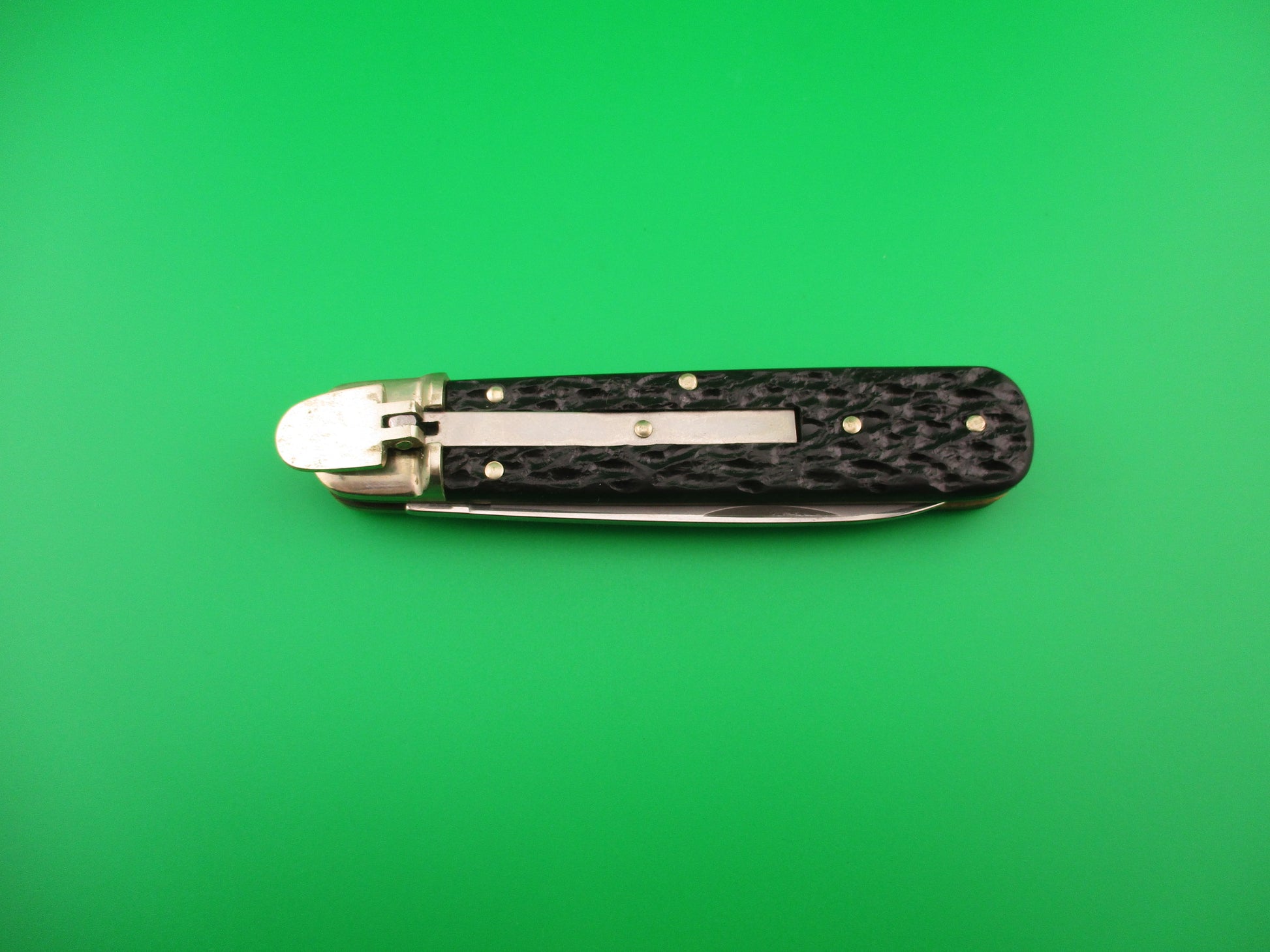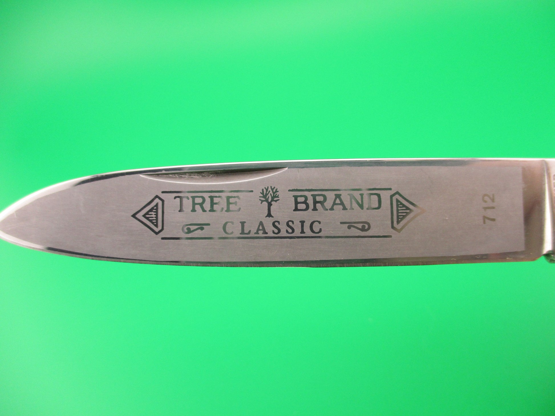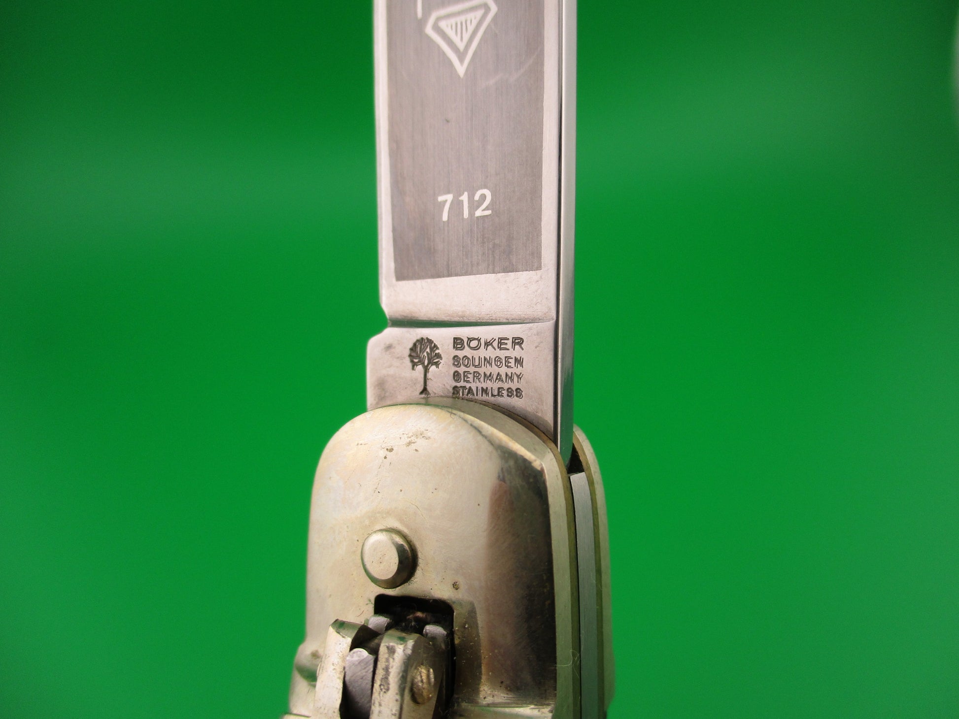 BOKER TREE BRAND CLASSIC 712 11cm German Lever automatic knife Black imitation stag scales (German automatics are generally referred to by length closed unlike Italian knives). The knife measures just over 11cm closed and 19.6cm (7.75 inches) open with brass liners and nickel silver bolsters and lever. The spear point blade is 100% full with original finish and etched TREE BRAND CLASSIC 712 and the tang is stamped BOKER SOLINGEN GERMANY STAINLESS with a picture of a tree. The synthetic imitation black stag scales are in like new condition. Knife works perfectly with blade tip deep and centered in the well closed, strong snap and TIGHT lockup! EX condition.