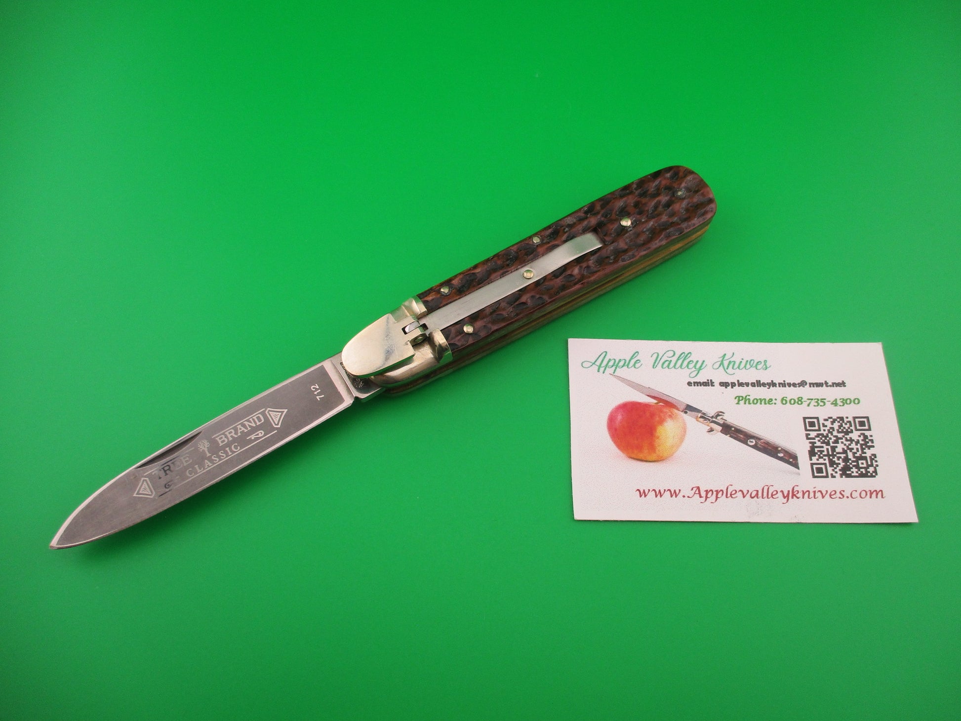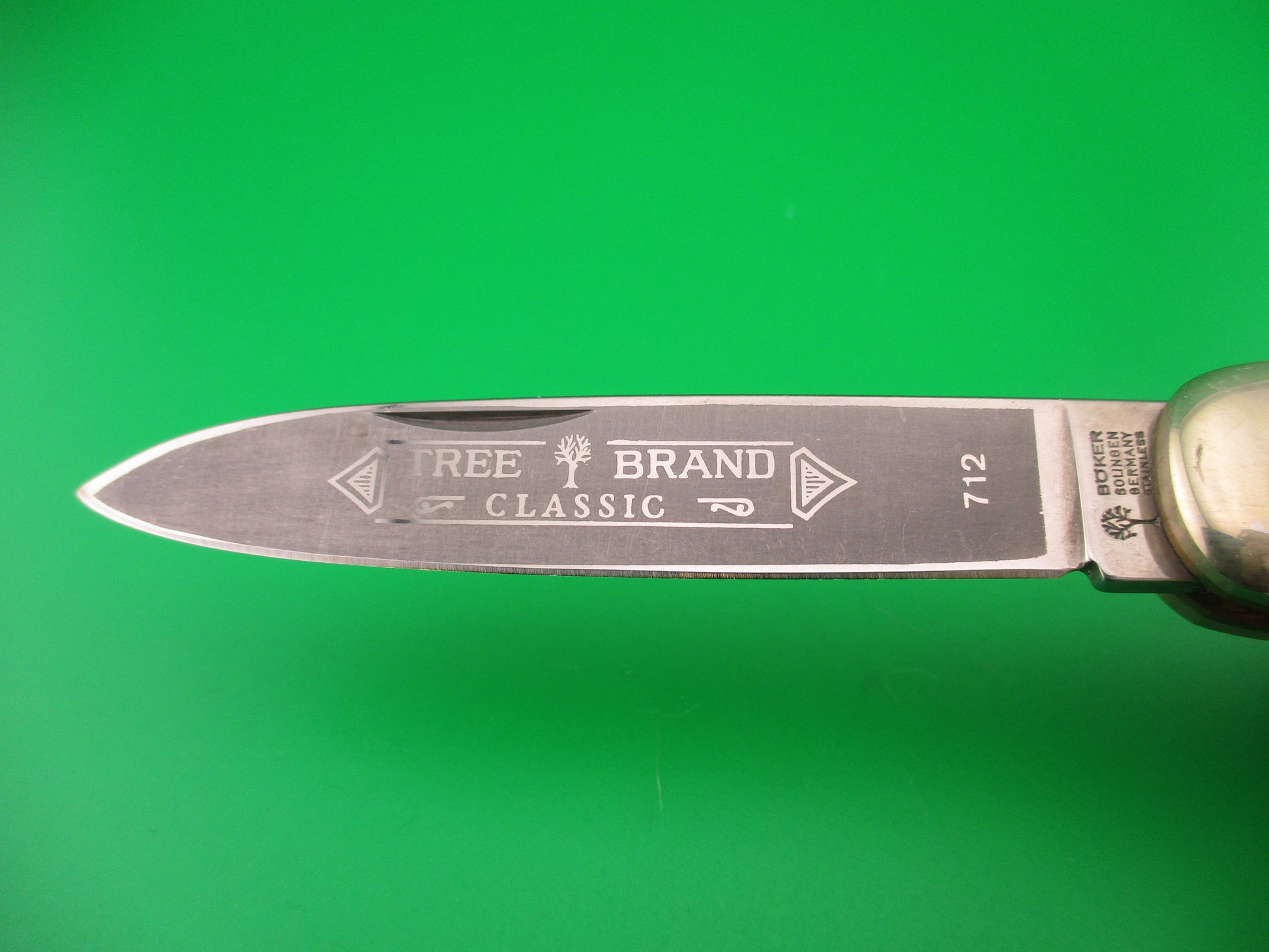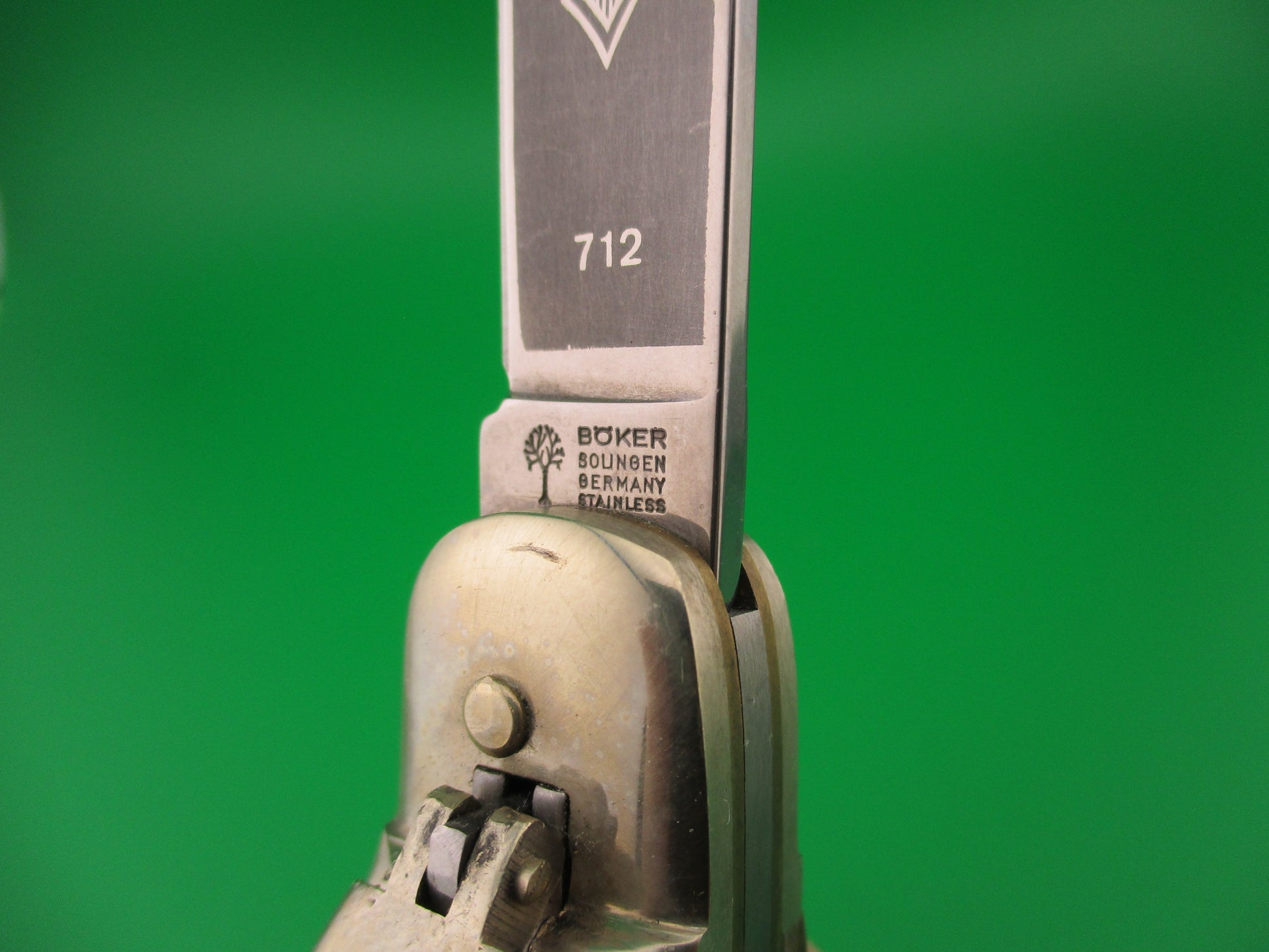 BOKER TREE BRAND CLASSIC 712 11cm German Lever automatic knife with dyed jigged bone scales (German automatics are generally referred to by length closed unlike Italian knives). The knife measures just over 11cm closed and 19.6cm (7.75 inches) open with brass liners and nickel silver bolsters and lever. The spear point blade is 100% full with original finish and etched TREE BRAND CLASSIC 712 and the tang is stamped BOKER SOLINGEN GERMANY STAINLESS with a picture of a tree. The dyed jigged bone scales are super nice condition. Knife works perfectly with blade tip deep in the well closed, strong snap and TIGHT lockup! EX+ condition.