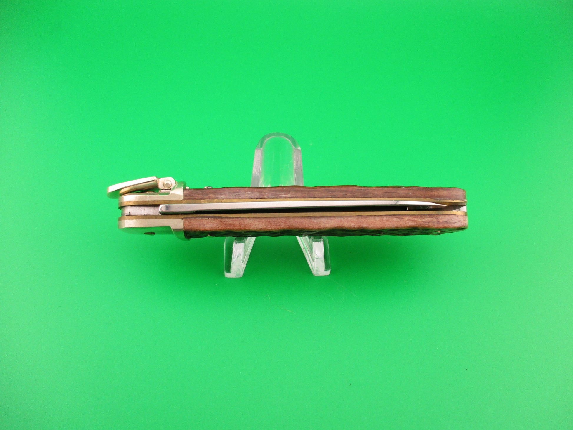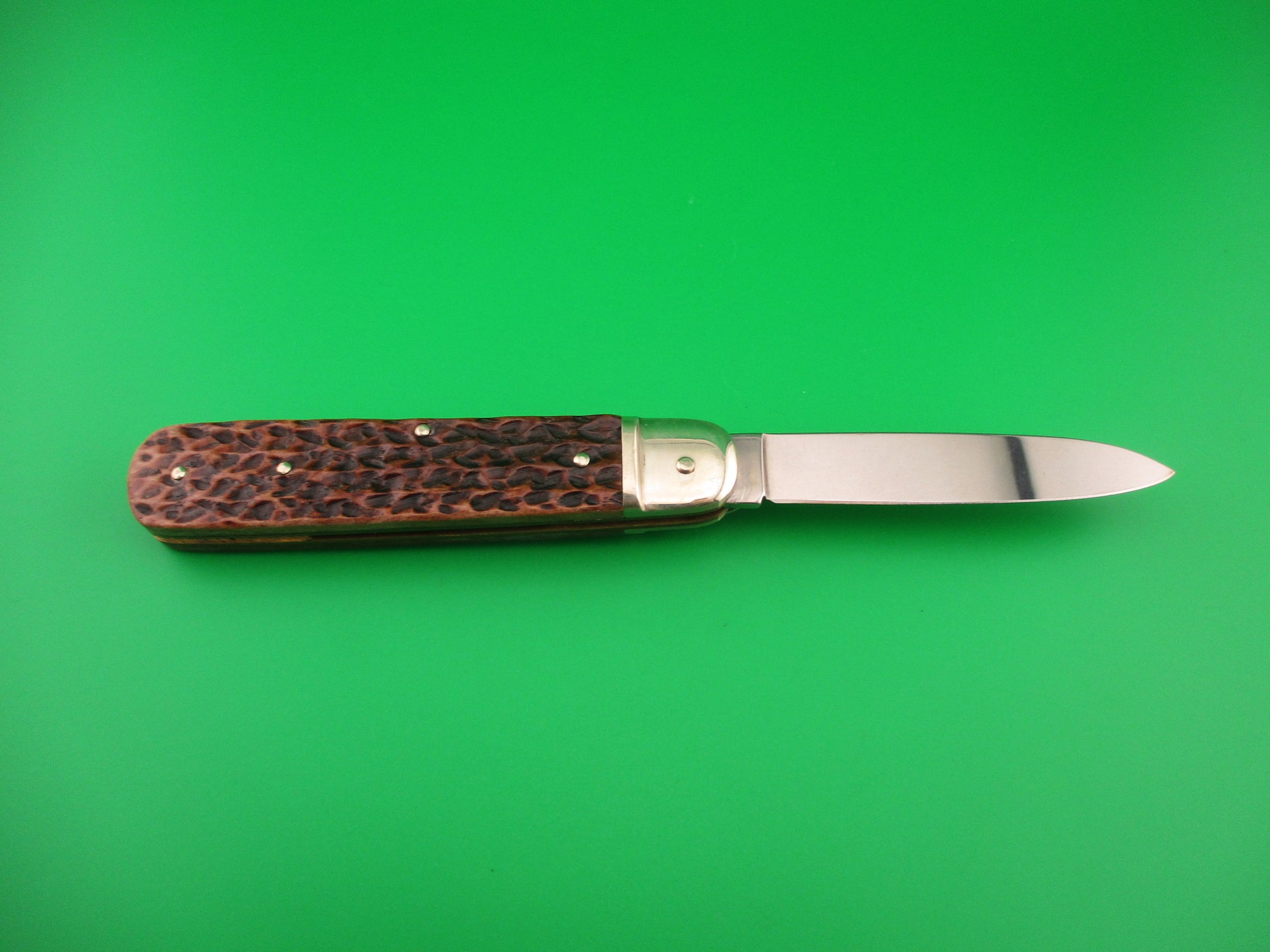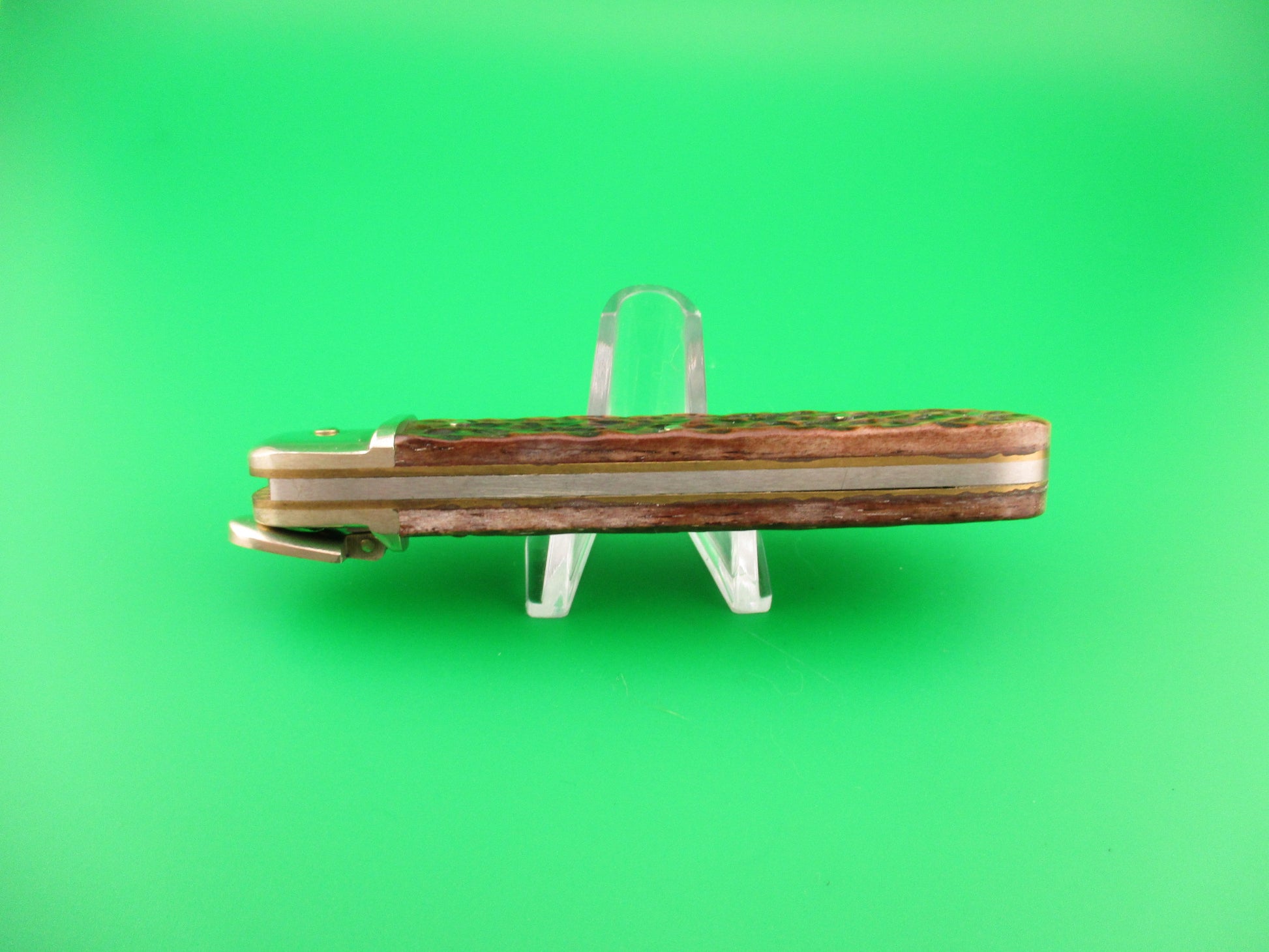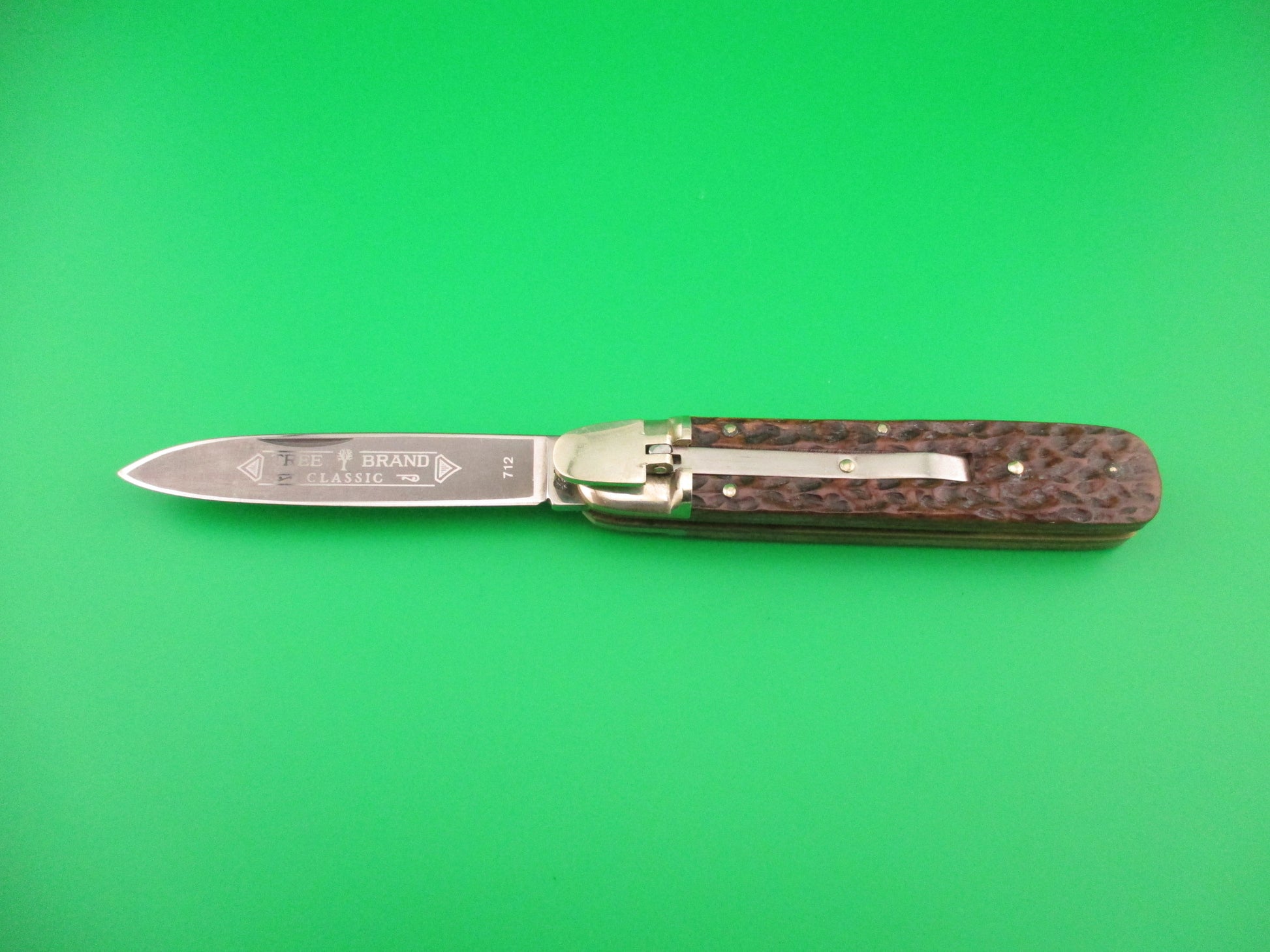 BOKER TREE BRAND CLASSIC 712 11cm German Lever automatic knife with dyed jigged bone scales (German automatics are generally referred to by length closed unlike Italian knives). The knife measures just over 11cm closed and 19.6cm (7.75 inches) open with brass liners and nickel silver bolsters and lever. The spear point blade is 100% full with original finish and etched TREE BRAND CLASSIC 712 and the tang is stamped BOKER SOLINGEN GERMANY STAINLESS with a picture of a tree. The dyed jigged bone scales are super nice condition. Knife works perfectly with blade tip deep in the well closed, strong snap and TIGHT lockup! EX+ condition.