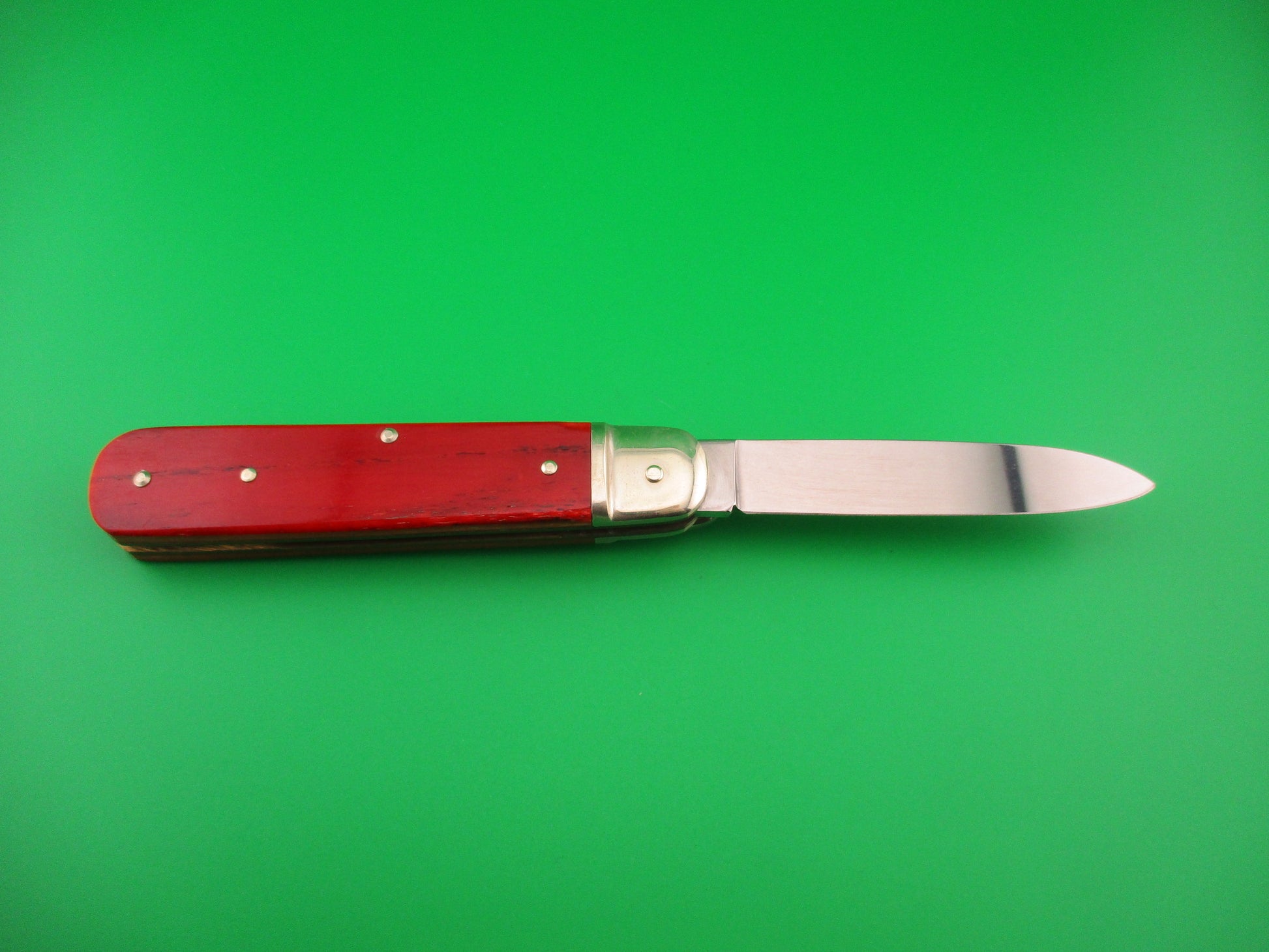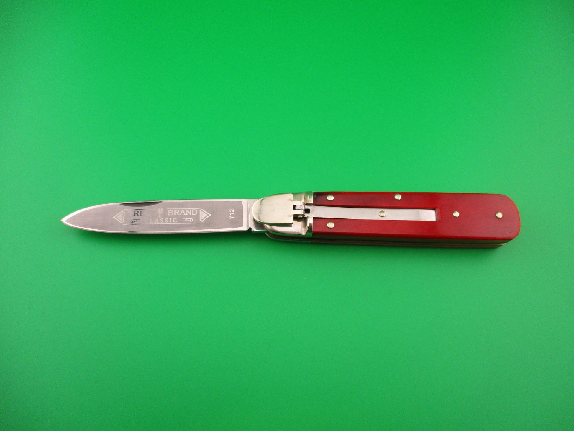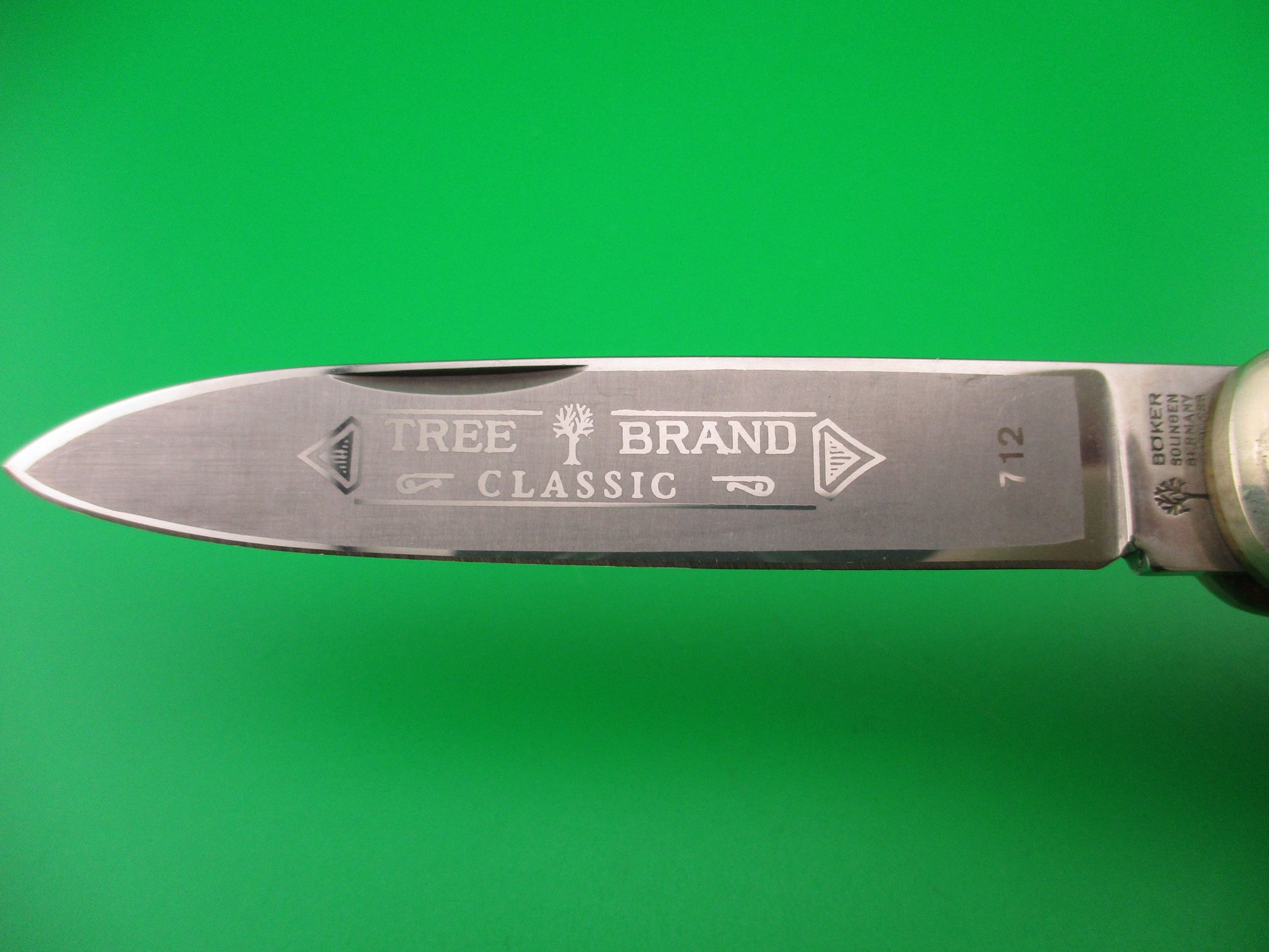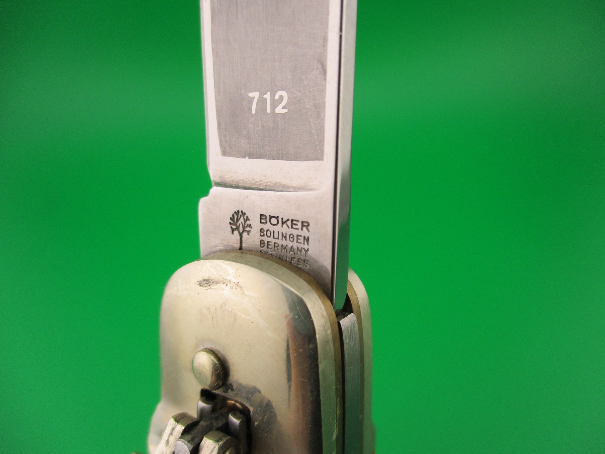 BOKER TREE BRAND CLASSIC 712 11cm German Lever automatic knife Red dyed smooth bone scales. German automatics are generally referred to by length closed unlike Italian knives so this is an 11cm knife. The knife measures just over 11cm closed and 19.6cm (7.75 inches) open with brass liners and nickel silver bolsters, lever & pins. The spear point blade is 100% full with original finish and clearly etched TREE BRAND CLASSIC 712 and the tang is stamped BOKER SOLINGEN GERMANY STAINLESS with a picture of a tree. The bone scales are dyed red and in excellent condition. Knife works perfectly with blade tip deep and centered in the well closed, strong snap and excellent lockup! EX+ condition.