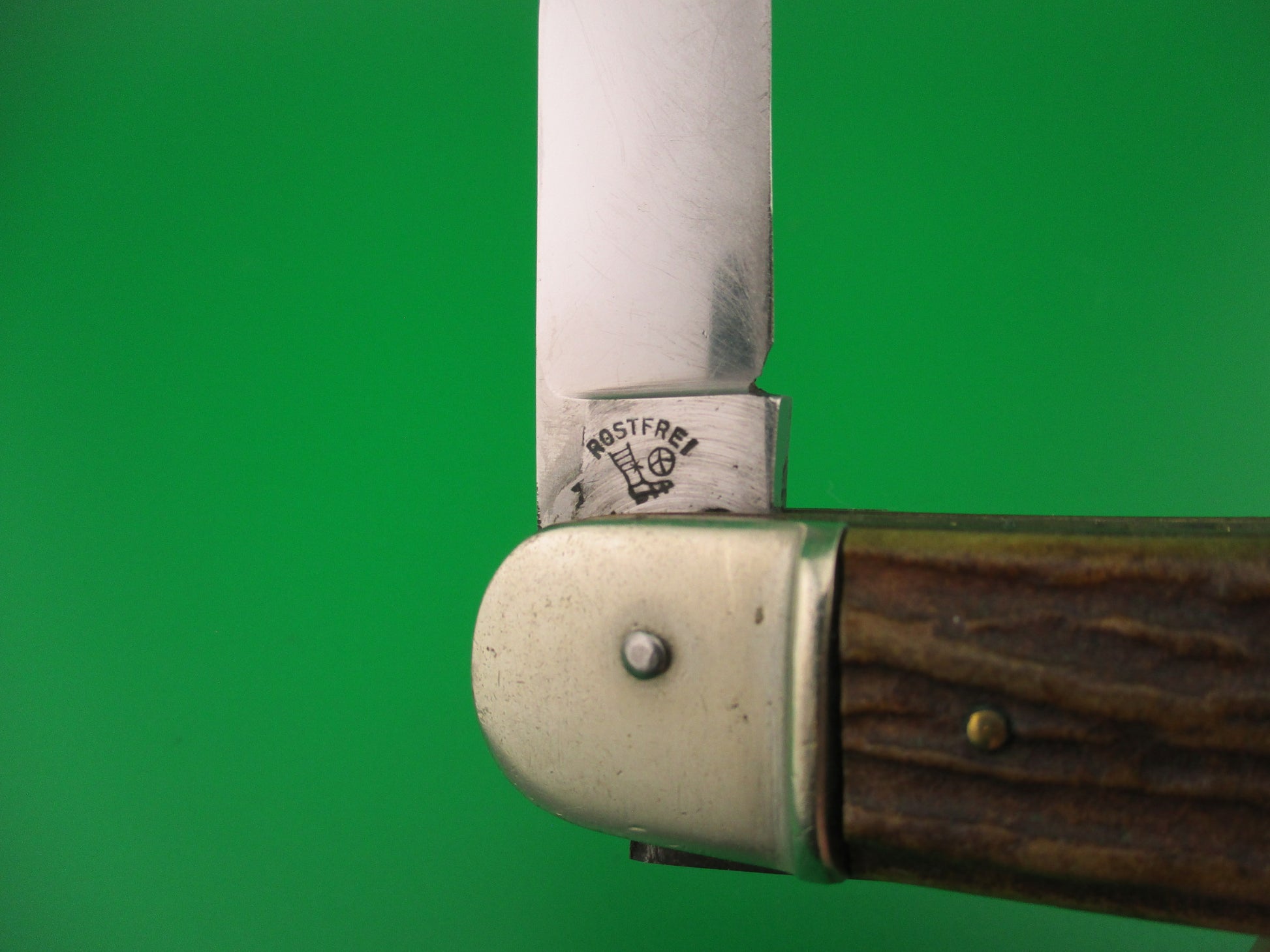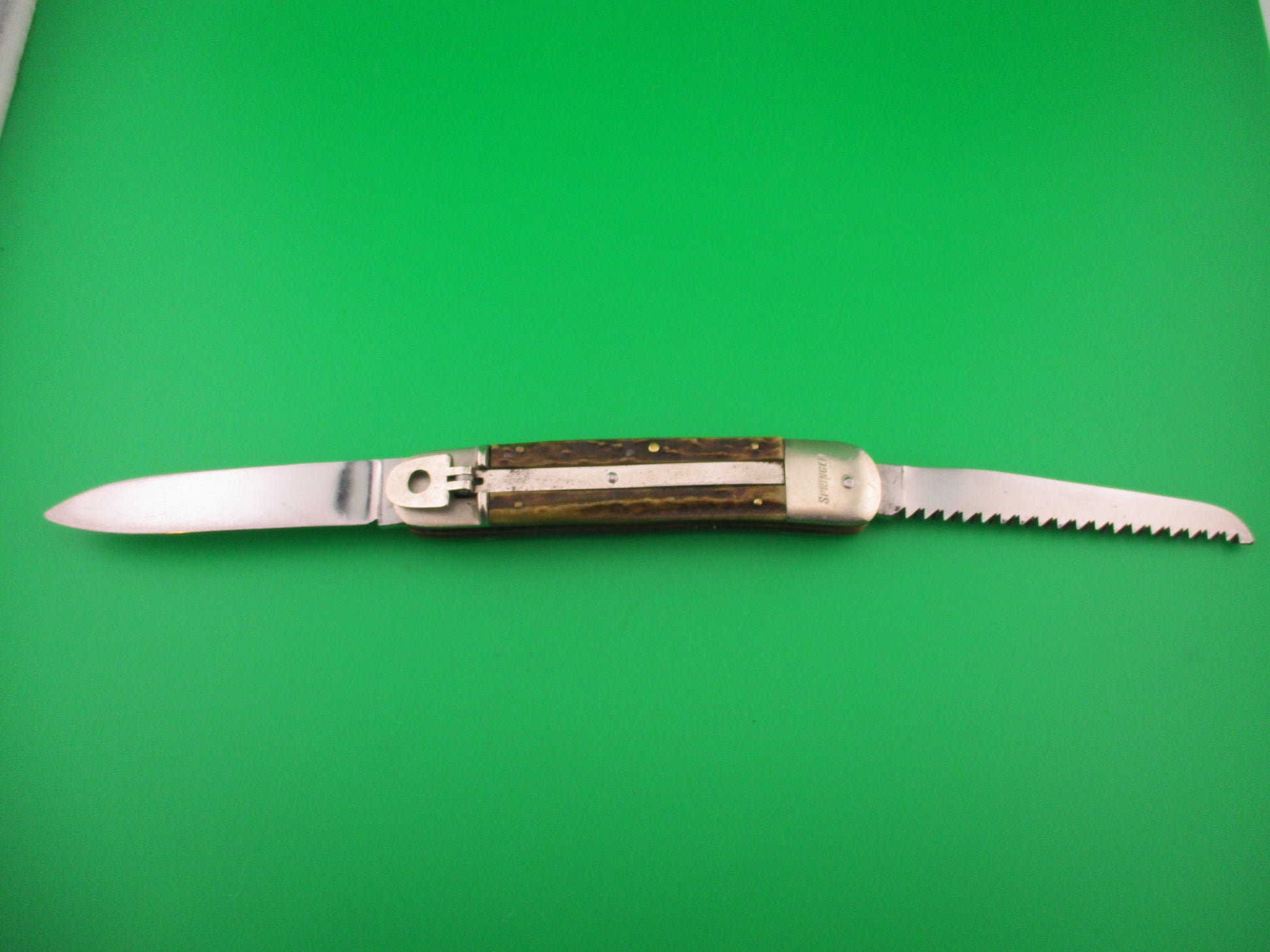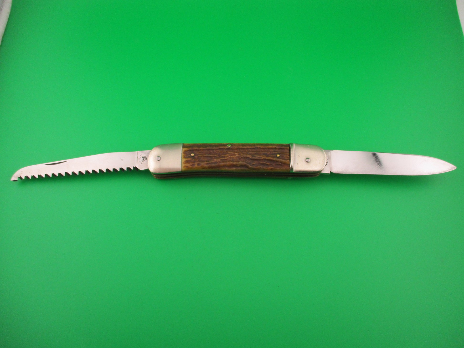 Bonsa SOLINGEN GERMANY 11cm German Stag Lever Camper 2 Blade automatic knife made in Germany likely in the 1960s or 70s. These German automatics are usually referred to by the length closed in cm, as opposed to most other European knives referenced by length open in cm. This one measures 11.4cm (4.5 inches) closed and 19.7 (7.75 inches) with automatic blade open with brass liners and nickel (German) silver bolsters & lever. The spear point blade is 99% full with original finish and lots of light scratches and the tang is stamped Bonsa SOLINGEN GERMANY and the reverse is stamped ROSTFREI over a leg kicking a soccer ball. The SAW blade also has the leg kicking a soccer ball stamped on the back of the tang and the blade is full, sharp and in wonderful condition. The stag scales (handles) are in excellent condition. Bottom bolster is stamped SPRINGER. The knife works great with blade tip slightly above the liners closed, strong snap and excellent lockup open. Saw blade walks & talks. VG+ condition.