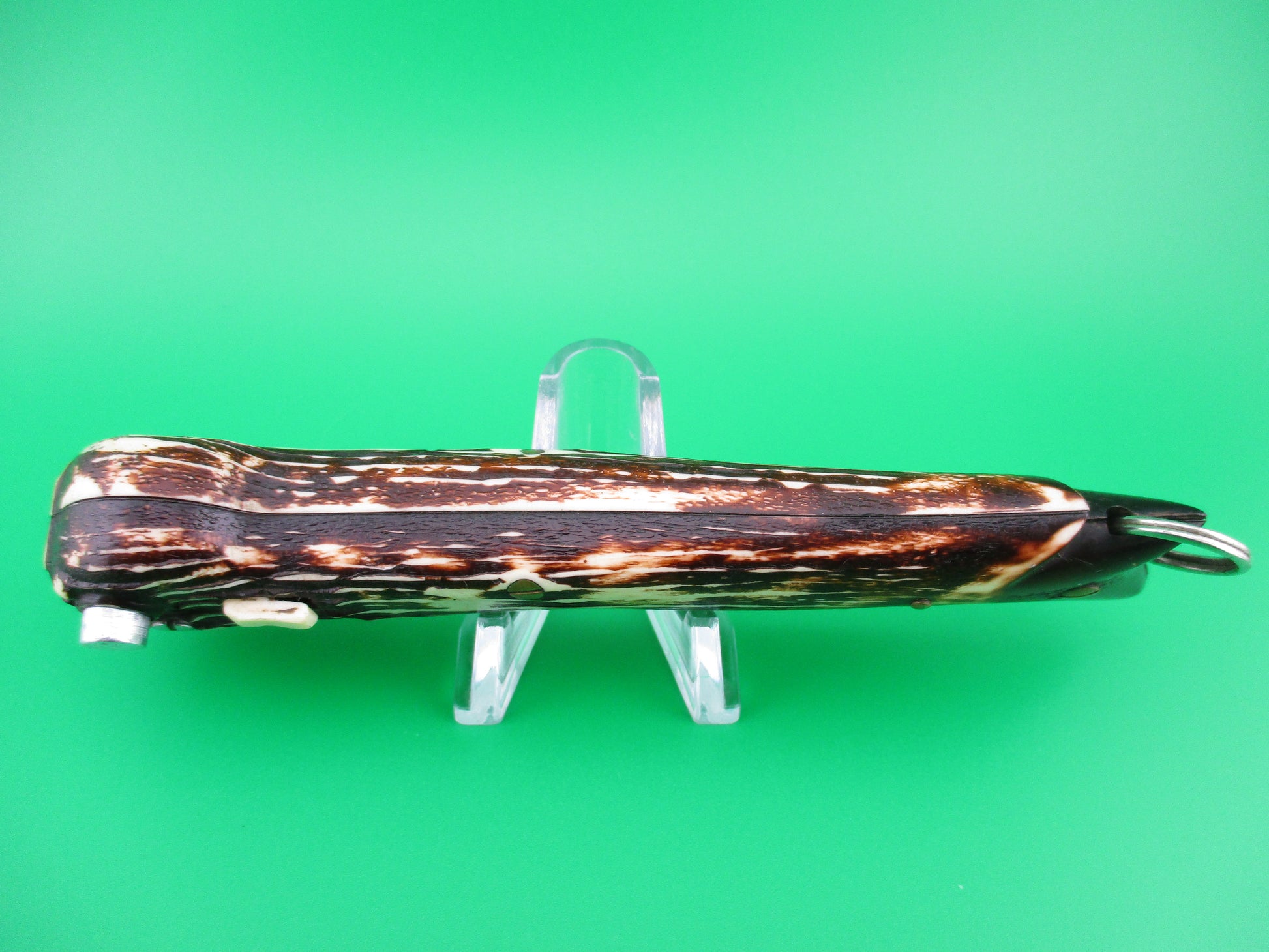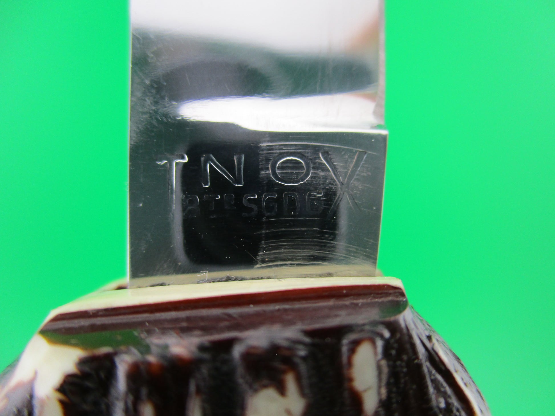 Vintage Brevete SMASH INOX 25cm French Faux stag hoof knife switchblade. Measures 24.5cm (9 5/8 inches) open with no visible liners. Blade is full with original factory finish and is marked SMASH with a picture of a tennis racket on the face of the blade and rear ricasso is marked INOX over BTE SGDG which stands for Brevette Sans Garantie du Governement. The Faux stag scales are in great condition with good color. Works great with blade tip deep in the well, Strong snap and TIGHT lockup open. Safety works. EX++ condition.