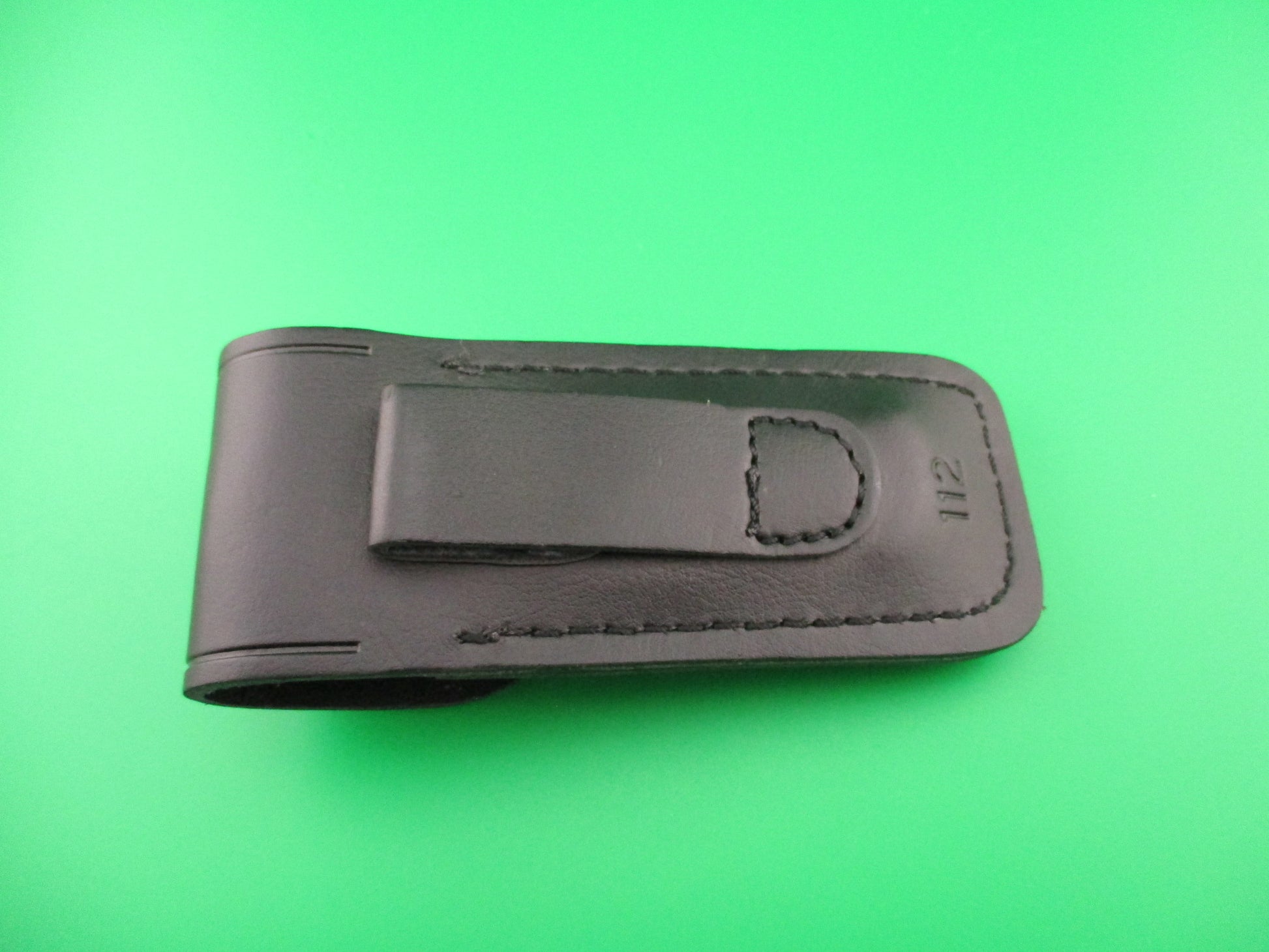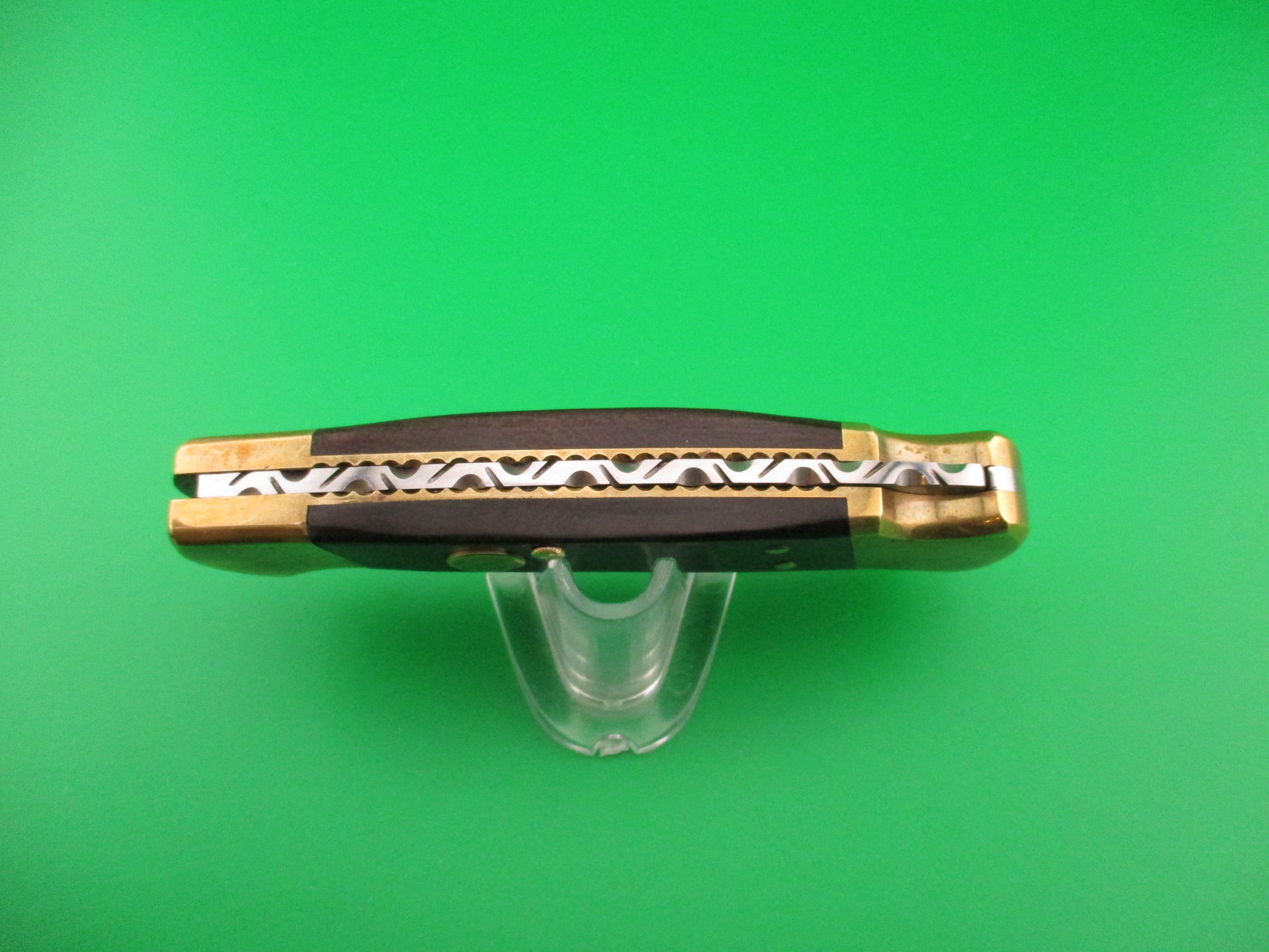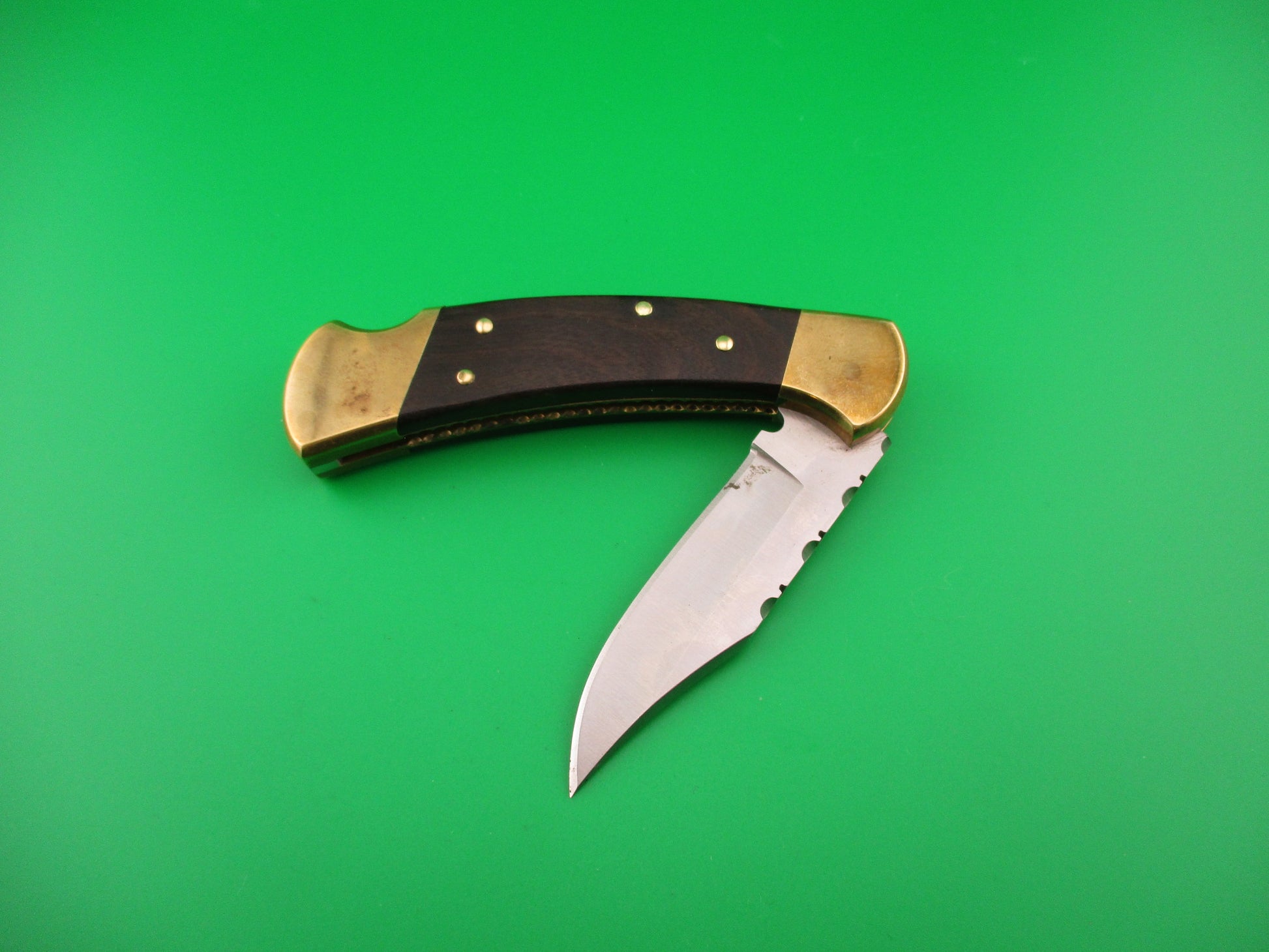 BUCK 112 Converted Automatic Double Action knife w file work & sheath made in America and likely converted in the 1990s. The knife measures 4.25 inches closed 7 3/16 inches open with brass liners, bolsters, button and pins. The clip saber blade is 100% full with original finish with a nail nick and filework on the spine and the tang is stamped BUCK 112 USA. The handles are dark wood and the liners and backspring have decorative file work. The knife works well with blade deep and centered closed, good snap and TIGHT lockup open! This is a double action knife so I can also be opened manually with your fingers. Button is a little hard to press, but works nicely. EX+ condition.
