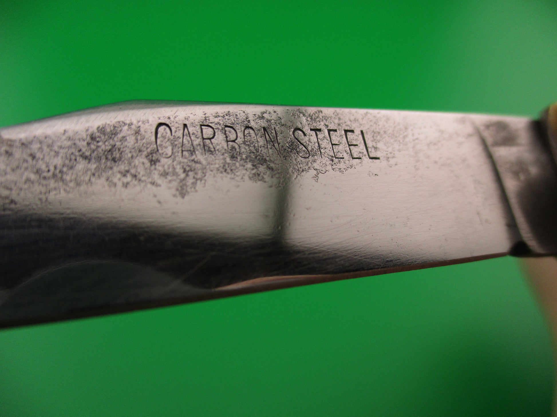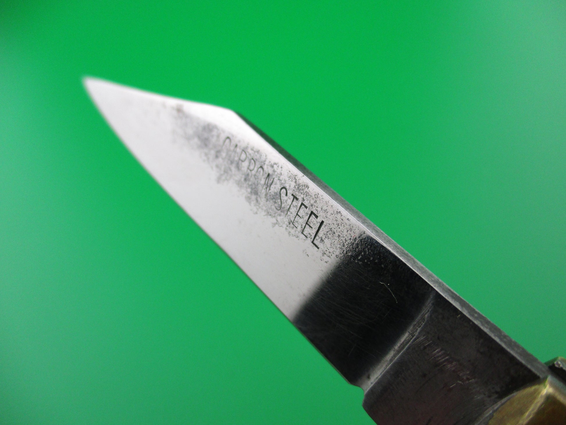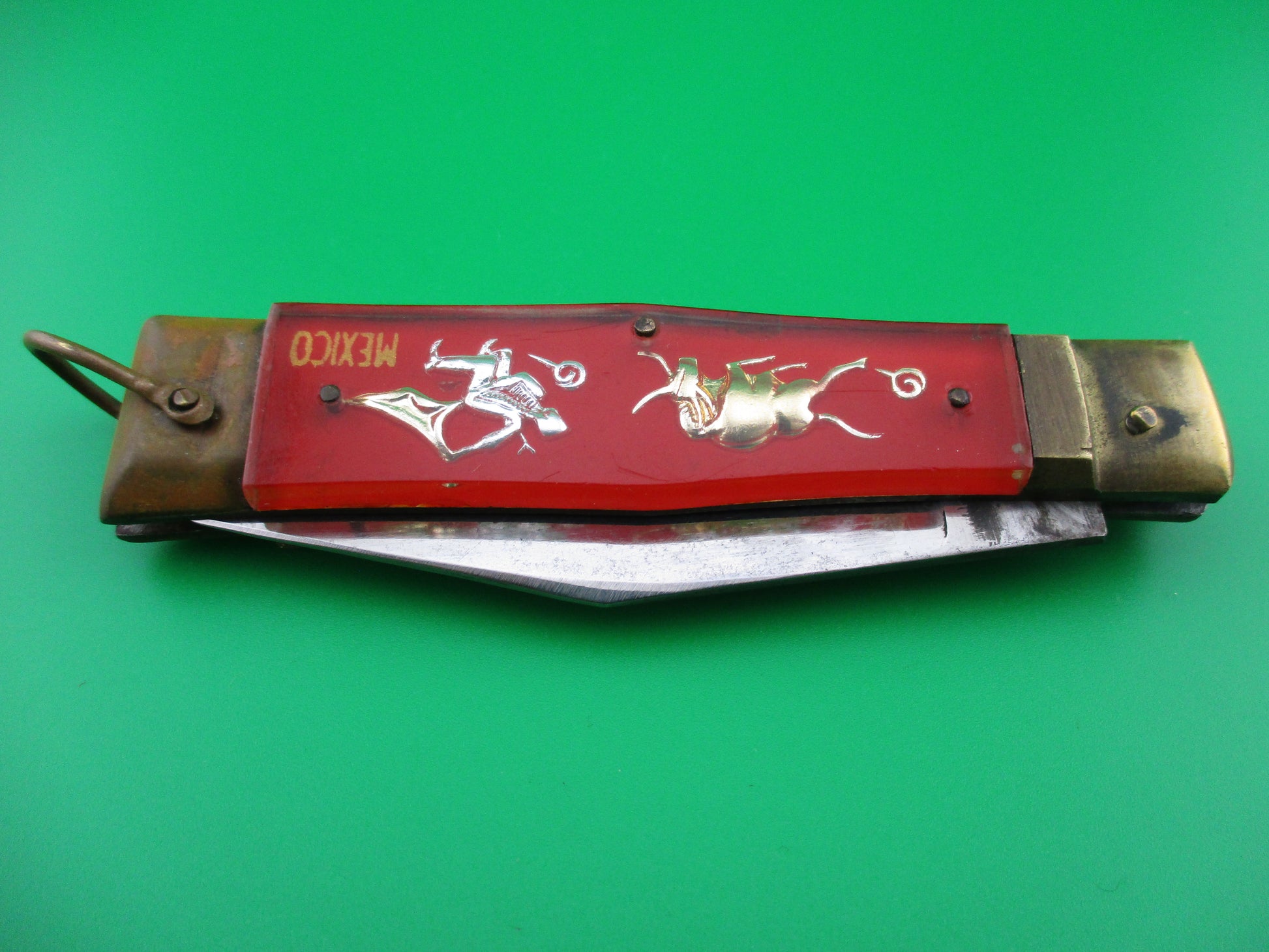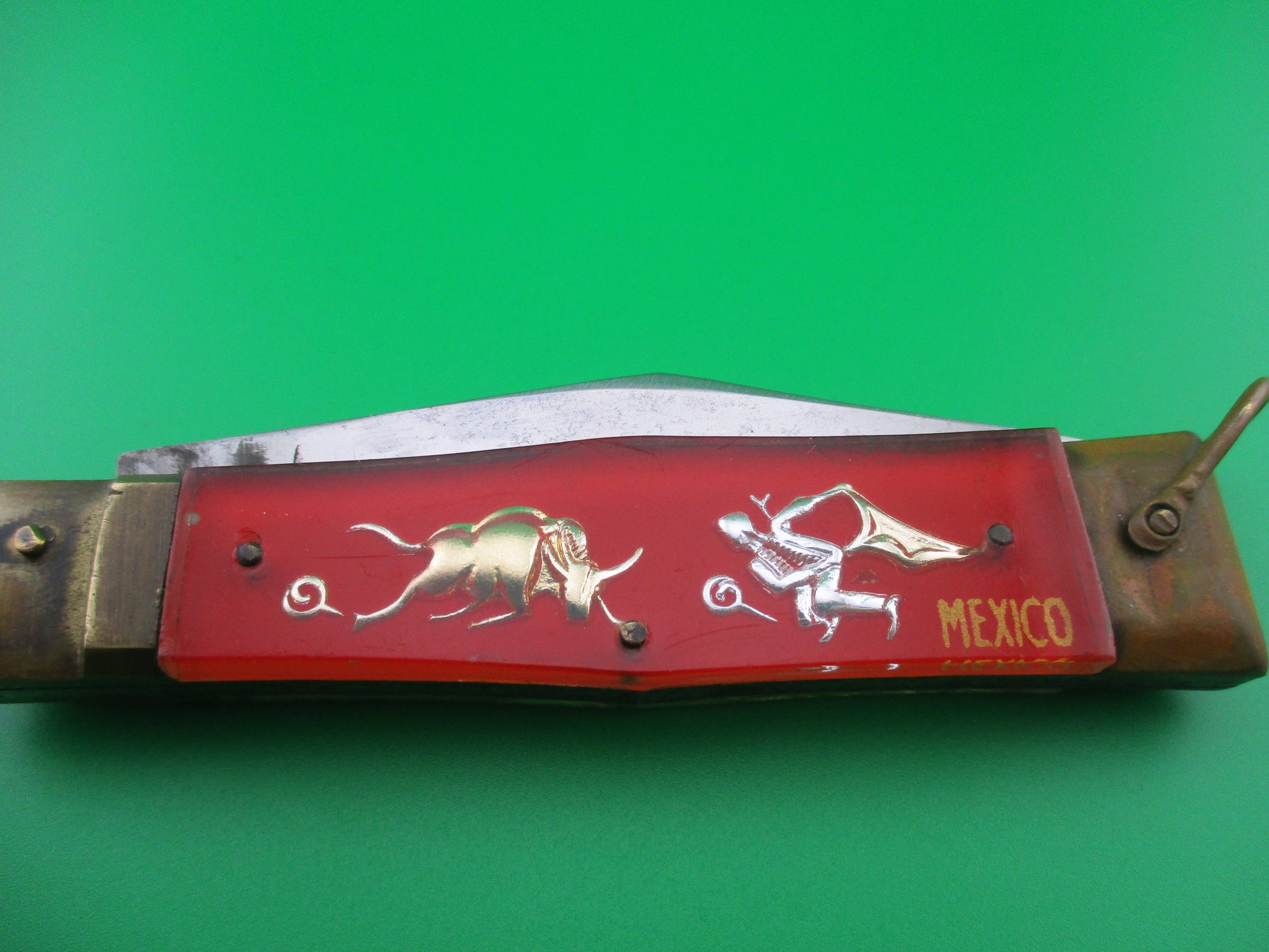 This is a Bullfighter lever knife made in Japan for the Mexican tourist trade between the late 1950s and into the 1970s. These were very popular with tourists and were made in three different sizes with different blade shapes, different colors and some variations on the scenes. A lot of fun to collect. This knife is the most common size measuring 19cm (7.25 inches) open with steel liners and brass bolsters, lever and lanyard ring. Red background with gold dragon on the front and bullfighter/ Matador scene on the back. The flat grind clip blade is shiny, approximately 94% full & is marked CARBON STEEL. The knife works well with the blade even with the liner closed, opens strong and locks up tight. Overall a nice example of a very cool vintage red Mexican souvenir automatic lever knife.