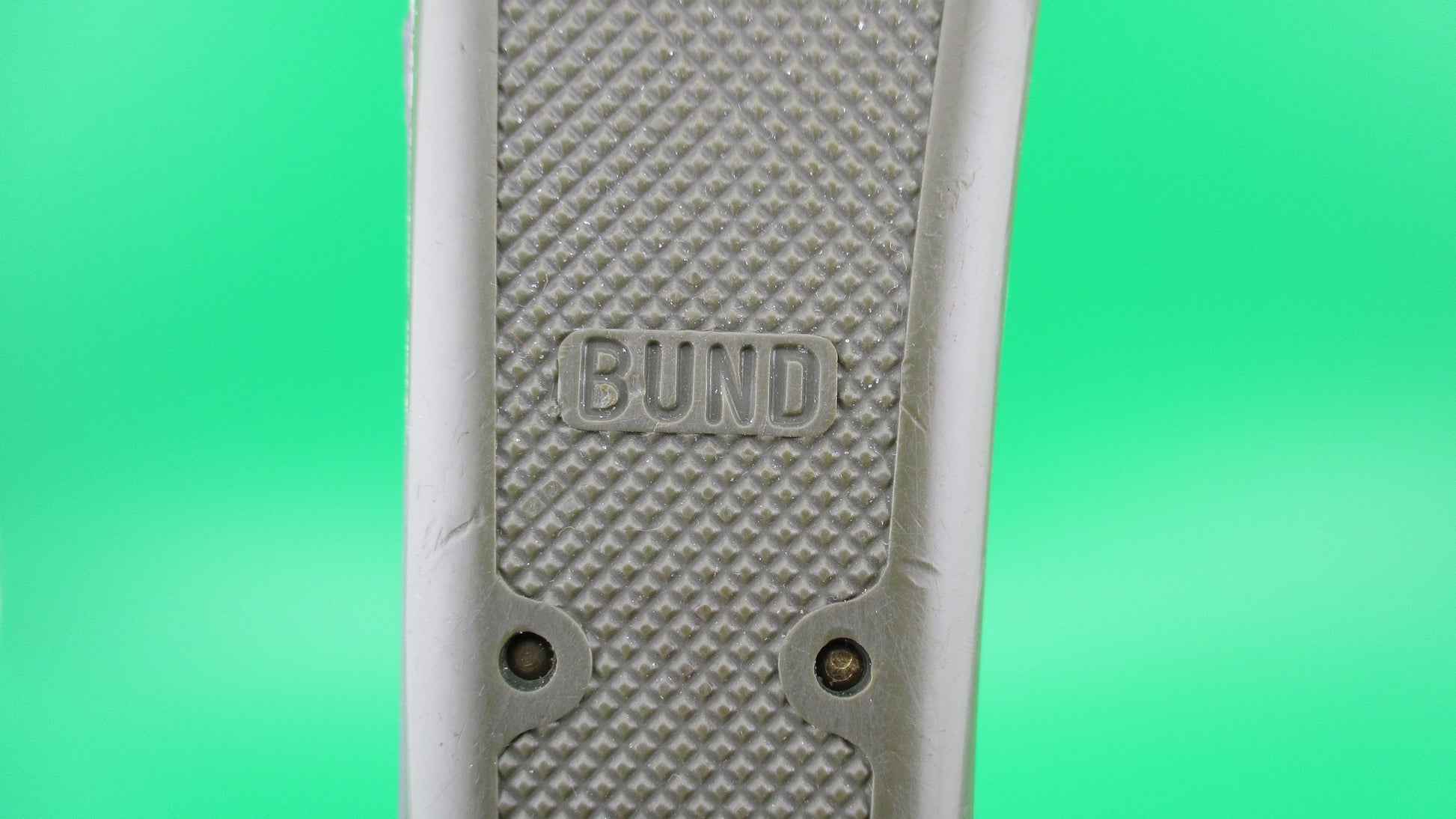 Vintage BUND 26cm German Military style Take-down Gravity knife Green with lanyard ring. The knife measures 25.5cm (10 inches) open with steel liners, bolsters, lever and lanyard ring. The flat grind spear point blade appears to be nearly full with scratches and a little loss from sharpening. Appears to be a picture of a SQUIRREL etched on the blade over SOLINGEN, but hard to make out. The green checkered scales are in good condition with what appears to be a couple of "notches" by the lanyard ring. You can quickly break the knife open to clean/service by pressing the button under the top front bolster. The knife works perfectly. VG+ condition.