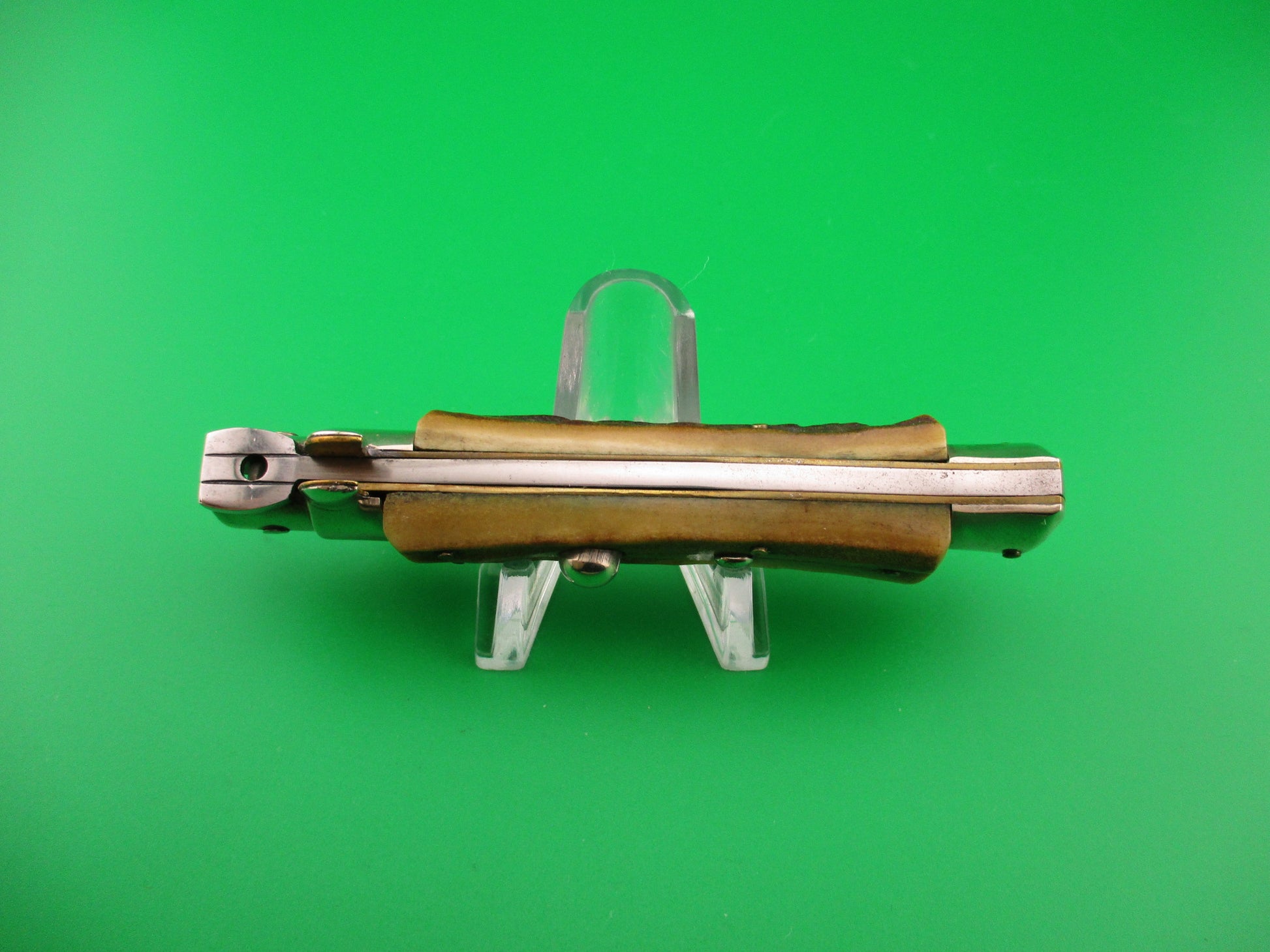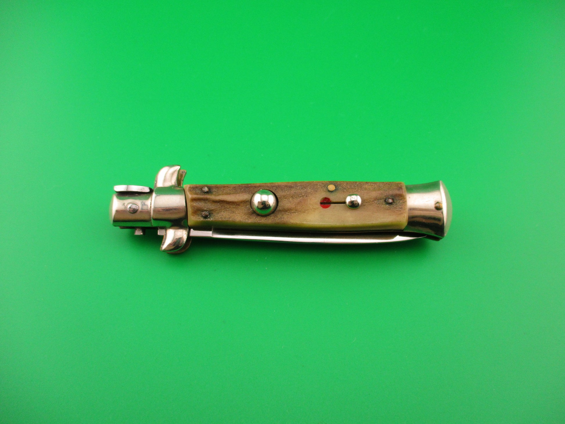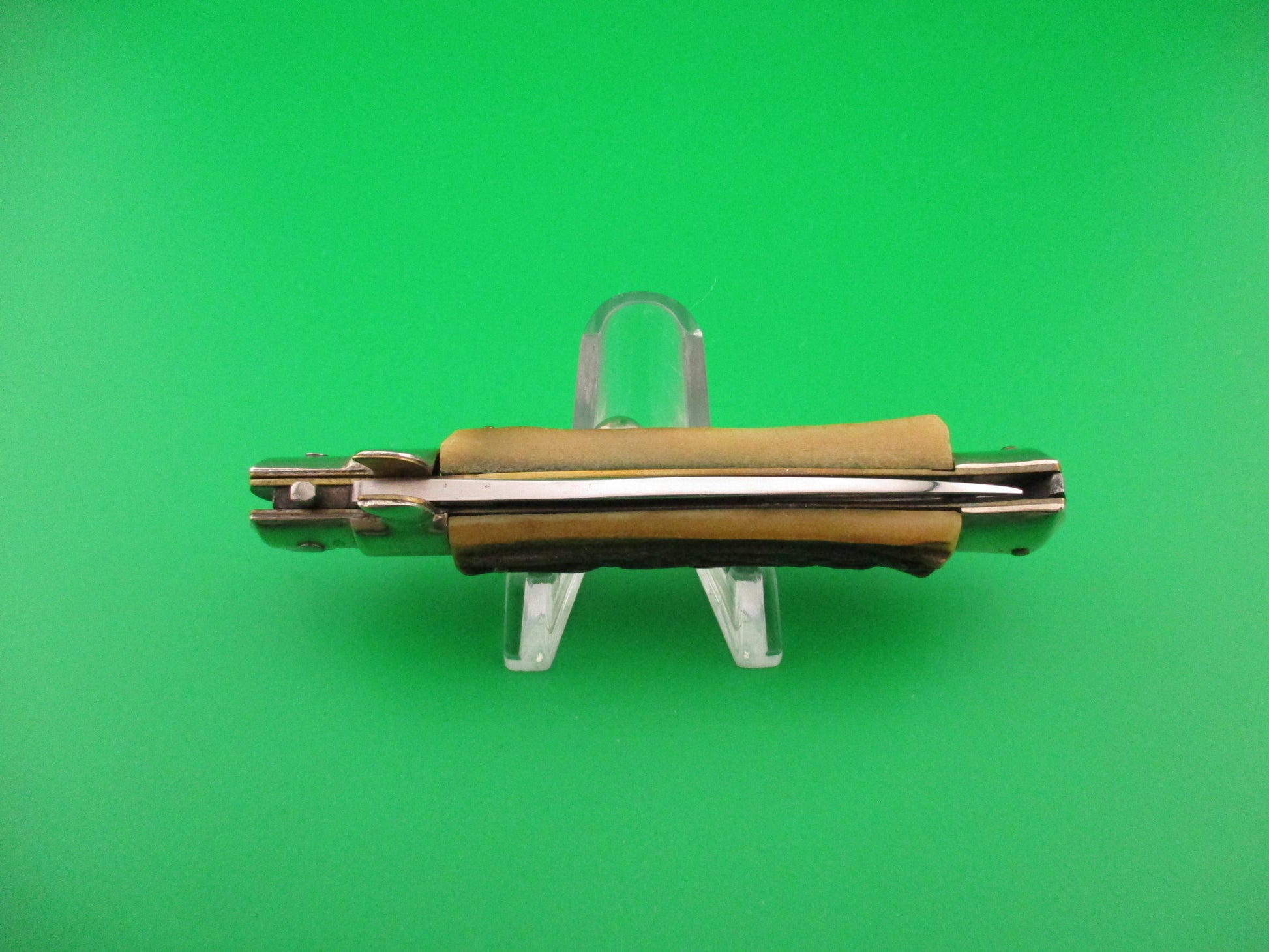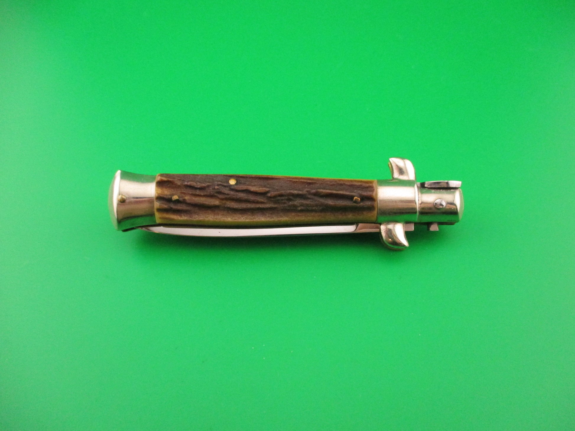 Vintage C JUL HERBERT ROSTFREI 18cm Italian Stag Transitional Swivel bolster switchblade knife most likely made in the 1960s or early 70s in Italy. This knife measures 17.7cm (6 15/16 inches) open and 3 7/8 inches closed with non D Stamped brass liners, nickel silver bolsters, button & safety cap. The flat grind blade is 99% full and shiny with a few light scratches and the ricasso is stamped C JUL HERBERT ROSTFREI and the reverse is stamped with a l. This is a slightly different stamp than most of these that you see and unusual that the liner isn't D Stamped. Genuine stag scales have character and are in excellent condition with no cracks and Red Dot safety. Knife works well with blade tip seated below the liners closed, strong snap and excellent lockup with just a hint of movement at the tip. Does not rattle if shaken with blade open. Swivel bolster so you push down on right front finger guard to pivot (swivel) the bolster to release the blade so it can be closed. Safety works. EX condition