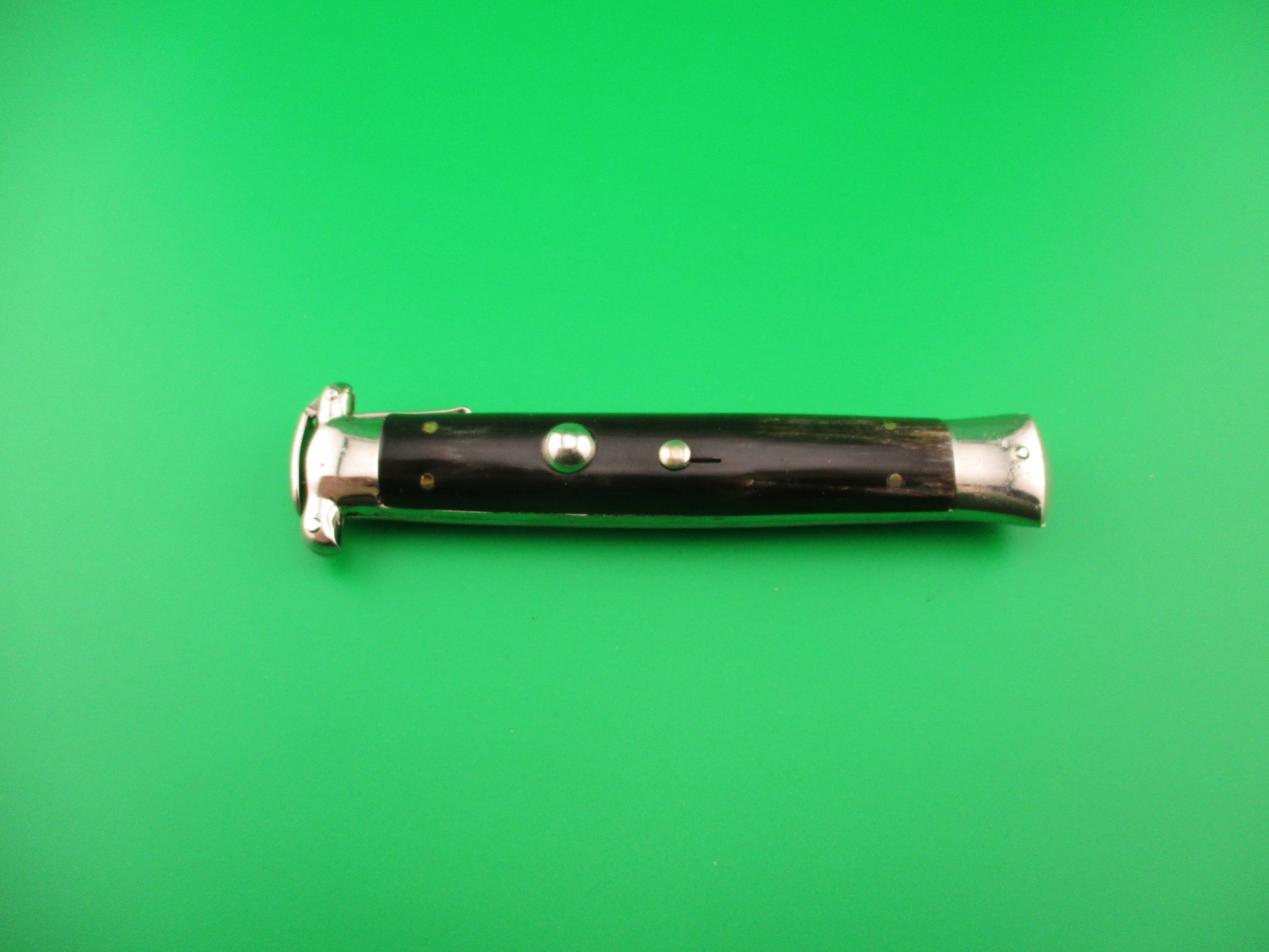 Vintage New Old Stock 1960s C Jul Herbertz 21cm Italian trapdoor switchblade knife. The knife measures 21.2cm (8.25 inches) open and 4.75 inches closed with nickel silver plated brass bolsters, button and safety cap. The flat swedge grind blade is 100% full with original finish and some light scratches and it stamped C JUL HERBERTZ over IMPORT on the ricasso and the backside is stamped PATENT ROSTFREI. The genuine horn scales are in great condition and mostly black with just a few tiny streaks of brown with red dot safety. The knife functions great with the blade opening fully when the button is pressed. Press the button again to release the blade from locked open position to be closed and cocked into firing position with the hinged trapdoor. Red dot safety works. EX+ condition.