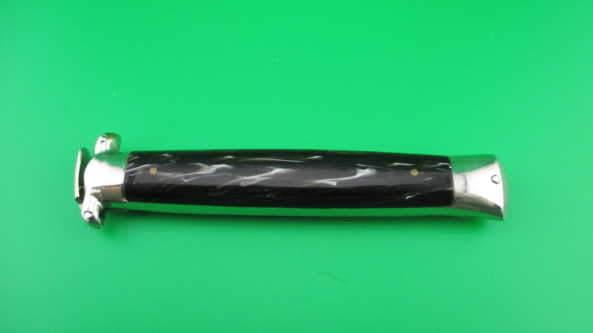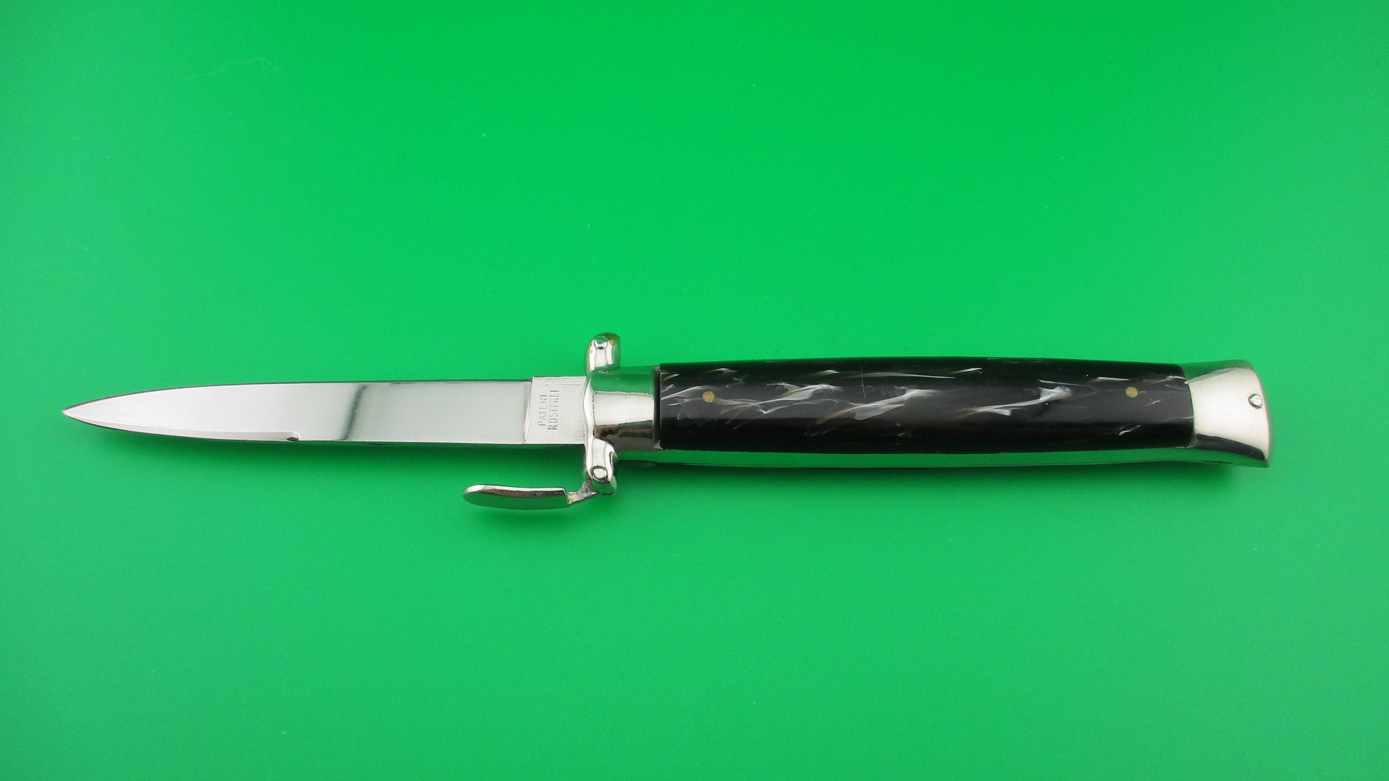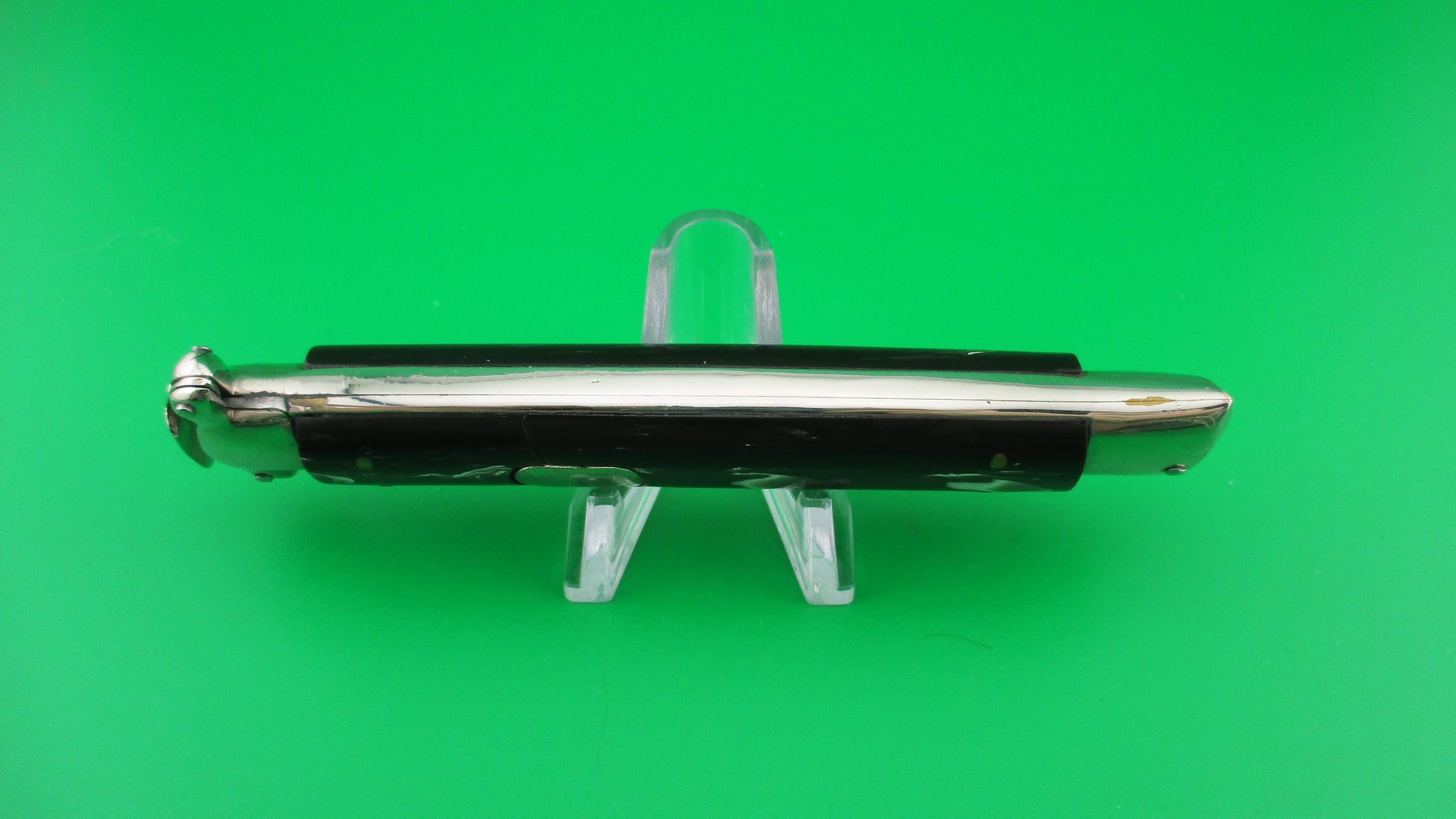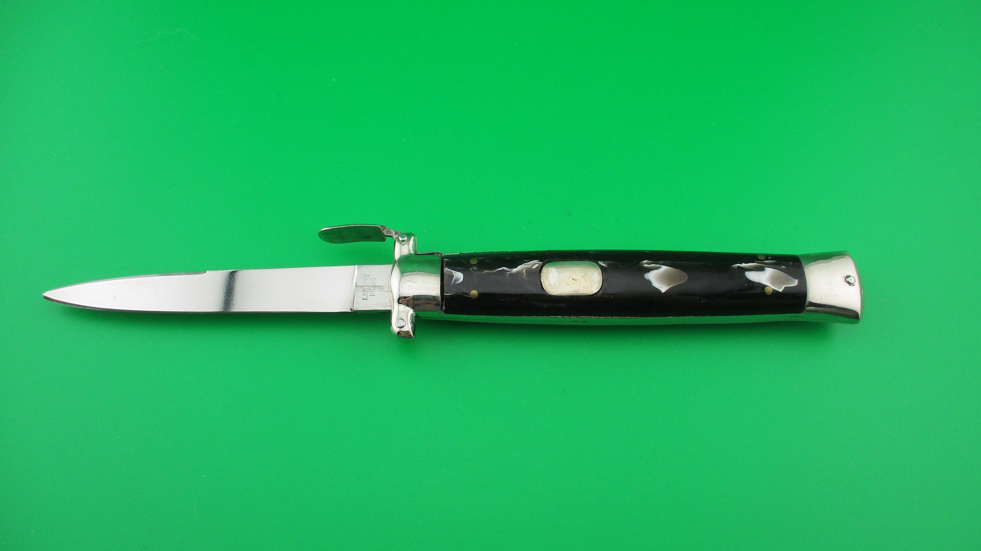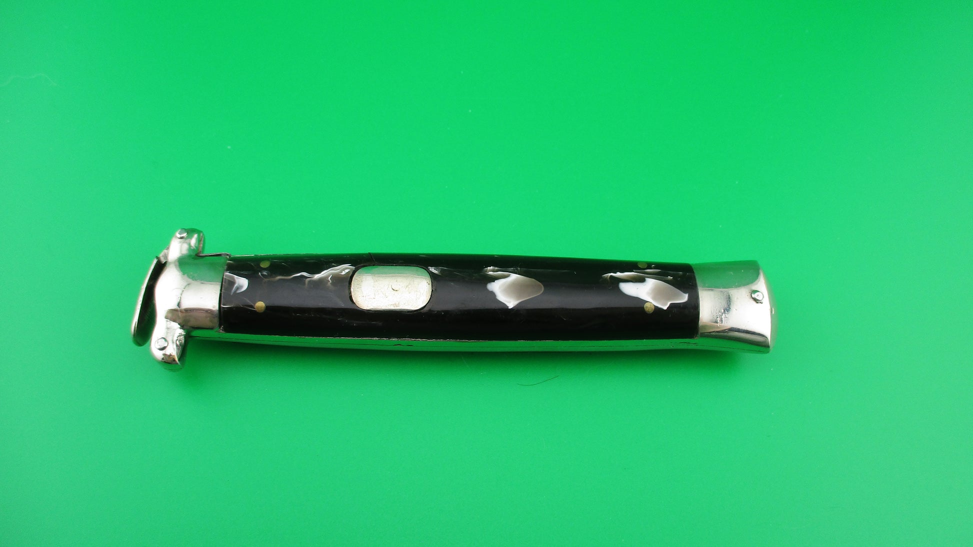 This is a New Old Stock 1960s Italian Trapdoor OTF flush button switchblade. Highly sought after knife! Some of these knives were found in an old knife shop in Italy a couple of years ago after sitting in storage for around 60 years. This is one of those knives and it's gorgeous! The oval button is flush with the scale and it actually rocks. You push on the bottom of the button to open the knife and the top of the button to release the blade to close. The final bit is done with the trapdoor lever that you use to cock the knife back into the firing position. The knife measures 5 inches closed and 20.7cm (8.25 inches) open with nickel silver bolsters & button and steel trapdoor. Blade is marked C.JUL Herbertz IMPORT on the front and PATENT over ROSTFREI on the back ricasso. The scales are Faux Horn synthetic mostly black with white & tan streaks. New Old Stock EX++ condition.