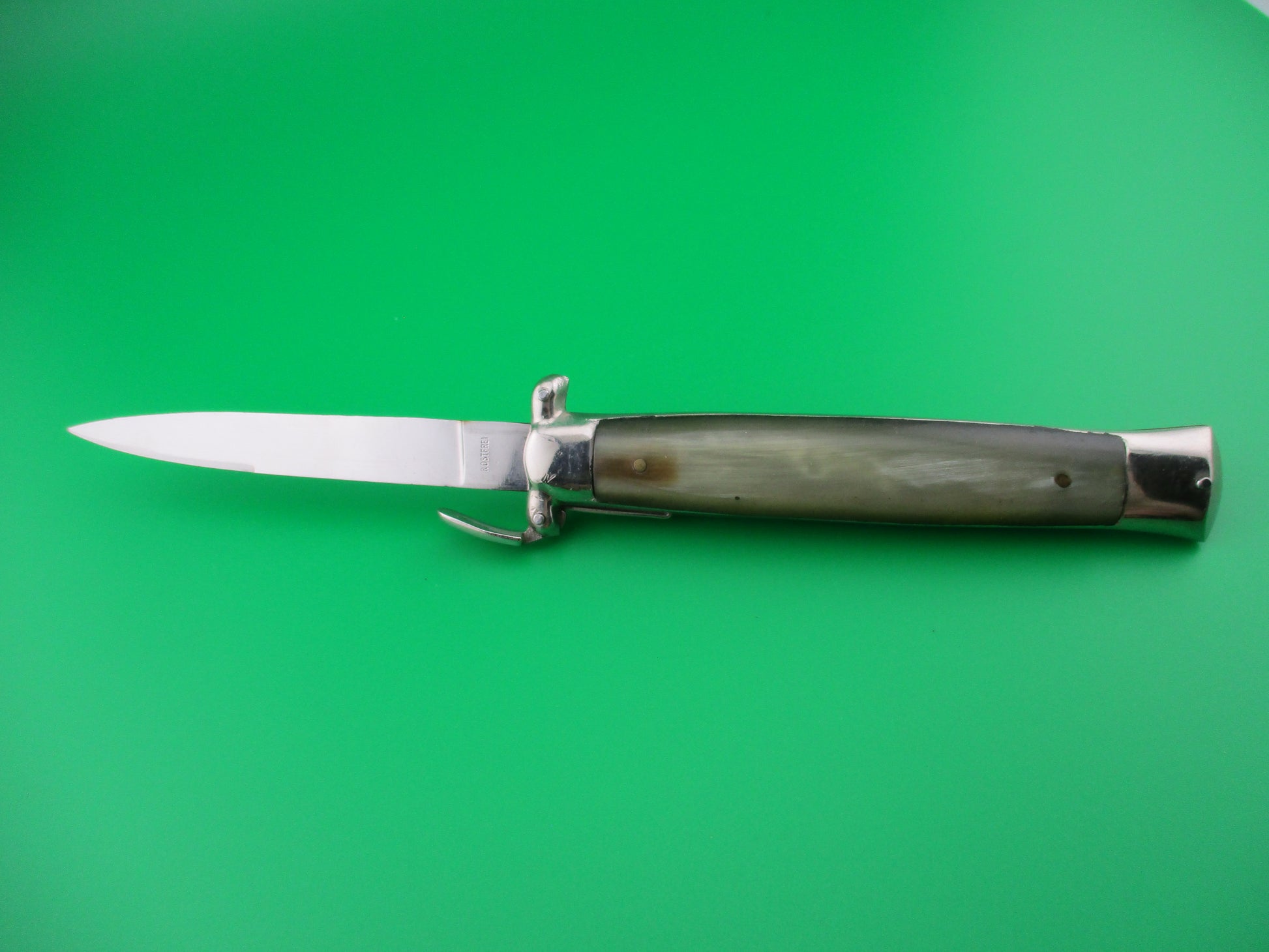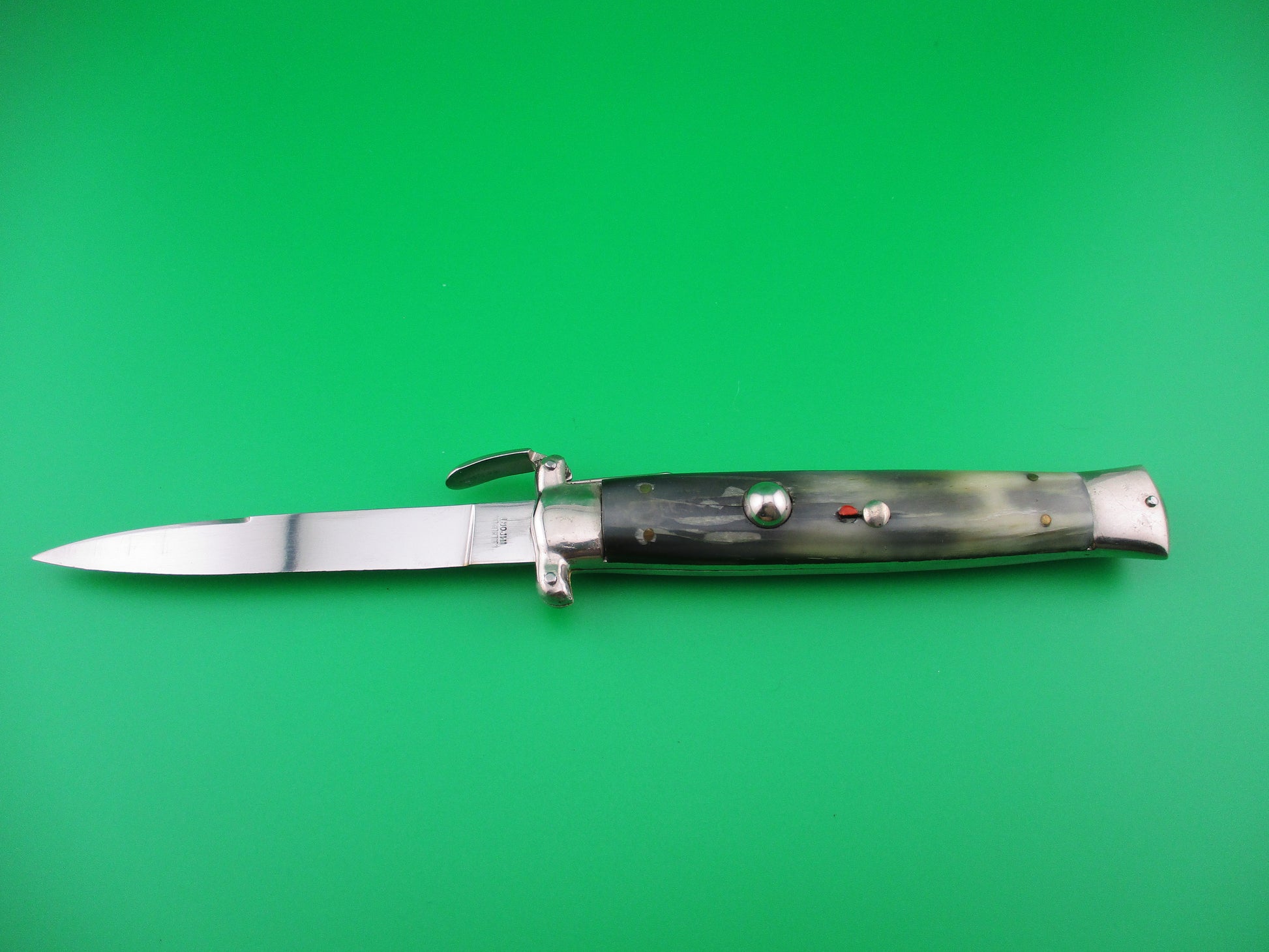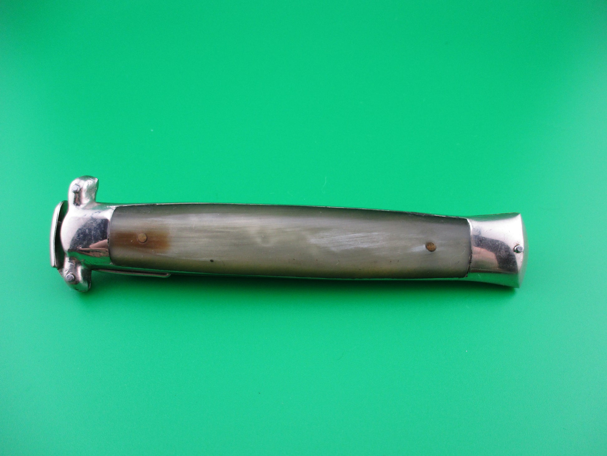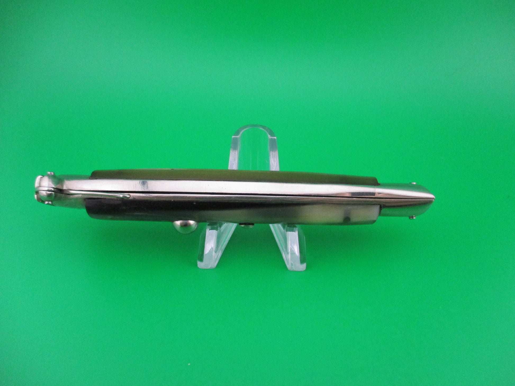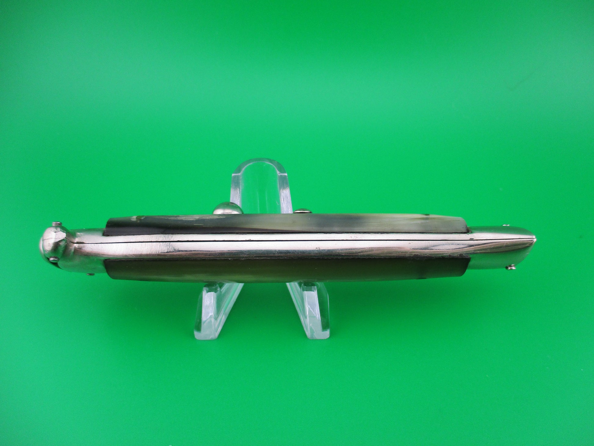 Vintage 1960s Italian trapdoor switchblade. This knife is part of a group of these knives that was found in an old workshop in Italy a couple of years ago. These switchblades have been very rare in the collecting community over the past 50 years so this find will give the opportunity to many collectors to own one of these knives who would likely never have had that opportunity before. The knife measures 21.3cm (8 3/8 inches) open with nickel silver bolsters, button and safety cap. The flat swedge grind blade is full with original finish and some light scratches and it stamped C JUL HERBERTZ over IMPORT on the ricasso and the backside is stamped ROSTFREI. The horn scales are gorgeous translucent light green & cream to black and are in very good condition with one hairline crack near the button. The knife functions great with the blade opening fully when the button is pressed. Press the button again to release the blade from locked open position to be closed and cocked into firing position with the hinged trapdoor. Red dot safety works. EX condition.