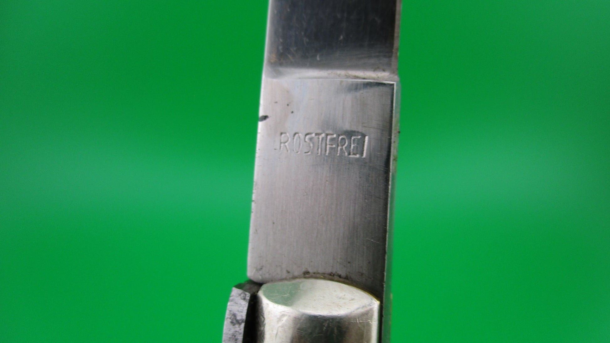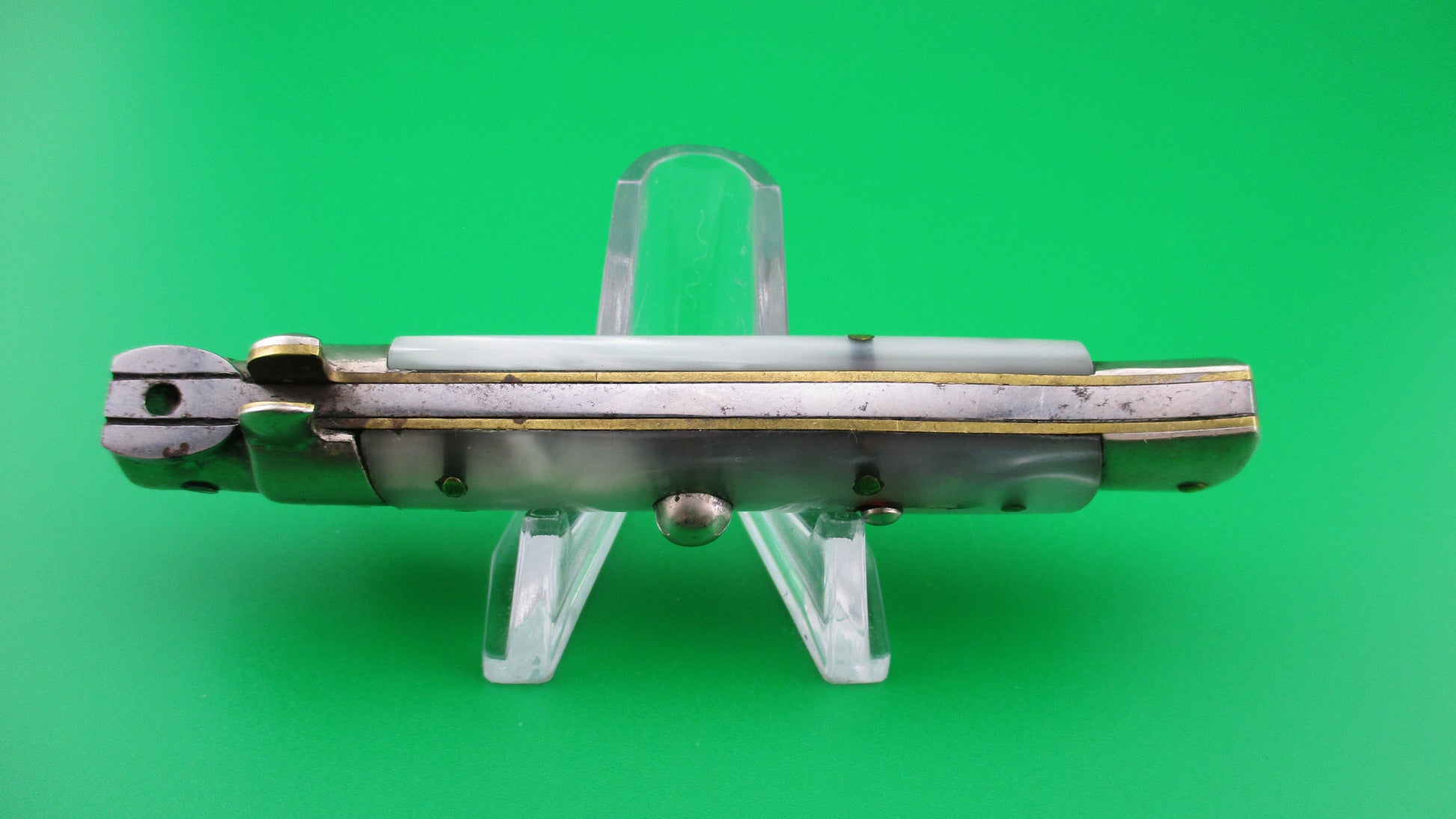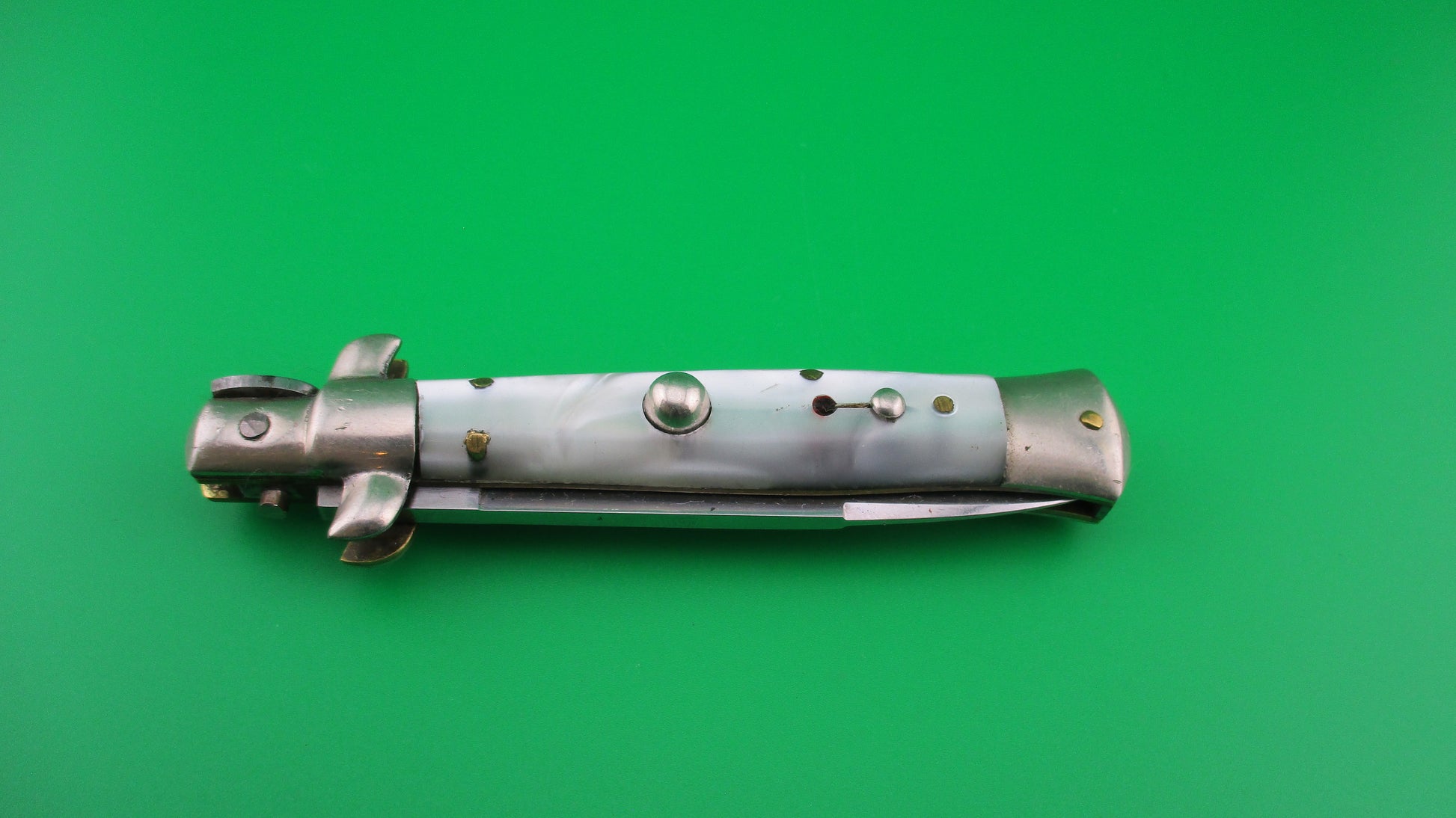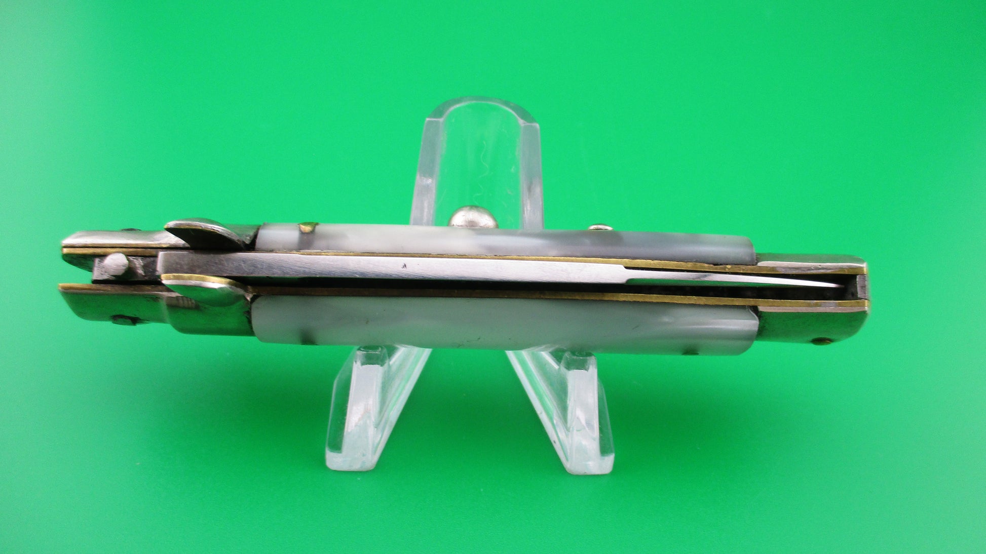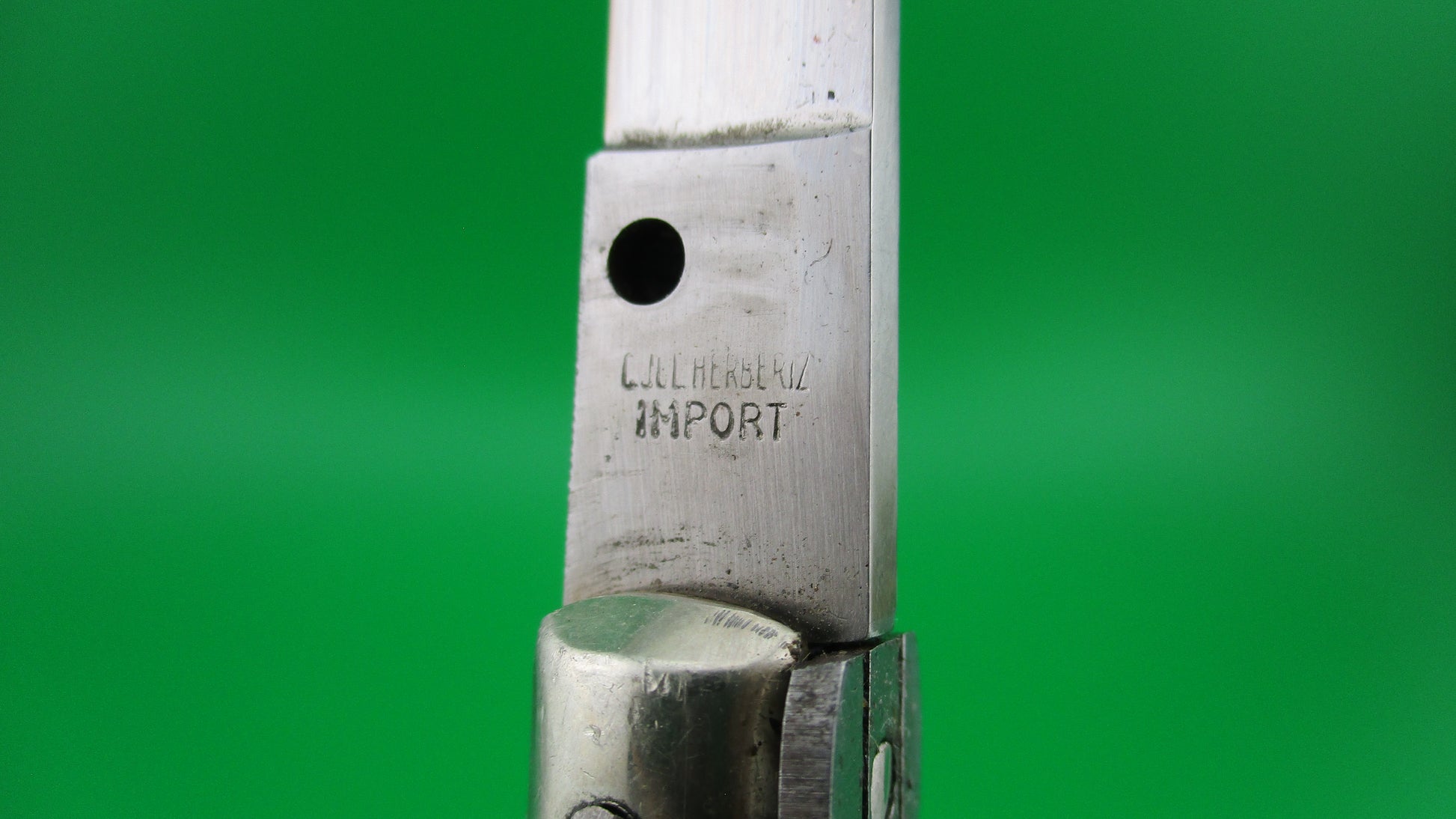 Vintage C JUL HERBERTZ IMPORT 18cm Italian Transitional Pearlex Stiletto switchblade knife. The knife is NOS (New Old Stock) and is part of a group of old Herbertz switchblades found recently in Italy that had been in storage for over 50 years. The knife measures 17.9cm (7 1/16 inches) open with D stamped brass liners and nickel silver bolsters, button and safety cap with Red Dot safety. The flat swedge grind blade is 100% full with all of the factory finish intact and the ricasso is stamped C JUL HERBERTZ IMPORT on the front and ROSTFREI on the rear. The Pearlex (imitation pearl) scales are Beautiful and in great condition with a few tiny scratches from handling/storage. The knife works great with the blade tip deep and centered in the well closed, strong snap and good lockup open with less than 1/16" up and down at the tip. Safety works. Nearly New (NOS) condition.