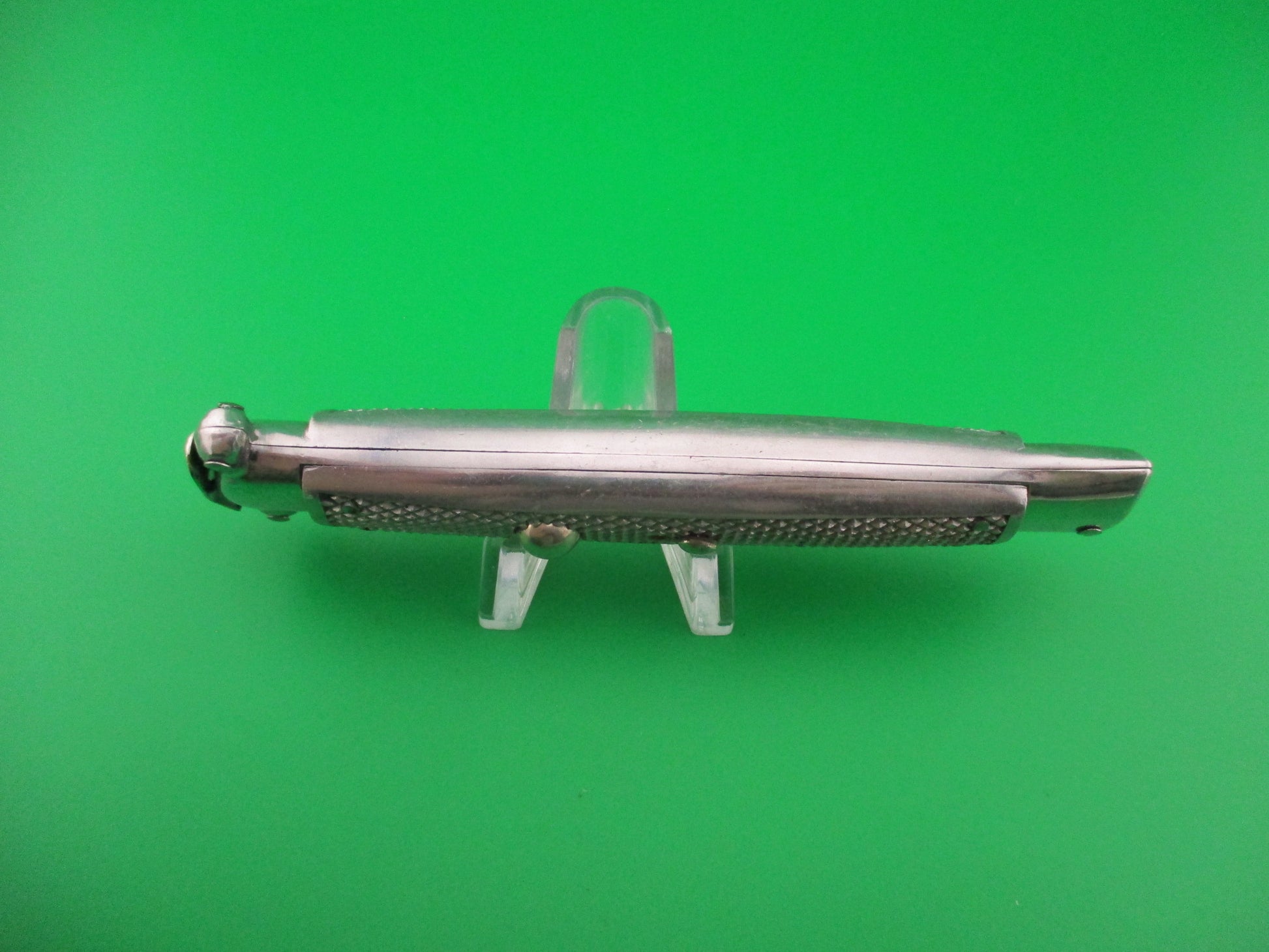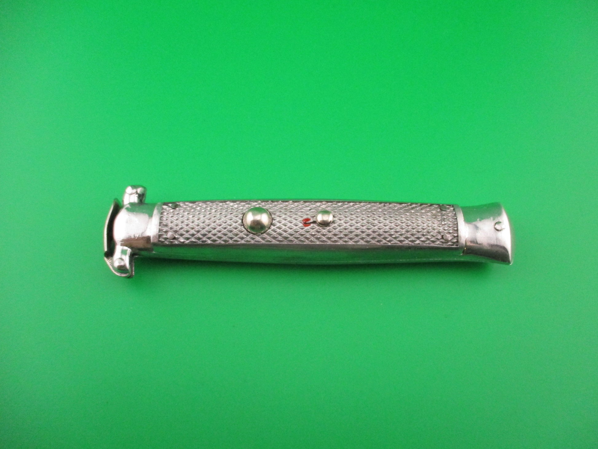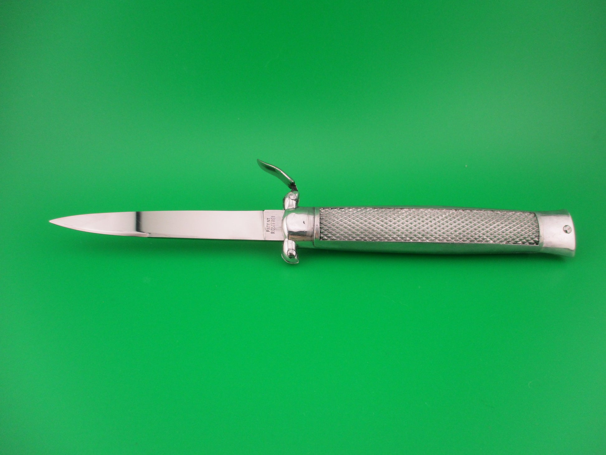 Vintage 1960s C JUL HERBERTZ IMPORT 21cm Italian Trapdoor OTF All metal Aluminum automatic knife made in Italy. These switchblades have been very rare in the collecting community over the past 50 years, especially the all metal ones like this knife. It measures 21.3cm (8 3/8 inches) open and 4.75 inches closed with aluminum checkered frame and nickel silver button and safety cap. The flat swedge blade is 100% full with the original finish some light scratches and the ricasso is stamped C JUL HERBERTZ IMPORT and the reverse is marked PATENT ROSTFREI. The checkered aluminum handles are in excellent condition. The knife works great with the blade opening fully and locks when the button is pressed. Press button again to release blade to push back into the knife and reset (cock) the blade using the hinged trapdoor which on this knife is on the left side though most were hinged on the right side. EX+ condition.