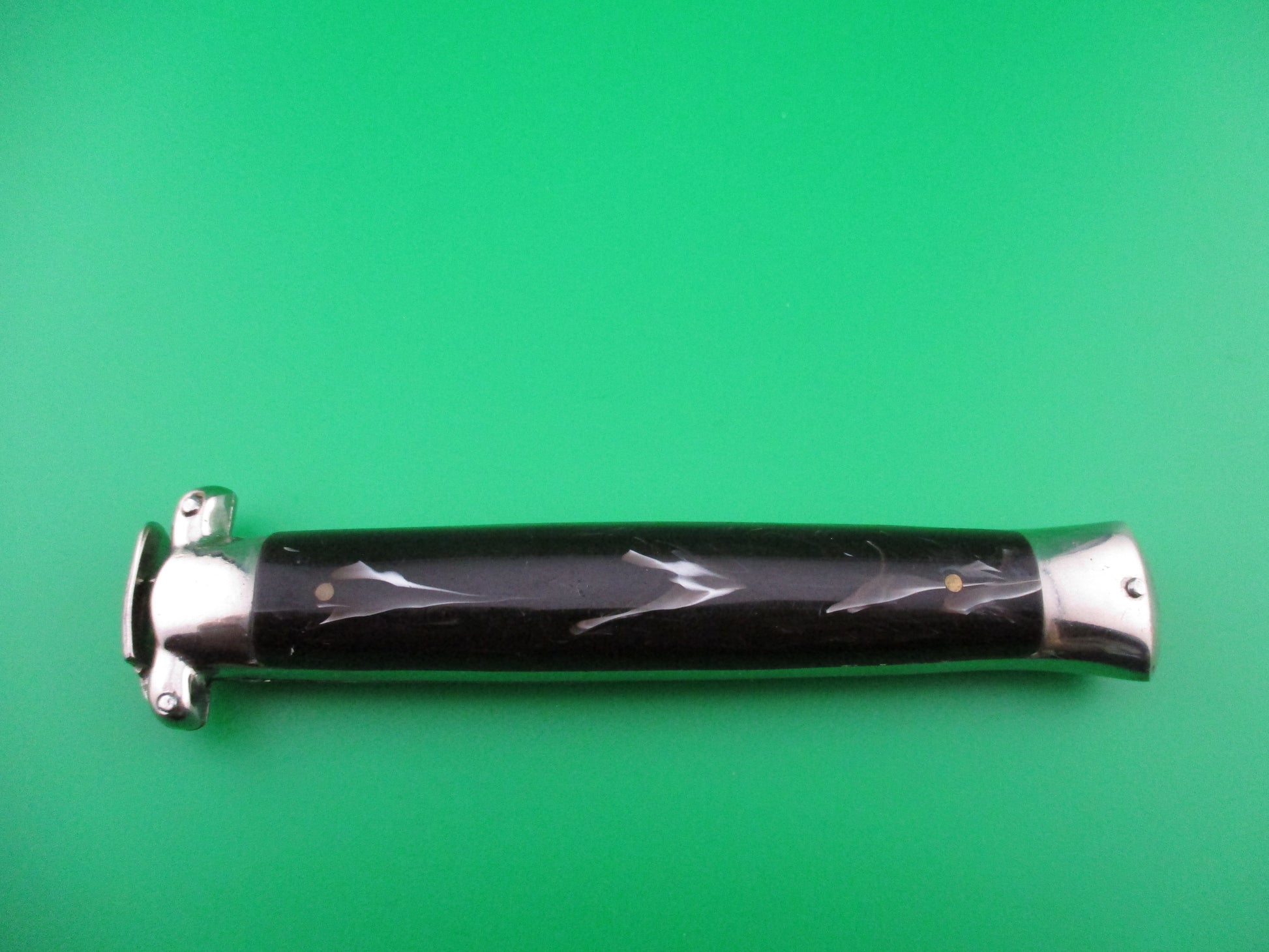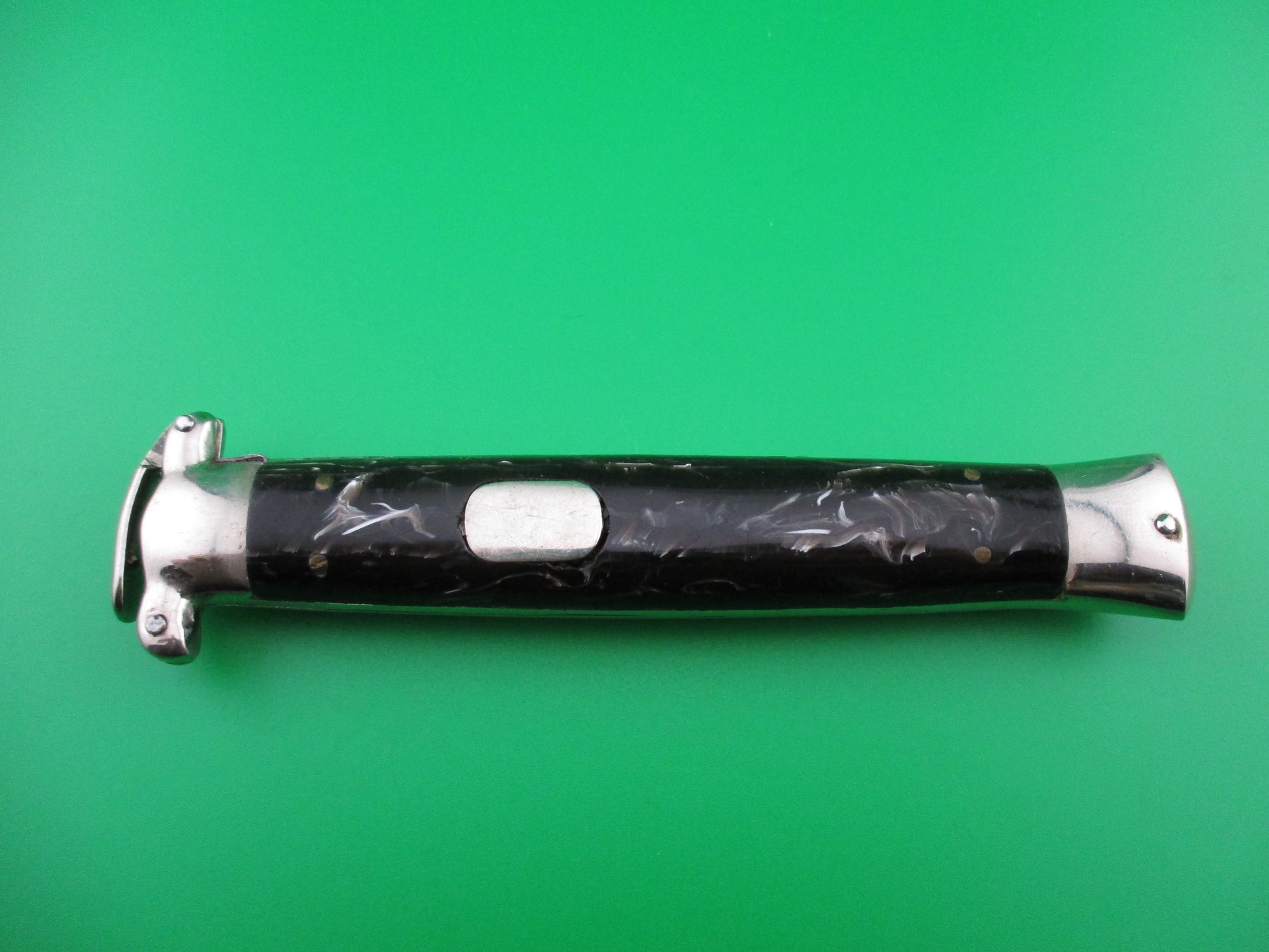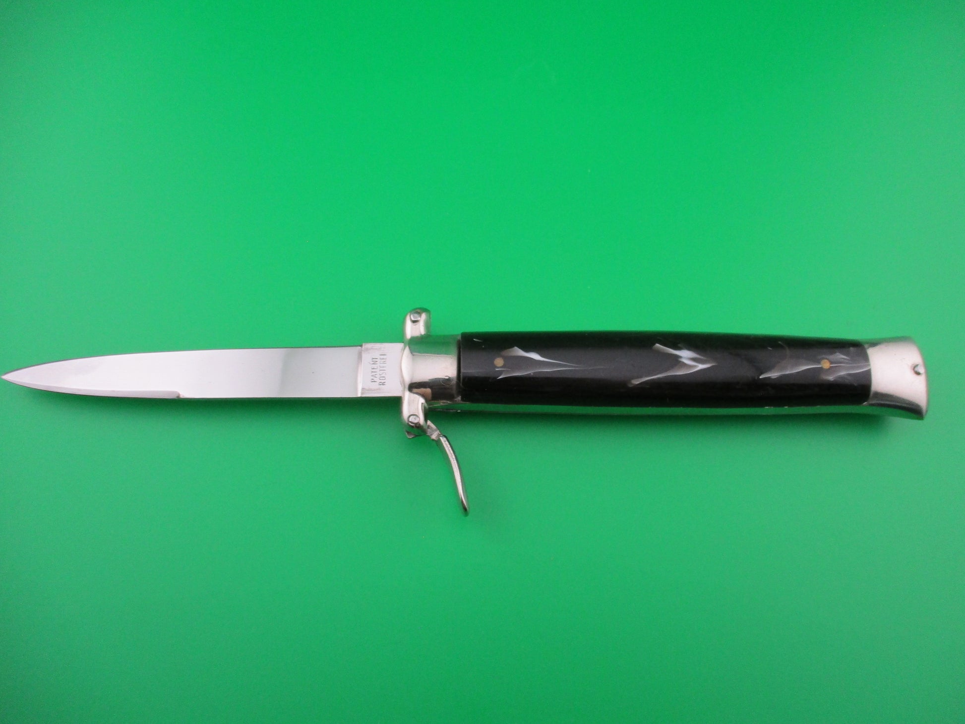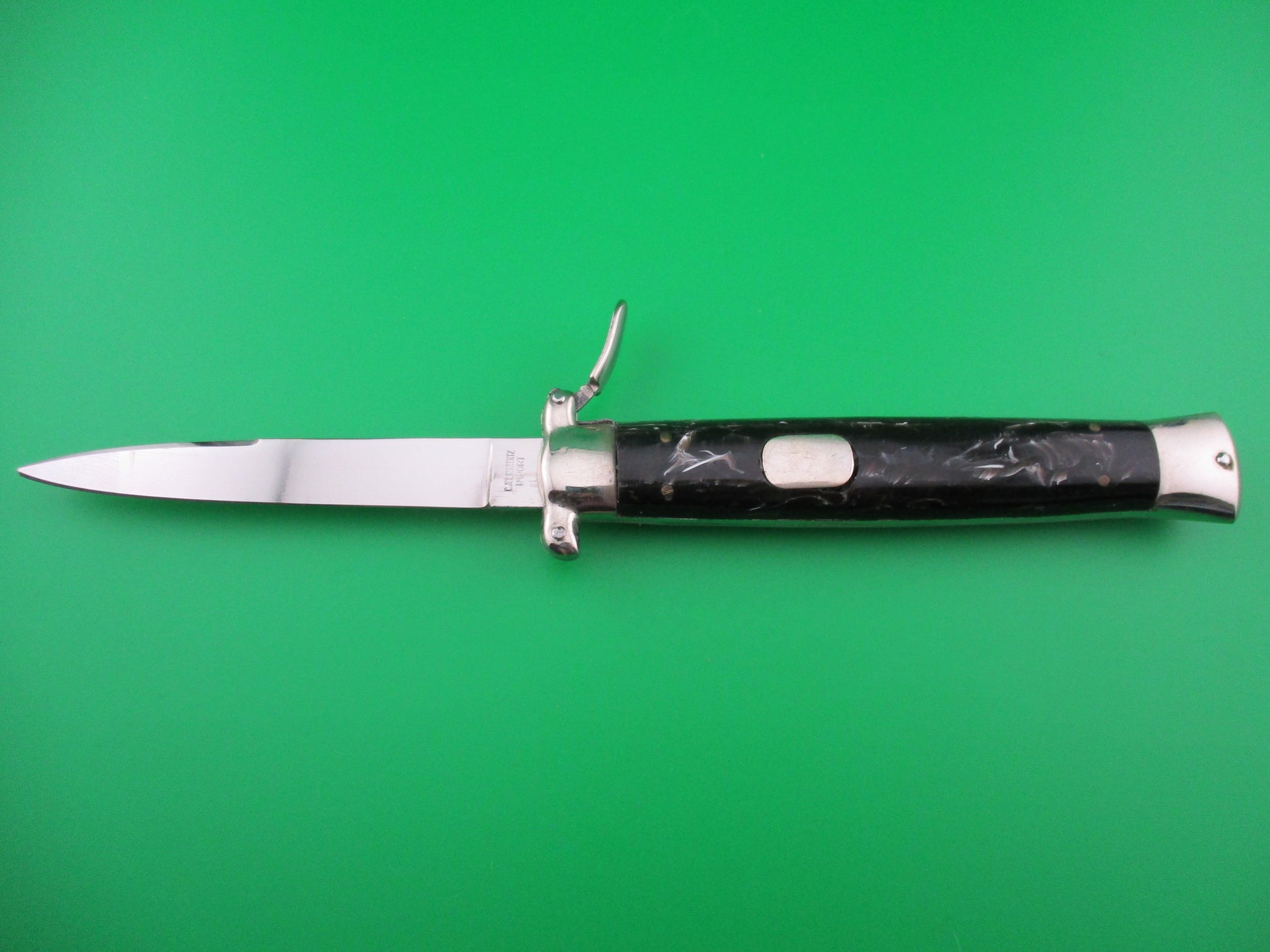 This is a New Old Stock 1960s Italian Trapdoor OTF flush button switchblade. Highly sought after knife! Some of these knives were found in an old knife shop in Italy a couple of years ago after sitting in storage for around 60 years. This is one of those knives and it's gorgeous! The button is flush with the scale and it actually rocks. You push on the bottom of the button to open the knife and the top of the button to release the blade to close. The final bit is done with the trapdoor lever that you use to cock the knife back into the firing position. The knife measures 5 inches closed and 8.25 inches open. Blade is marked C.JUL Herbertz on the front and PATENT over ROSTFREI on the back ricasso. New Old Stock EX++