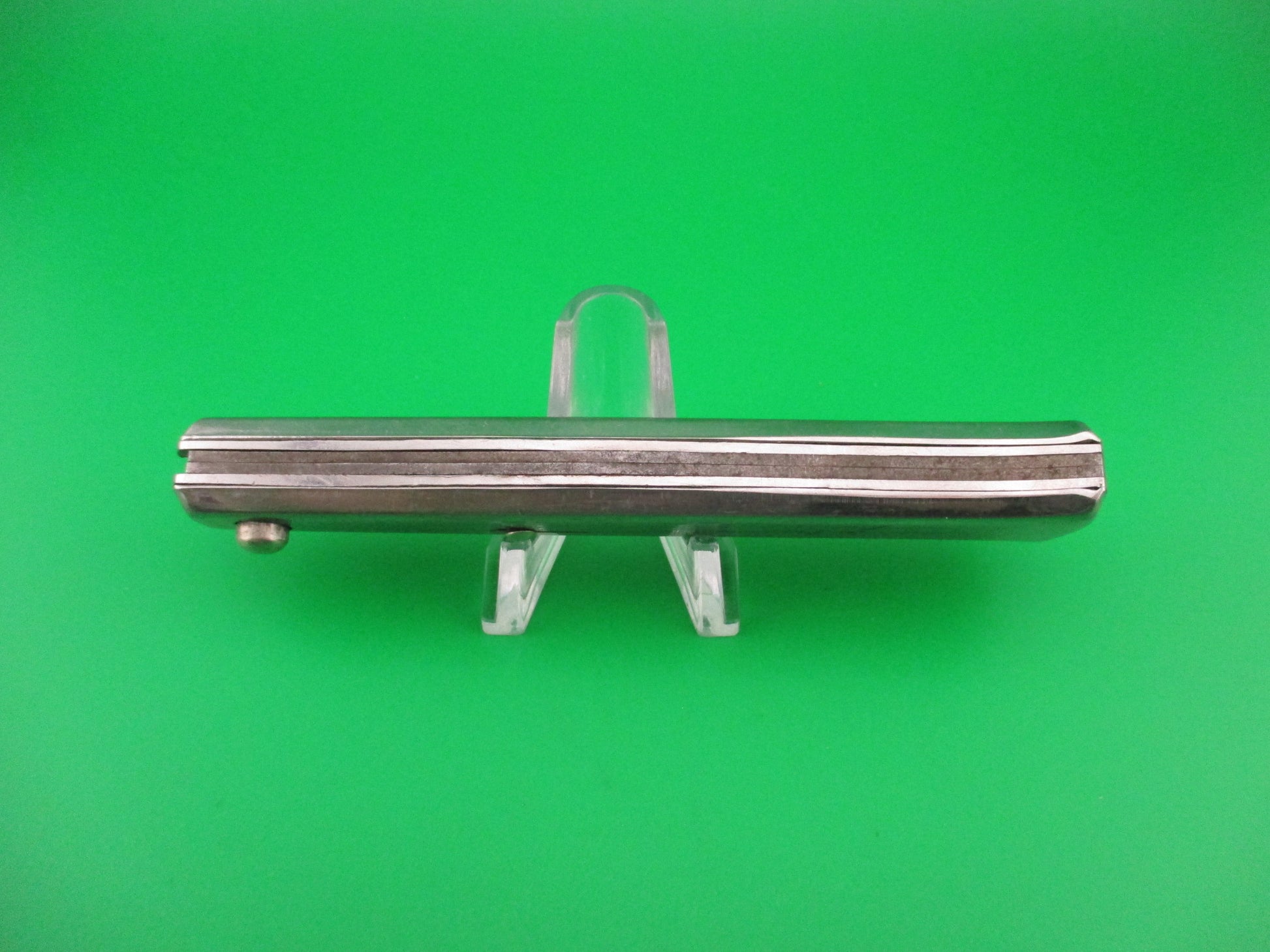 Vintage C JUL HERBERTZ PATENT IMPORT 22cm Italian fishtail all metal automatic knife measures 21.87cm (8 9/16 inches) open with steel liners and safety with nickel silver button. The flat grind swedge blade is 99% full or better with original factory finish and some very light scratches. The silver colored metal handles have a nice pattern lightly stamped into the surfaces that shows almost no wear from handling. The knife works well with blade tip deep and centered closed, good snap and Tight lockup. Most likely exported to Germany and sold through Linder in the 1970s or 80s. Safety works. EX+ condition.