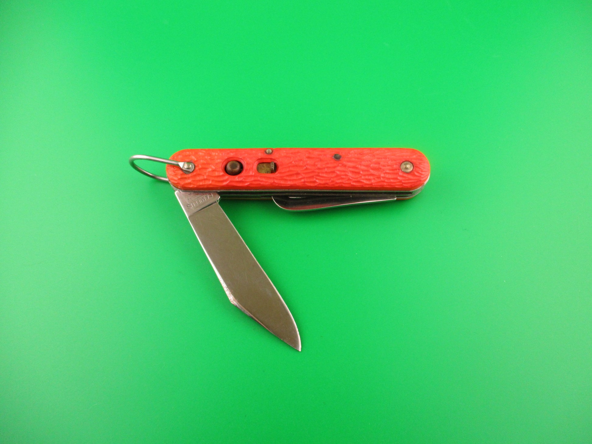 Camillus MC1 US Government issue paratrooper switchblade knife. These knives were made by Camillus for the US Government for approximately 50 years. They were primarily issued to military personnel especially paratroopers. Some were also used by NASA and other government branches. This one measures 4 1/4 inches closed and just over 7 1/4" with automatic clip blade open. The clip blade is stamped CAMILLUS NEW YORK USA on the tang and is 97% full or better with light scratches and the original finish. The hook blade is manual and was left open during a jump for quick access in case of parachute emergency with the knife attached to the jumpsuit by a cord tied to the lanyard ring. Orange handles (scales) are in great condition, bright color and slight shrinkage. Works well with blade tip a hair above the liners when closed, good snap and appears to lock open, but you can close the knife without pressing the button. It rattles if shaken with blade open. Safety works. VG- condition.