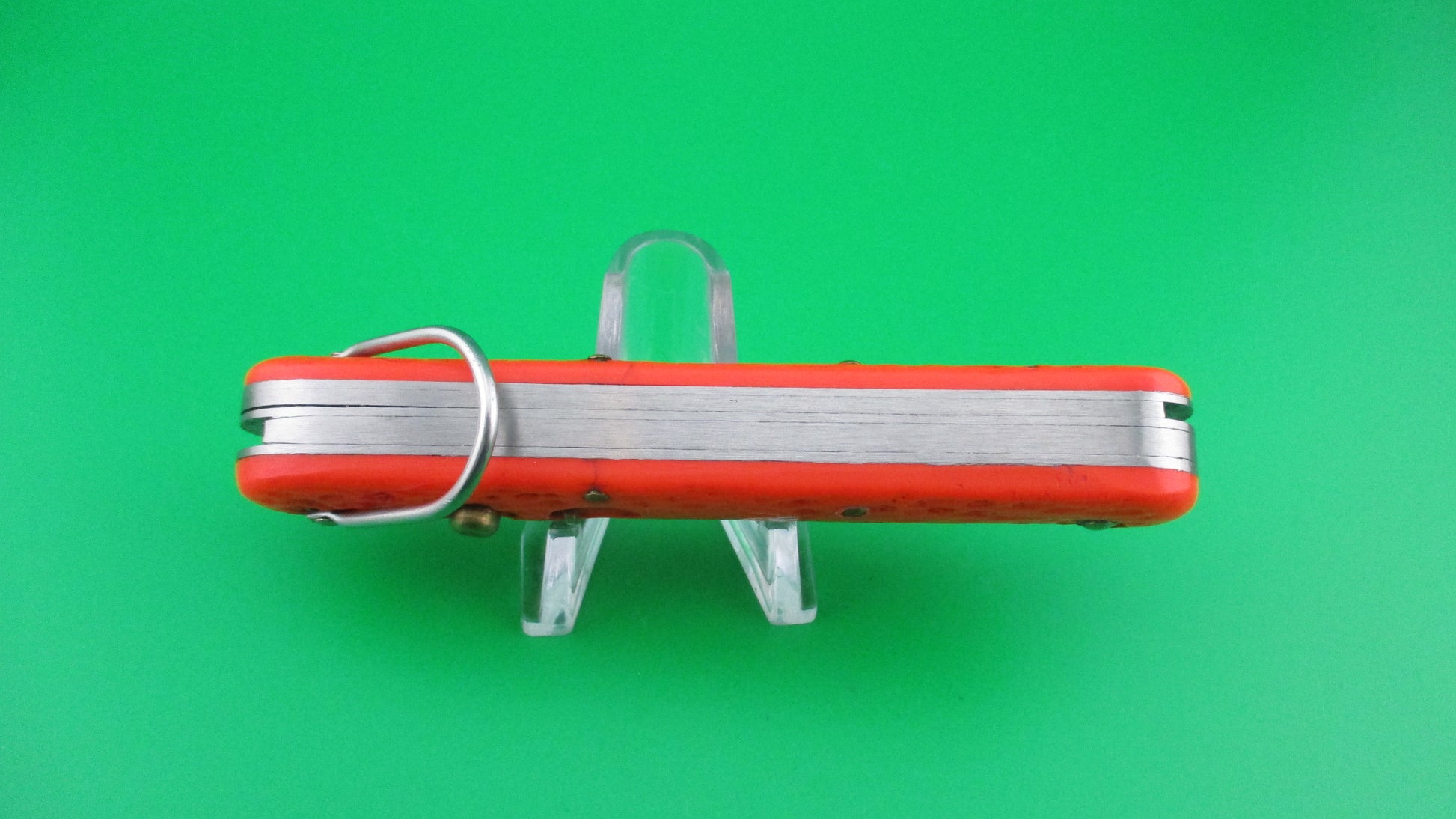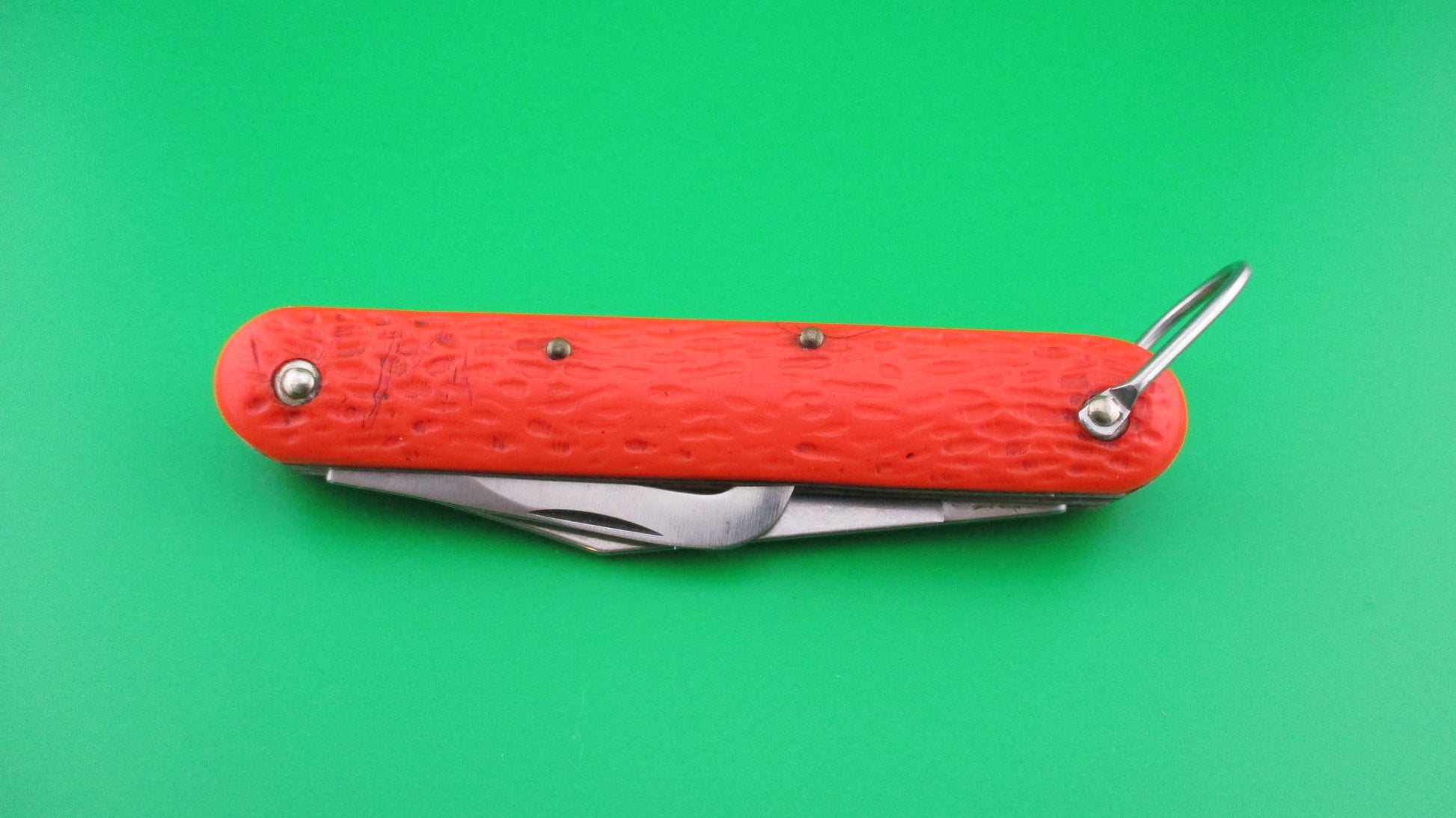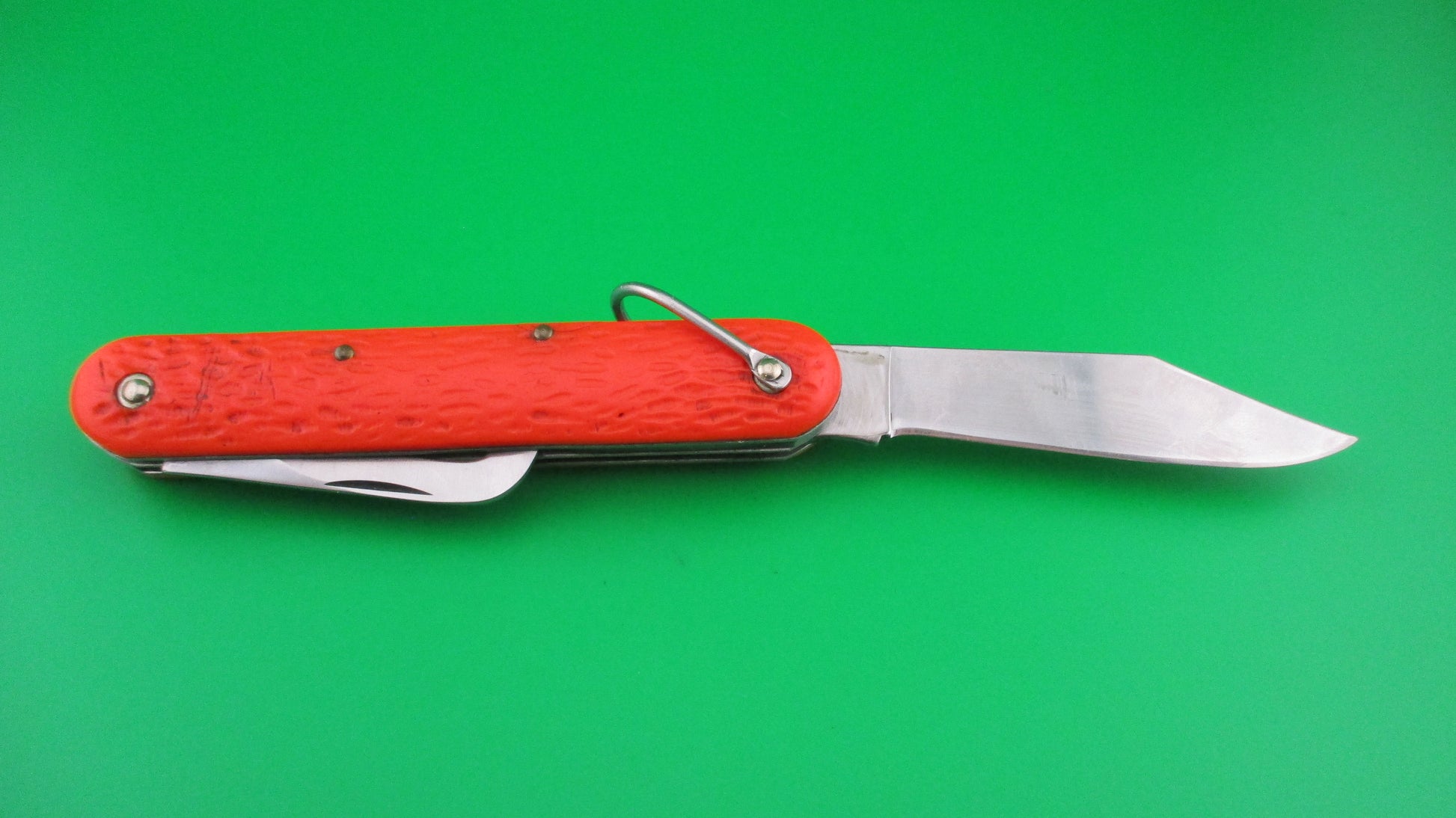 Camillus MC1 US Government issue paratrooper switchblade knife. These knives were made by Camillus for the US Government for approximately 50 years. They were primarily issued to military personnel especially paratroopers. Some were also used by NASA and other government branches. This one measures 4 1/4 inches closed and 7 3/8" with automatic clip blade open and it has steel liners and brass button and safety with steel lanyard ring. The hook blade is manual and is left open during a jump for quick access in case of parachute emergency, with the knife attached to the jumpsuit by a cord tied to the lanyard ring. The blades are nearly full on this one with original finish. Orange scales (handles) in good condition with pocket wear. Works Great with blade tip even with liners when closed, good snap and good lockup with just a little movement. Safety works and is in EX condition.