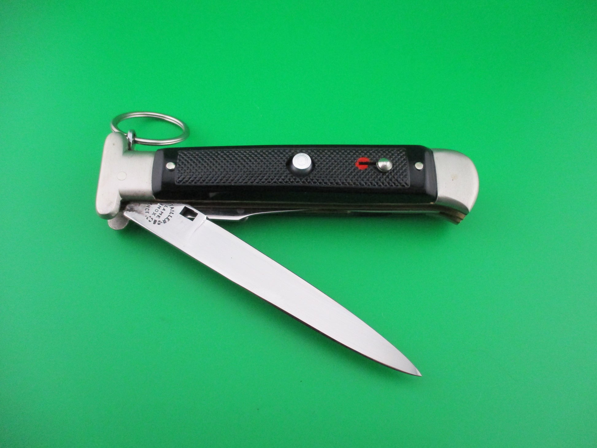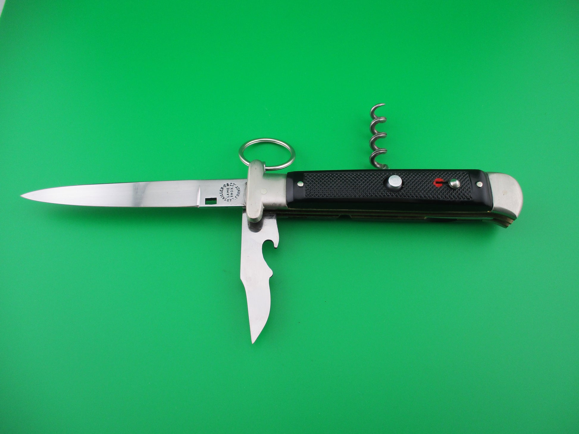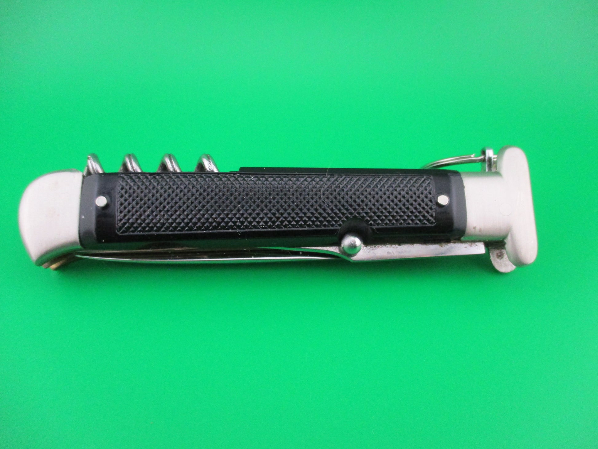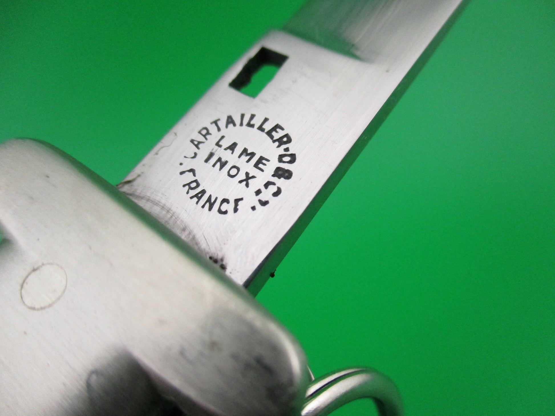 Vintage CARTAILLER D&Co FRANCE LAME INOX 22cm Ring pull French camper 4 blade automatic knife This knife measures 22cm open (8.75 inches) and has brass liners and Nickel silver bolsters, button and safety cap. The automatic main blade appears to be full with factory finish and some light scratches and is marked CARTAILLER D&Co FRANCE LAME INOX. Also has a corkscrew, screwdriver and multi use bottle opener blade, all in like new condition. The black checkered scales are in very nice condition with no cracks or issues other than slight shrinkage and Red dot safety. The knife works well with the blade tip seated deep in the well, good snap and TIGHT lockup. Press button to open, pull on ring to release blade to close. Safety works. EX+ condition.