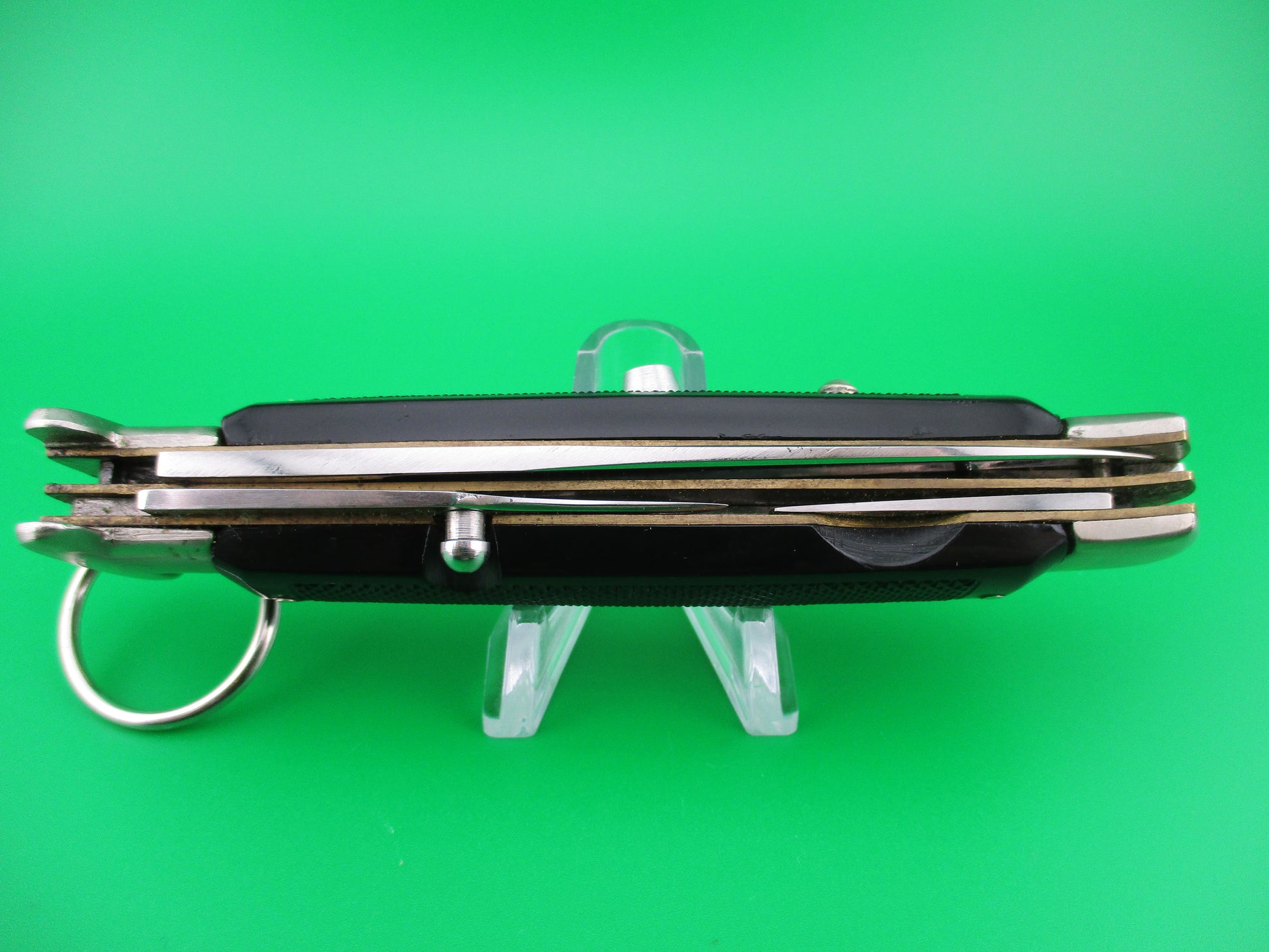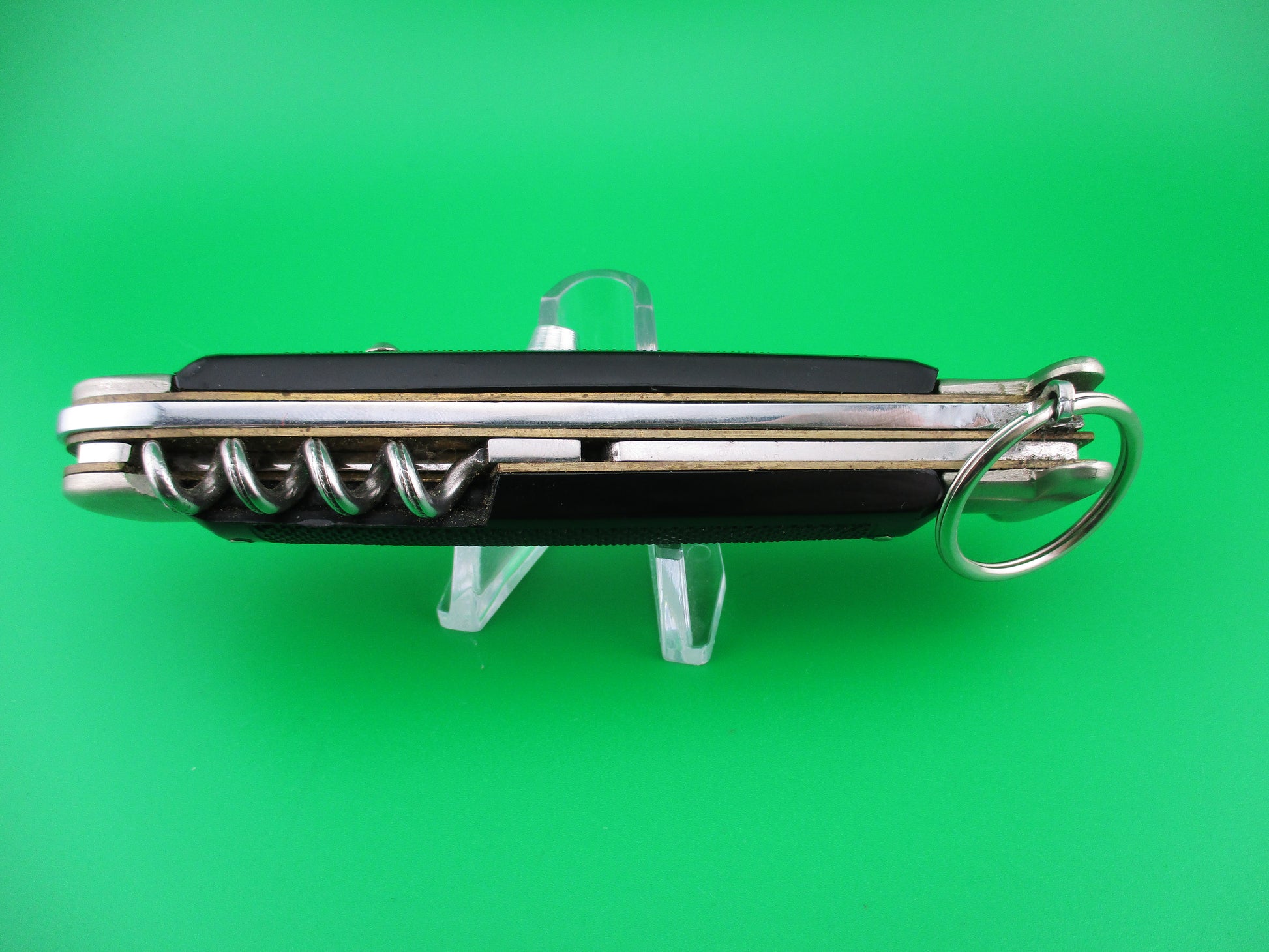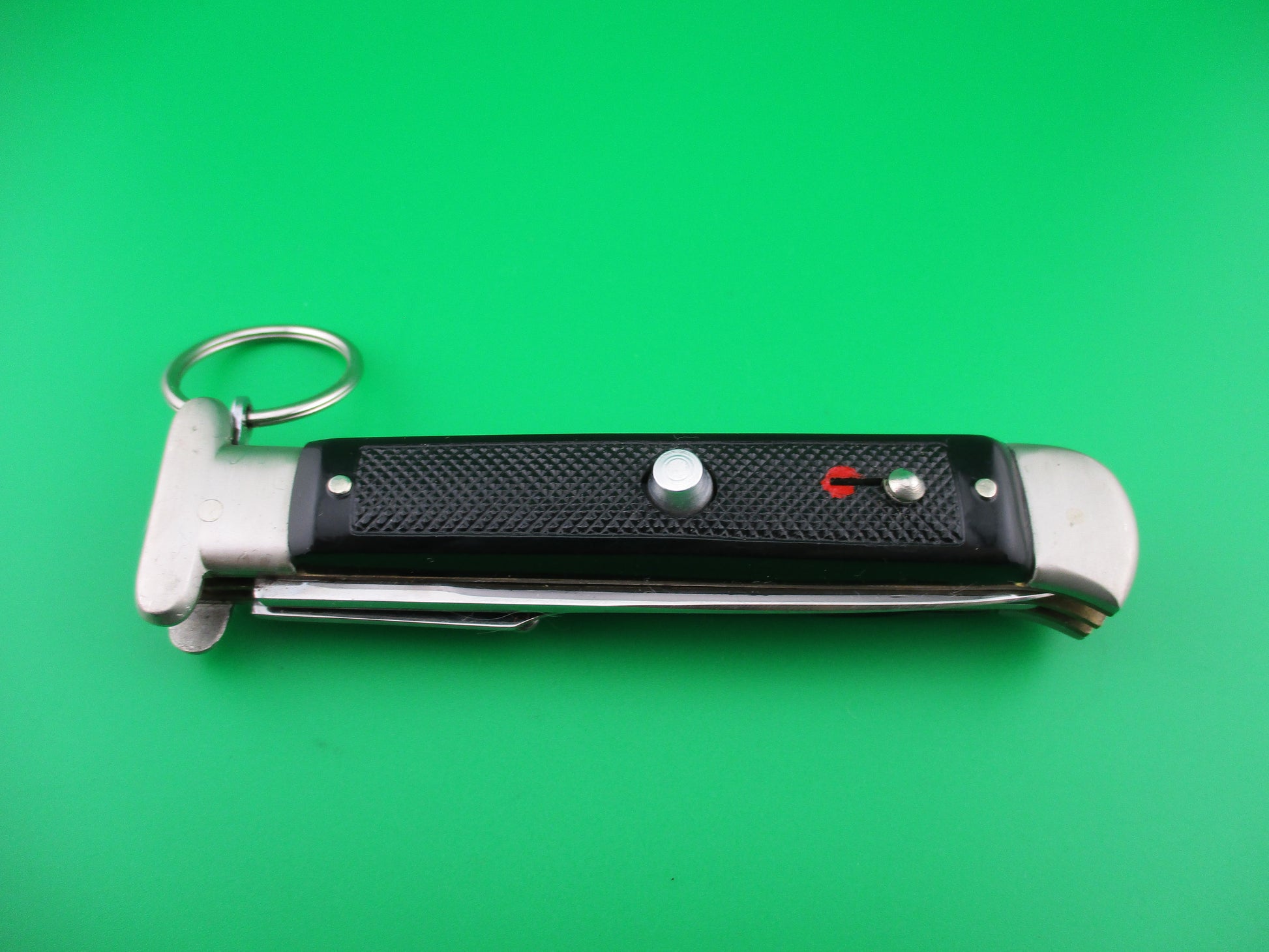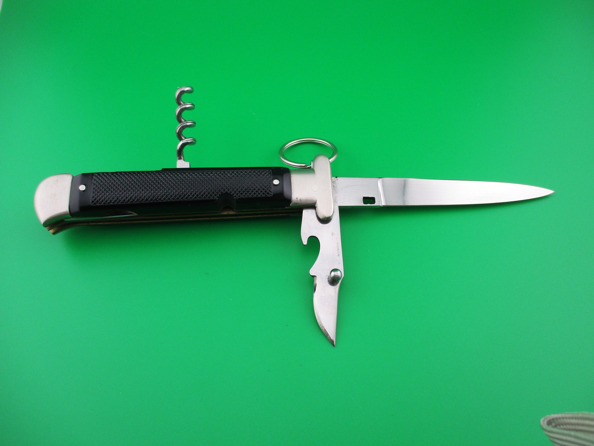Vintage CARTAILLER D&Co FRANCE LAME INOX 22cm Ring pull French camper 4 blade automatic knife This knife measures 22cm open (8.75 inches) and has brass liners and Nickel silver bolsters, button and safety cap. The automatic main blade appears to be full with factory finish and some light scratches and is marked CARTAILLER D&Co FRANCE LAME INOX. Also has a corkscrew, screwdriver and multi use bottle opener blade, all in like new condition. The black checkered scales are in very nice condition with no cracks or issues other than slight shrinkage and Red dot safety. The knife works well with the blade tip seated deep in the well, good snap and TIGHT lockup. Press button to open, pull on ring to release blade to close. Safety works. EX+ condition.
