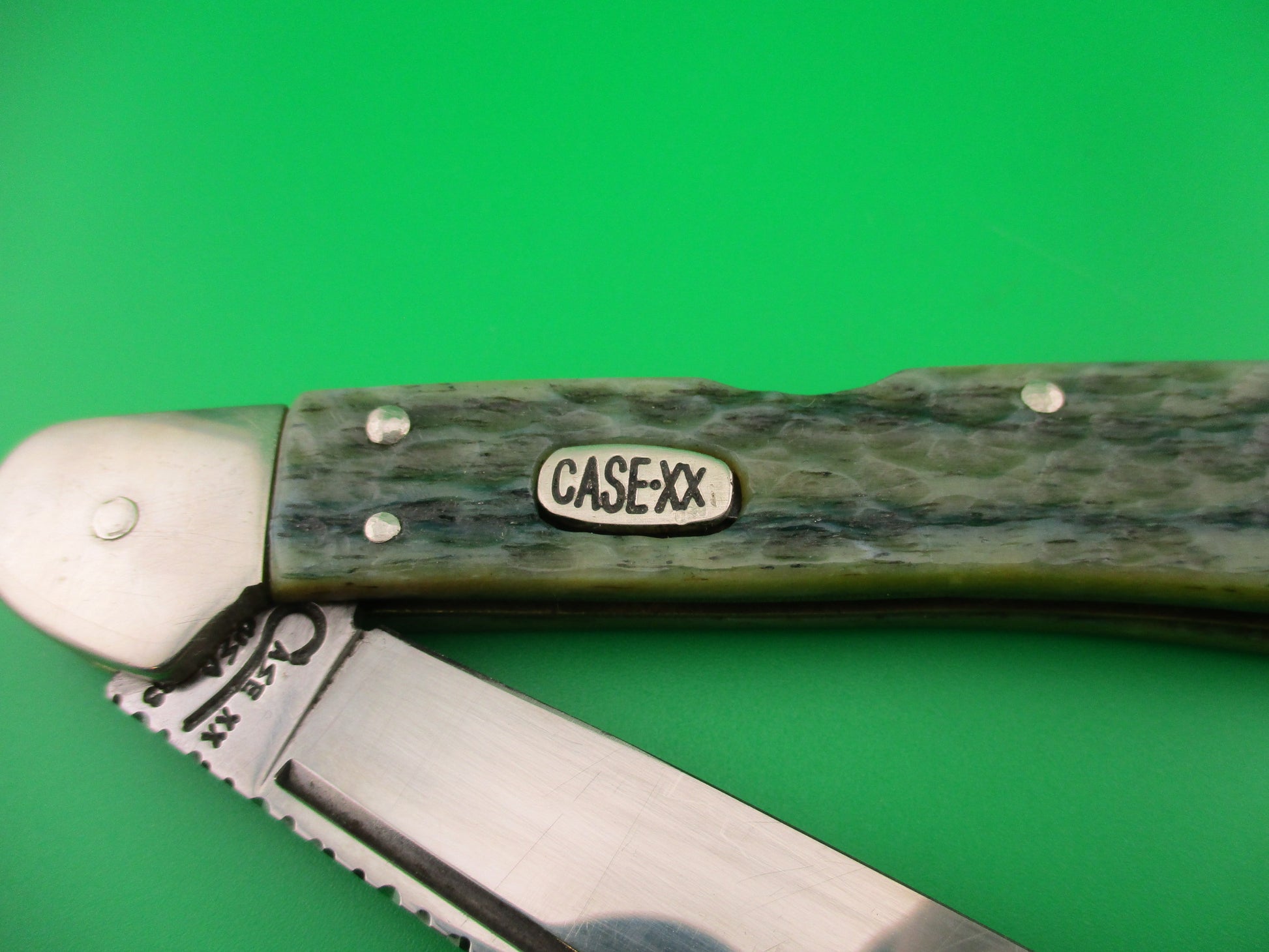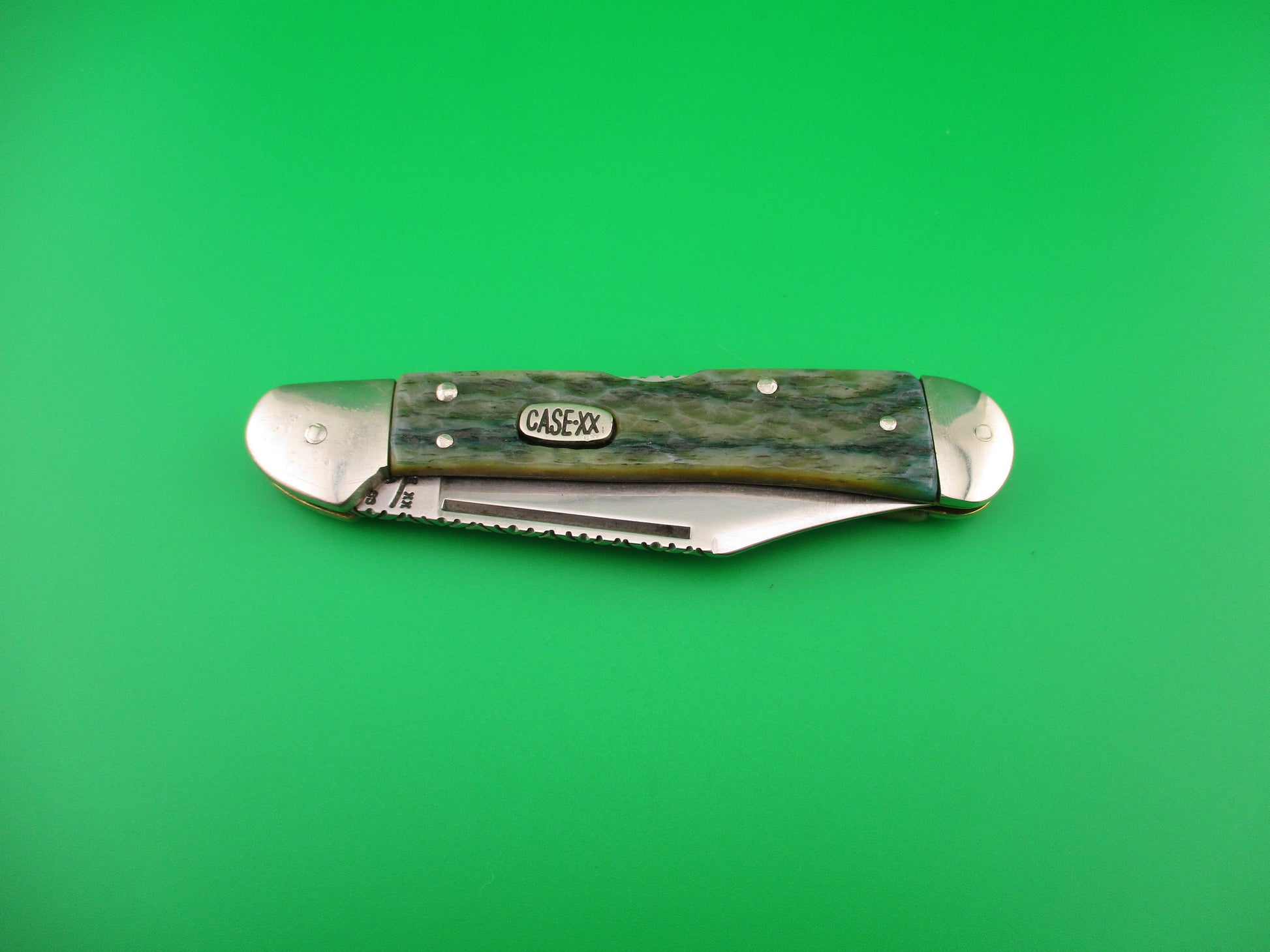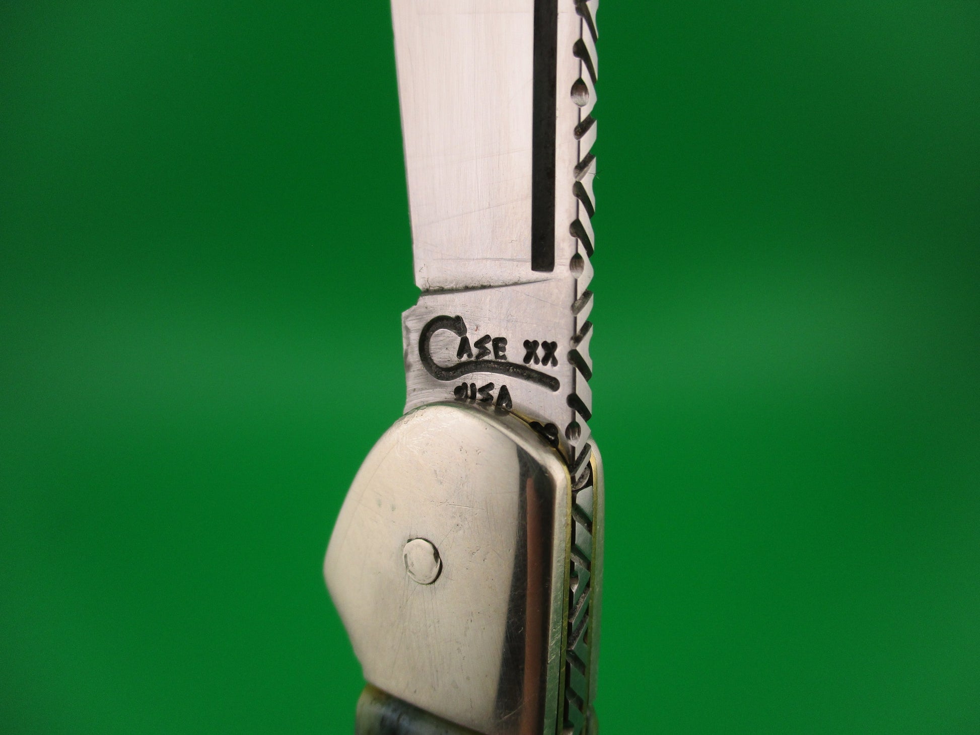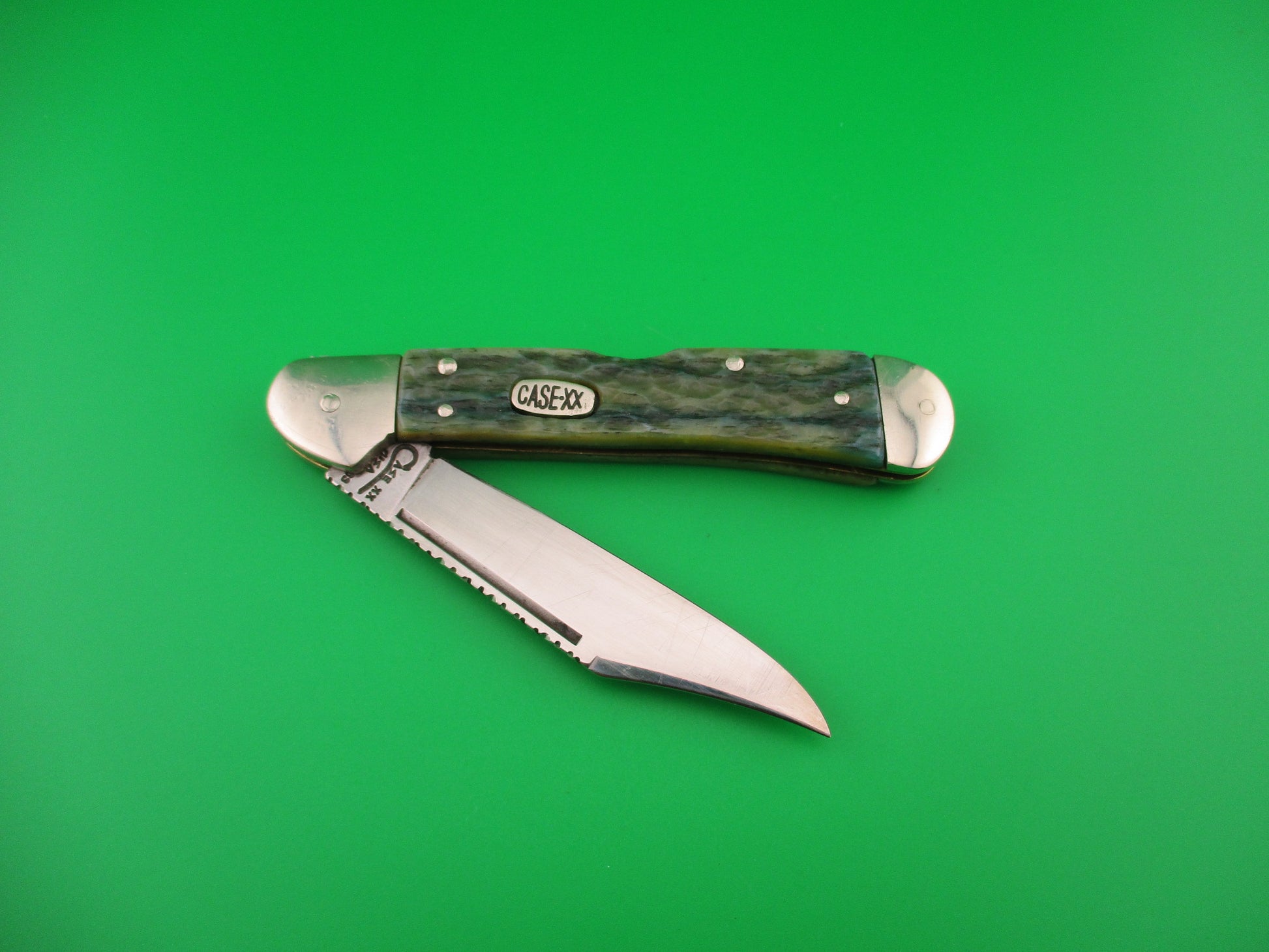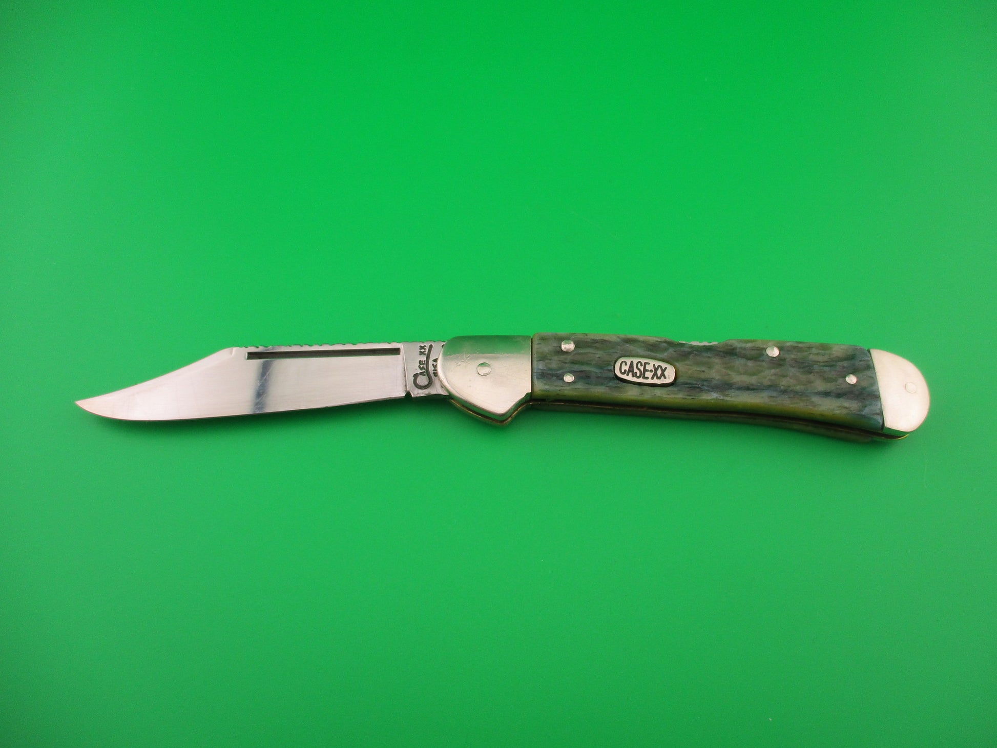 Vintage CASE XX USA 61549L SS 4.25 inch Copperlock Greenbone Converted DA switchblade lockback knife with file worked backspring and blade spine. Nicely converted to double action automatic knife with the shield as the release button. Can be opened manually or automatically (double action in this case). Knife measures 4.25 inches closed and 7 3/8 inches open with coined brass liners and nickel silver bolsters, button & pins. The clip blade is 99% full, or better with much of the original factory finish intact with lots of light scratches, file work on the spine and is stamped CASE XX USA 61549L SS on the tang. The scales (handles) are jigged green bone and in excellent condition and back spring has filework. The knife works great with blade tip well below liners closed, good snap and Tight lockup open. EX- condition.