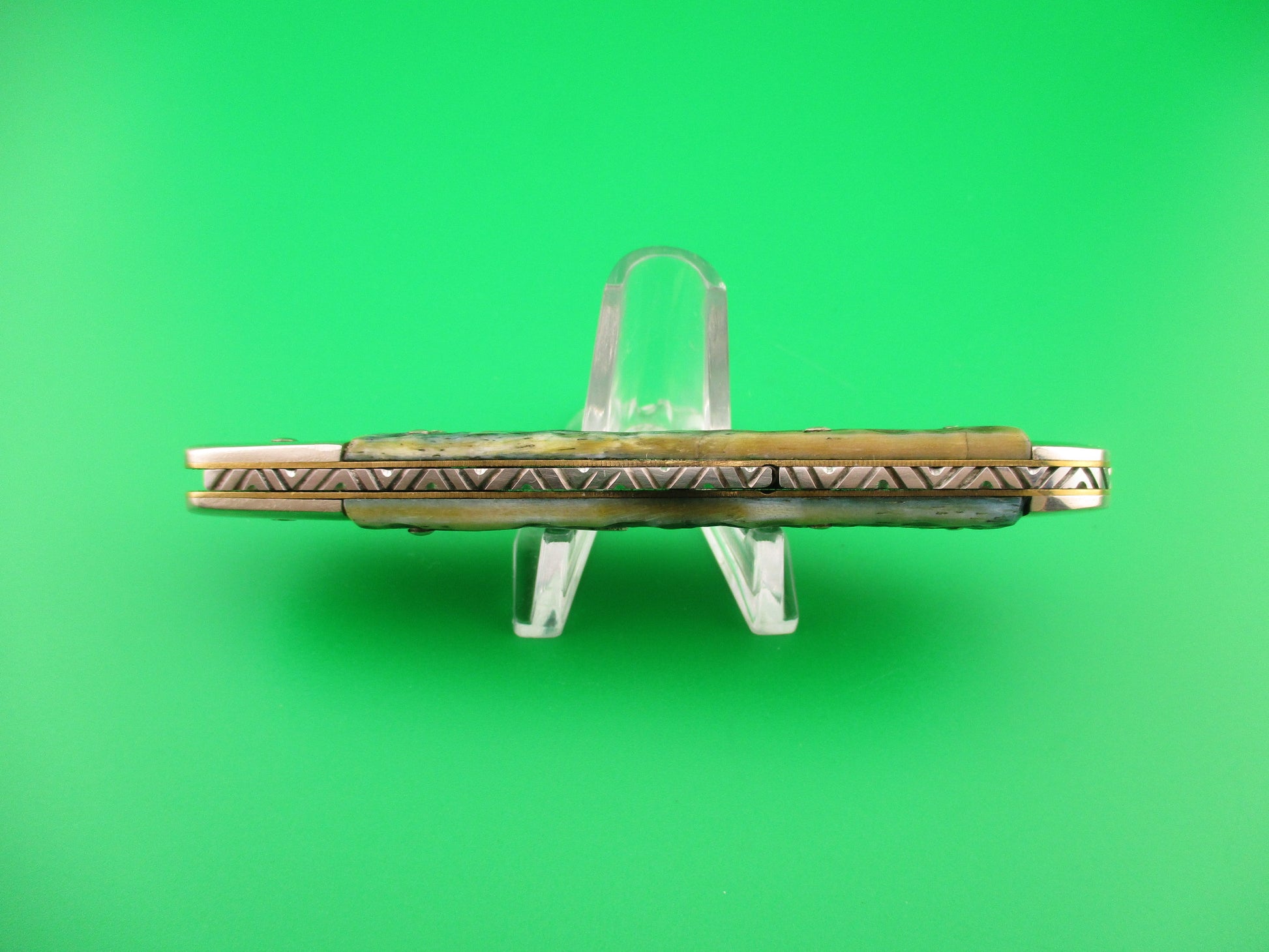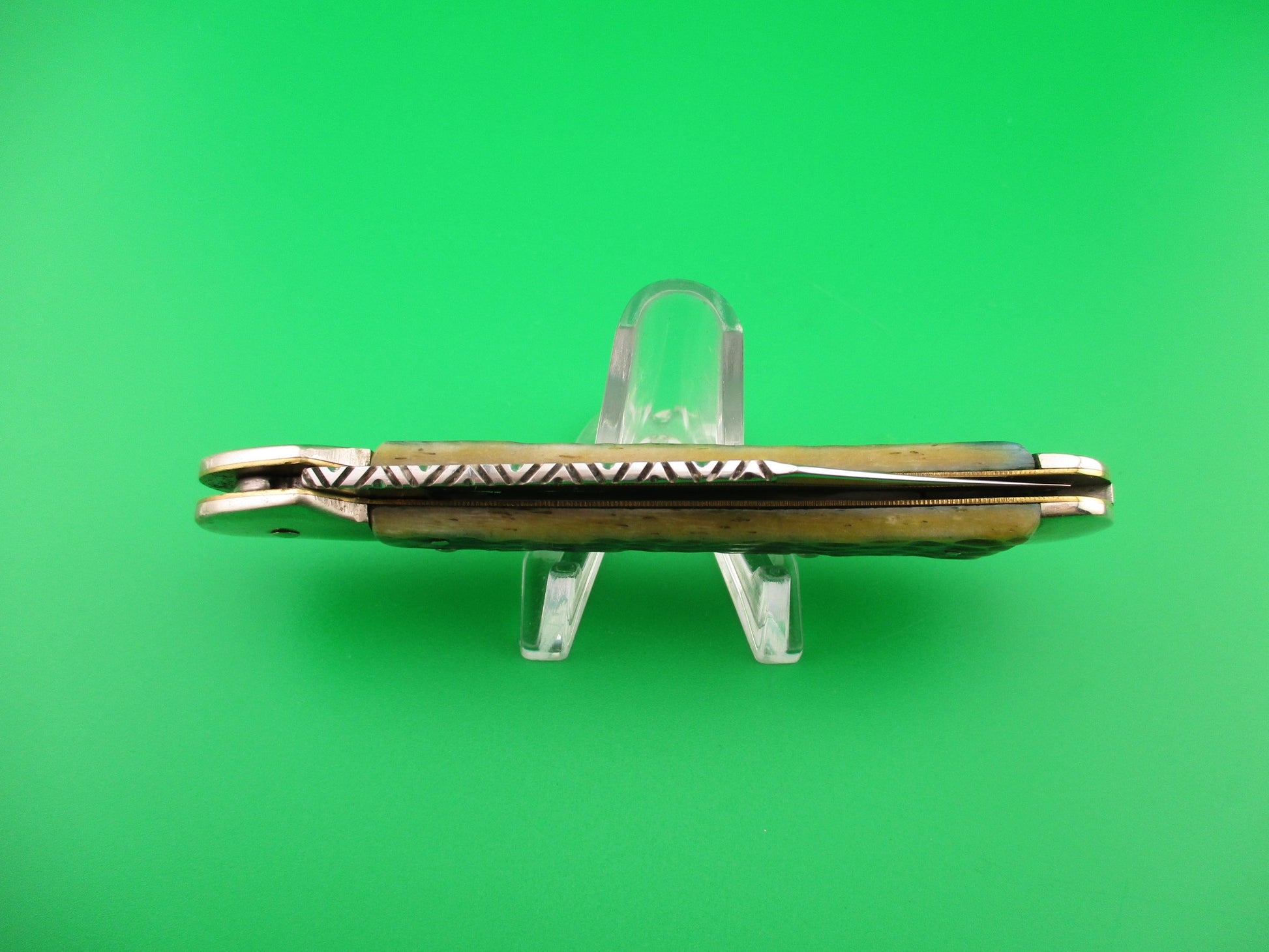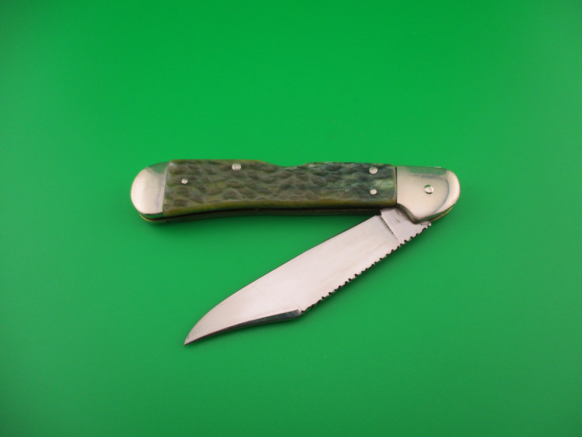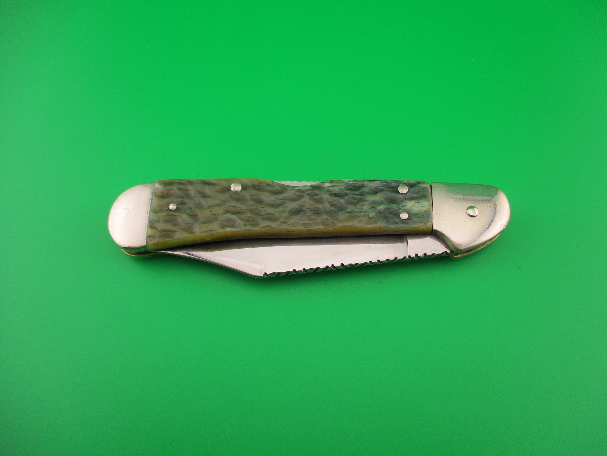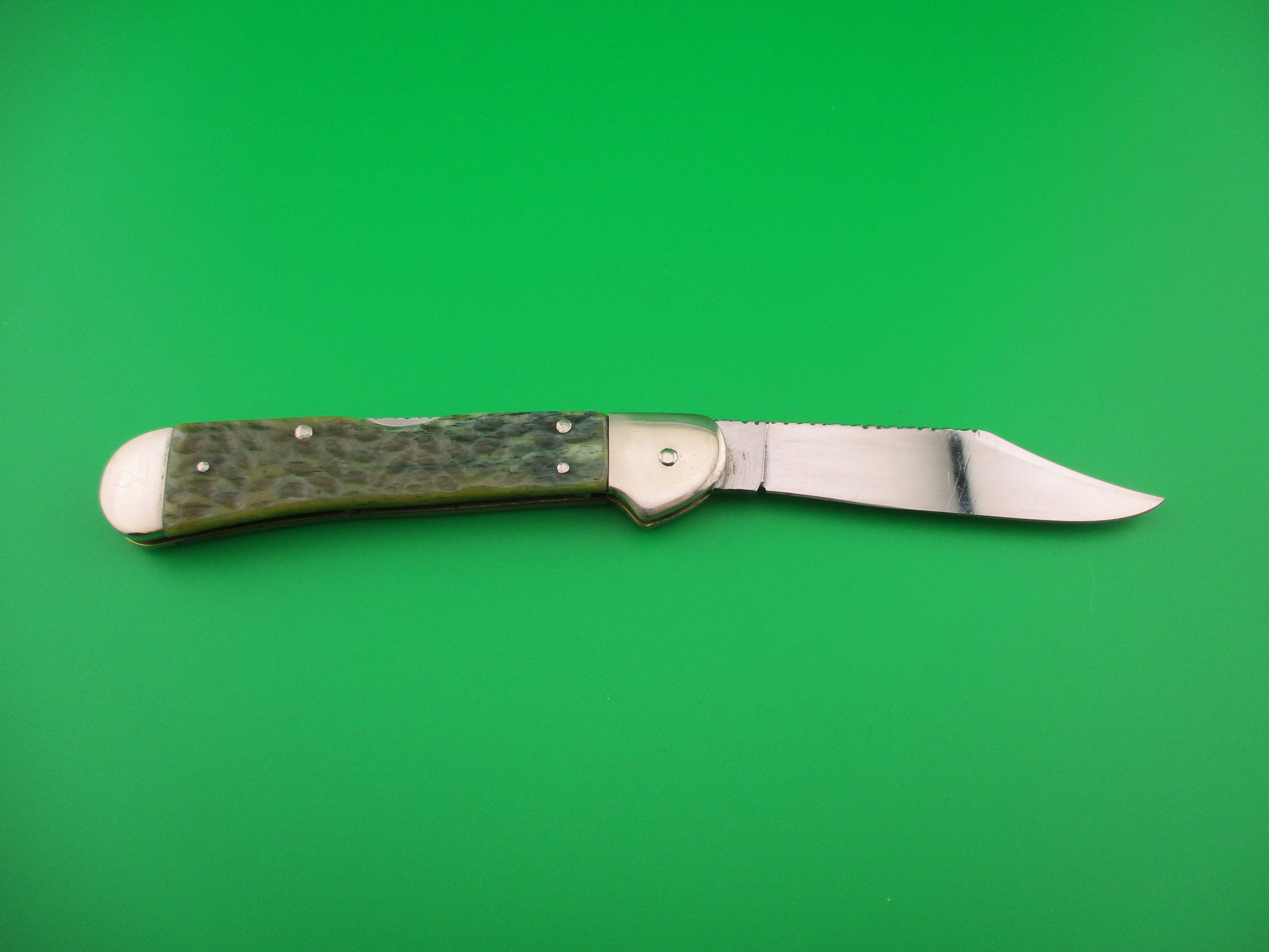 Vintage CASE XX USA 61549L SS 4.25 inch Copperlock Greenbone Converted DA switchblade lockback knife with file worked backspring and blade spine. Nicely converted to double action automatic knife with the shield as the release button. Can be opened manually or automatically (double action in this case). Knife measures 4.25 inches closed and 7 3/8 inches open with coined brass liners and nickel silver bolsters, button & pins. The clip blade is 99% full, or better with much of the original factory finish intact with lots of light scratches, file work on the spine and is stamped CASE XX USA 61549L SS on the tang. The scales (handles) are jigged green bone and in excellent condition and back spring has filework. The knife works great with blade tip well below liners closed, good snap and Tight lockup open. EX- condition.