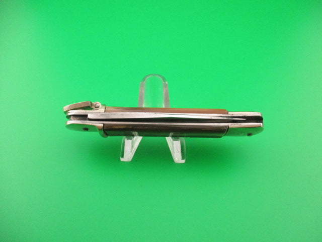 CCC GERMANY 10cm German Lever Genuine Horn handled Vintage automatic knife most likely made before 1980. The knife measures 10.4cm closed and 17.6cm (7 inches) open with steel liners and thin German silver bolsters and lever with brass pins. The clip blade is 96% full or better with light scratches and a little light spotting and the tang is stamped CCC in a diamond over GERMANY. The scaled (handles) are genuine Carmel & Cream Horn with some brown on the back and in nice condition. The knife works well with blade tip deep & centered closed, good snap and excellent lockup with about 1/16" up and down at the tip with springback. No rattle if shaken with blade open. EX- condition