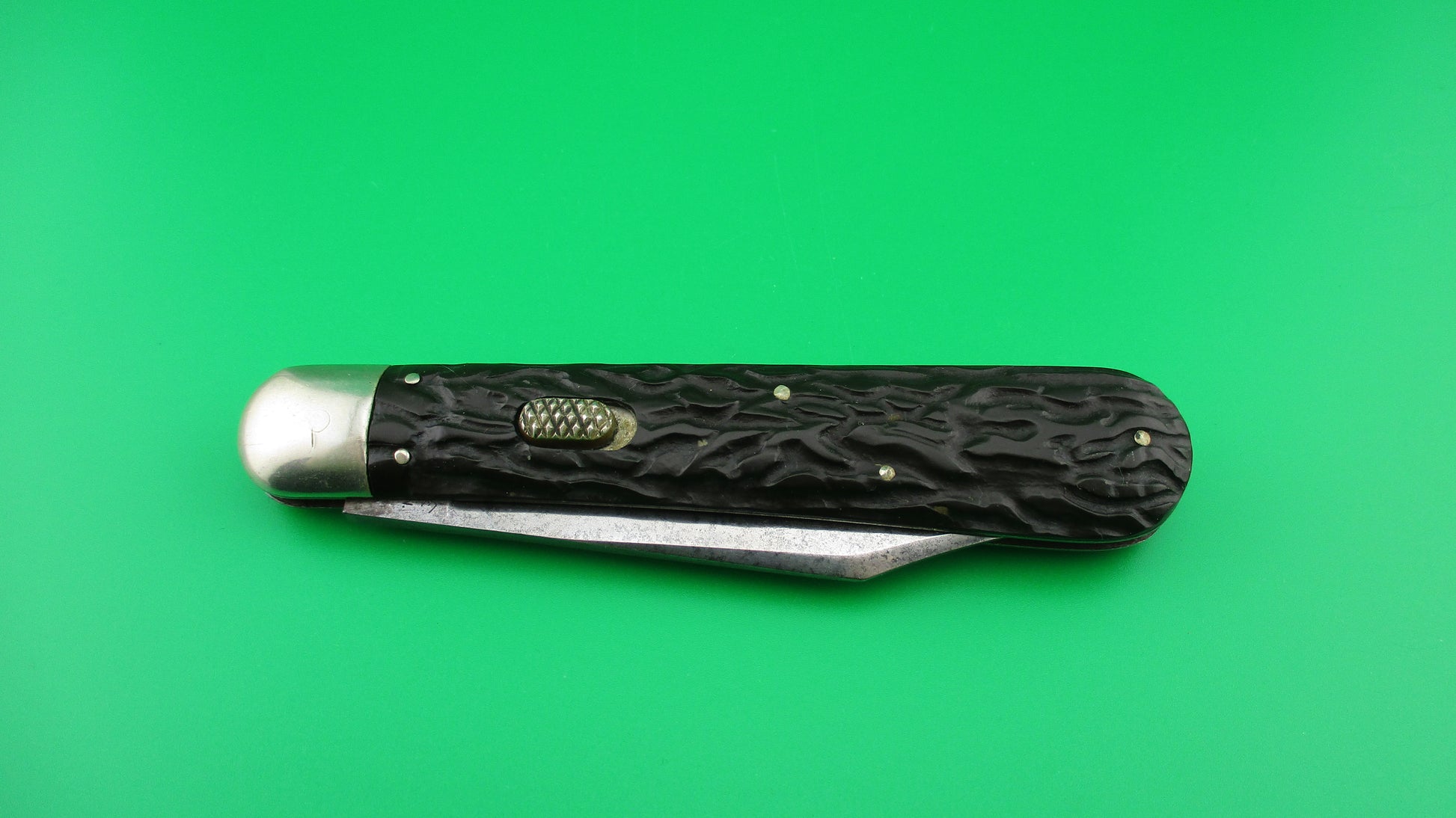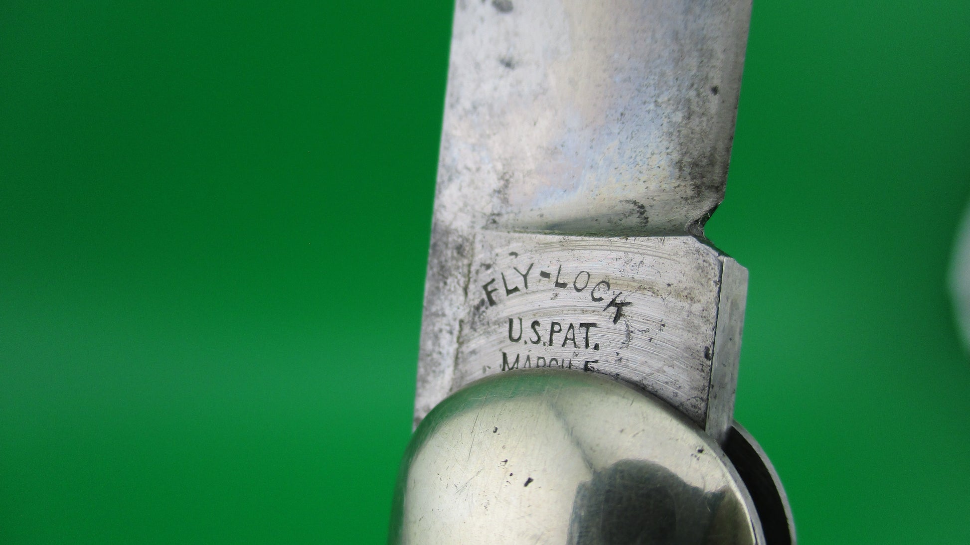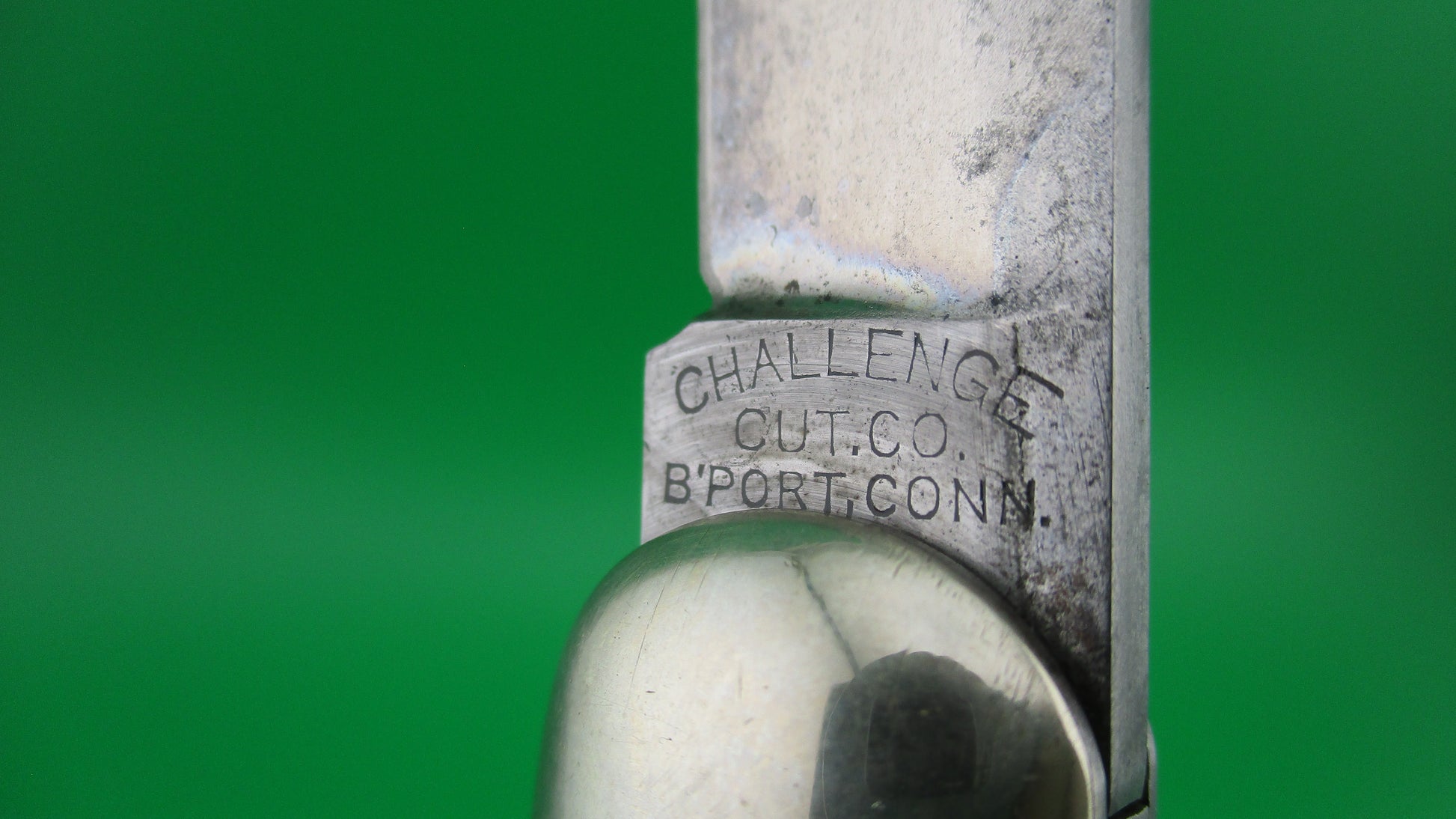 Antique CHALLENGE CUT CO FLYLOCK Hunter Black Switchblade knife made in Bridgeport, CT between 1917 and 1924. The knife measures 5 inches closed and 8 5/8 inches open and has steel (iron) liners and nickel silver bolsters and button. The clip blade is mostly full at about 98% and mostly shiny with light scratches, light spotting and light peppering, overall a nice blade. The tang is stamped CHALLENGE CUT CO B'PORT CONN and the reverse is stamped FLY-LOCK in an arch over US PAT MAR 5, 1918. The black wormgroove scales are most likely bakelite and in excellent condition. Knife works well with blade tip Deep and centered in the well, good snap and good lockup with about 1/16" each way at the tip. Does rattle if shaken with the blade open as most of these 100+ year old switchblades do. Safety is that you have to push down on the button to slide it to open and works fine. EX- condition.