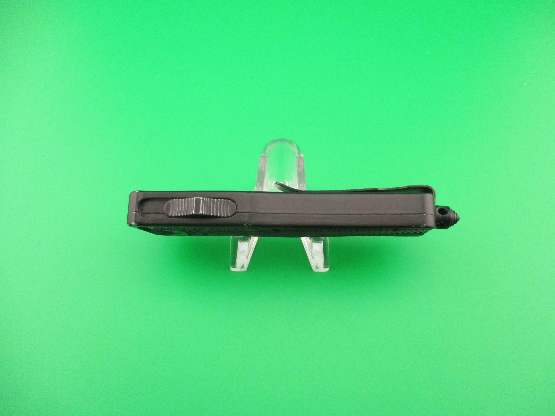 Contemporary Cobratech CTK-1 SBCTK-1SDNS 7 inch Black Drop point OTF DA automatic knife in original plastic box with cards from the factory. The is a "lightly used" knife in original box. It measures 7 inches open and 4.25 inches closed (including glass breaker) with black Zinc-aluminum alloy handle. The drop point blade is made of D2 steel and is 100% full with original finish and marked D2 with Cobratech symbol. Very slight finish wear on the edges of the frame. Knife works great with blade firing strong and locking open when the switch (button/knob) is pushed forward and retracts fully when it's pulled backward. EX+ condition.