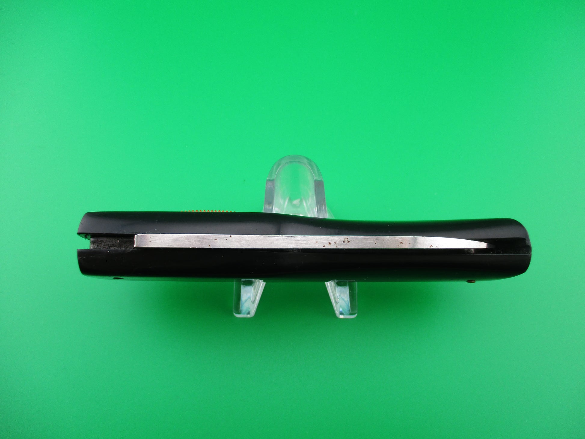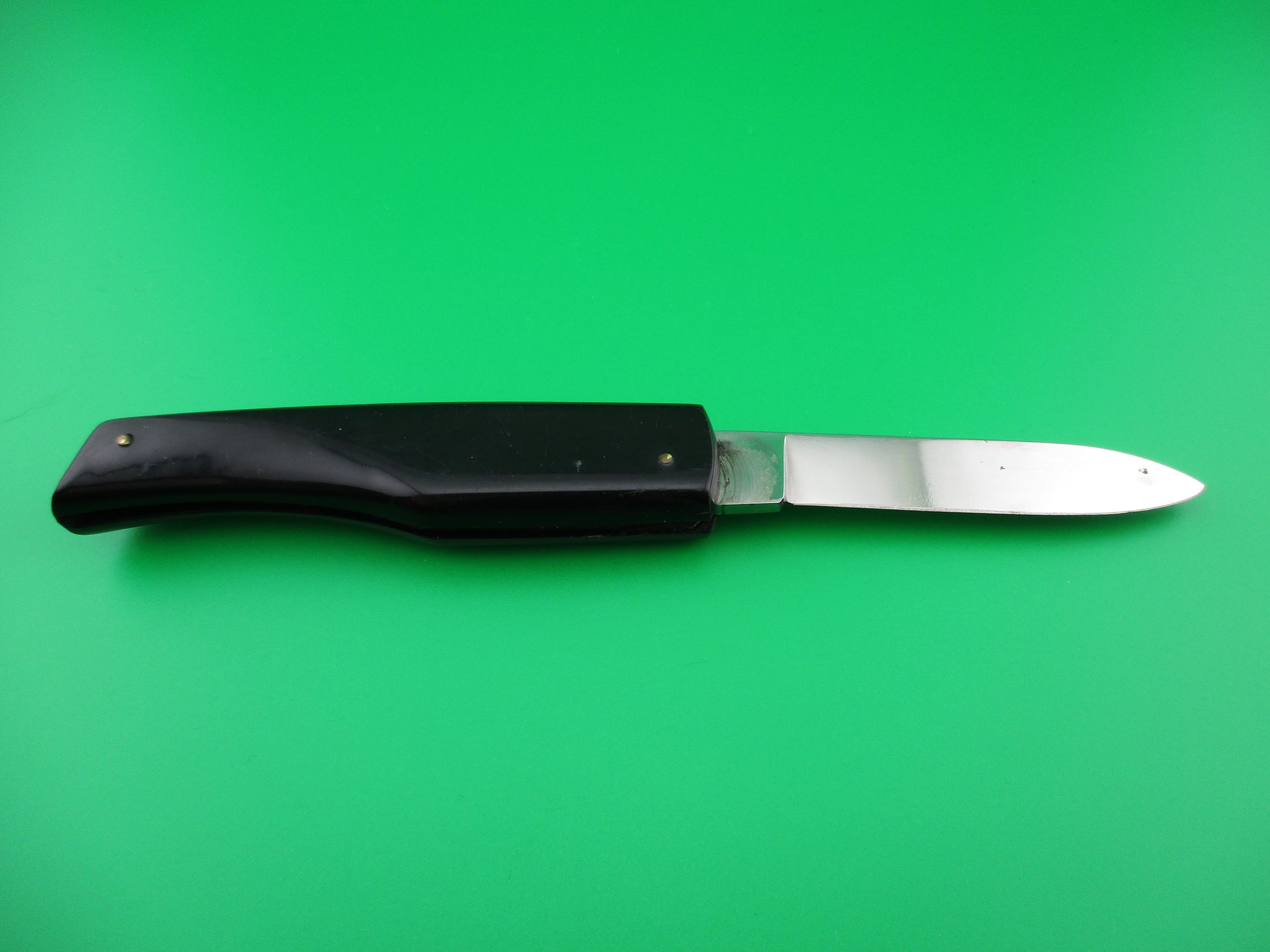 These are usually called Collini Flylock knives and they were made in Italy, but not sure when. I would guess 1970s. The knife measures a little under 20cm (8 inches) open and steel liners are inside the wrap around black plastic handle. The blade appears to be full with all of the original factory finish and is marked ROSTFREI PATENT. The handles are in good condition with some light scratches from handling. The knife works great with the blade tip seating deep in the well, strong smooth snap and tight lockup. The blade is thrown open by a spring loaded knob in the blade well. Neat design and would make a good EDC (every day carry).