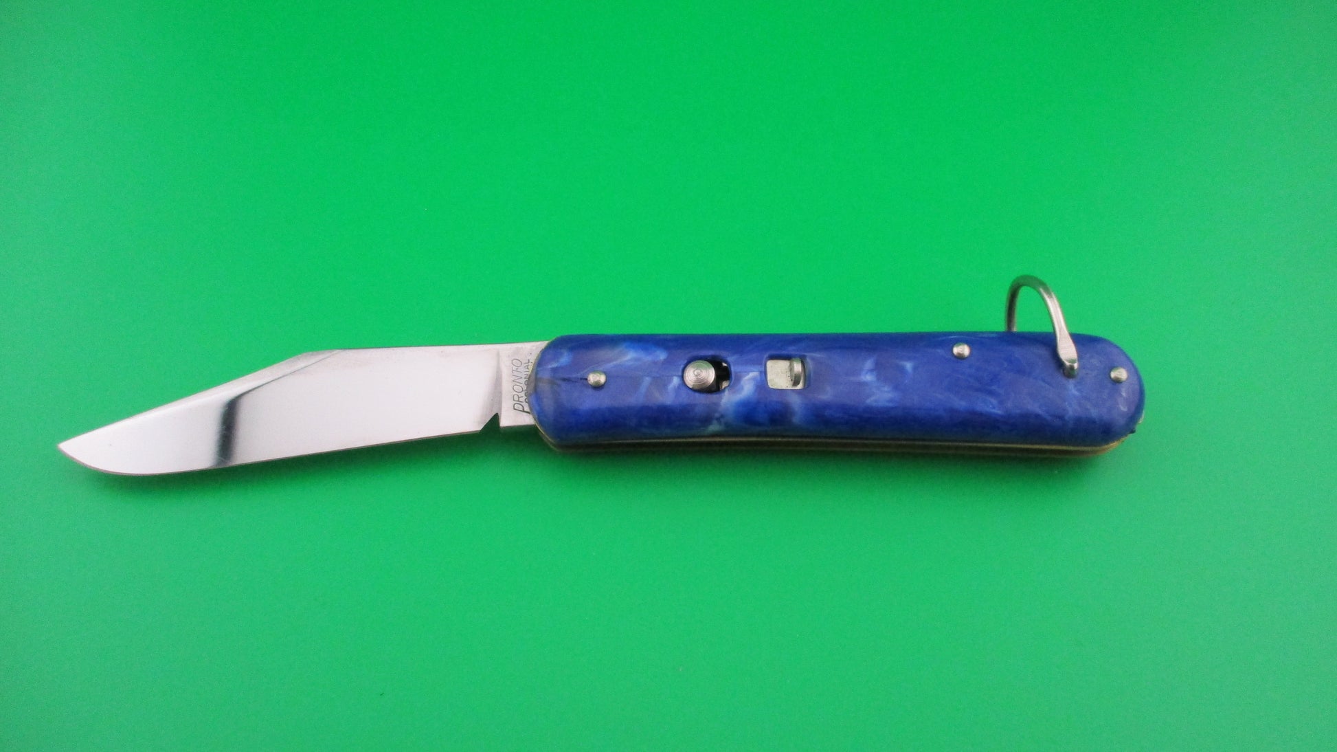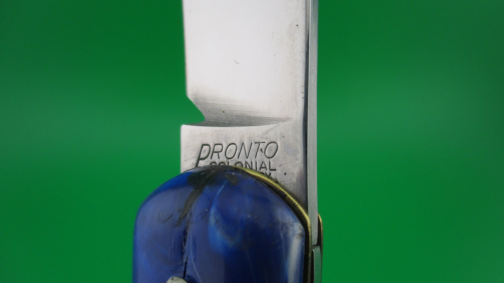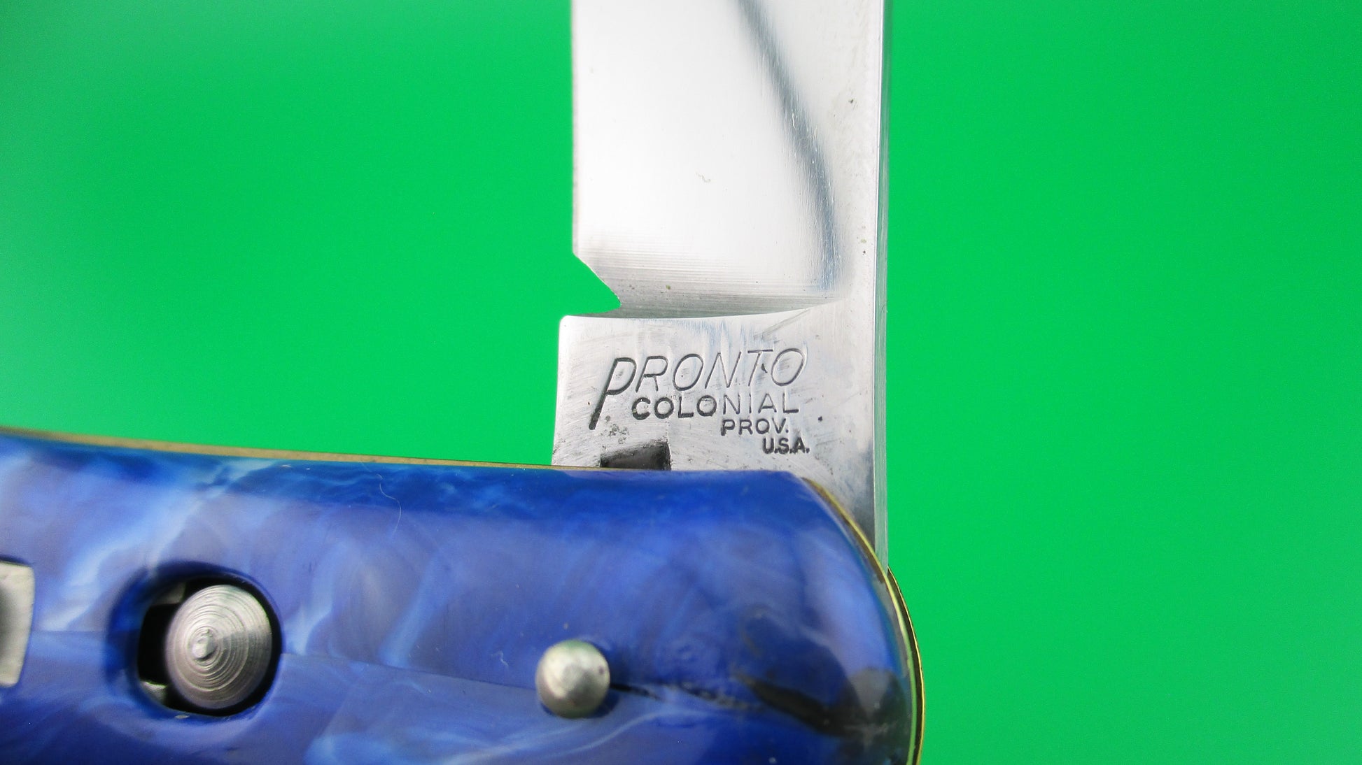 Vintage Colonial PRONTO fatjack switchblade with Blue swirl synthetic scales. The knife was made by the Colonial Knife Co of Providence, RI around 1950 and was only made for about 2 years until they changed the name stamped on this model from PRONTO to SHUR SNAP. This knife measures 4 1/8 inches closed and just over 7 inches open with brass liners. The blade is full with original factory finish and is stamped PRONTO COLONIAL PROV USA. The attractive synthetic Blue swirl scales are in very good condition with one well done crack repair at the top of the front scale and slight shrinkage. The knife works great with blade tip seating Deep and centered, strong snap and really good lockup when the blade is open. The safety works properly. Safety works. EX++ condition.