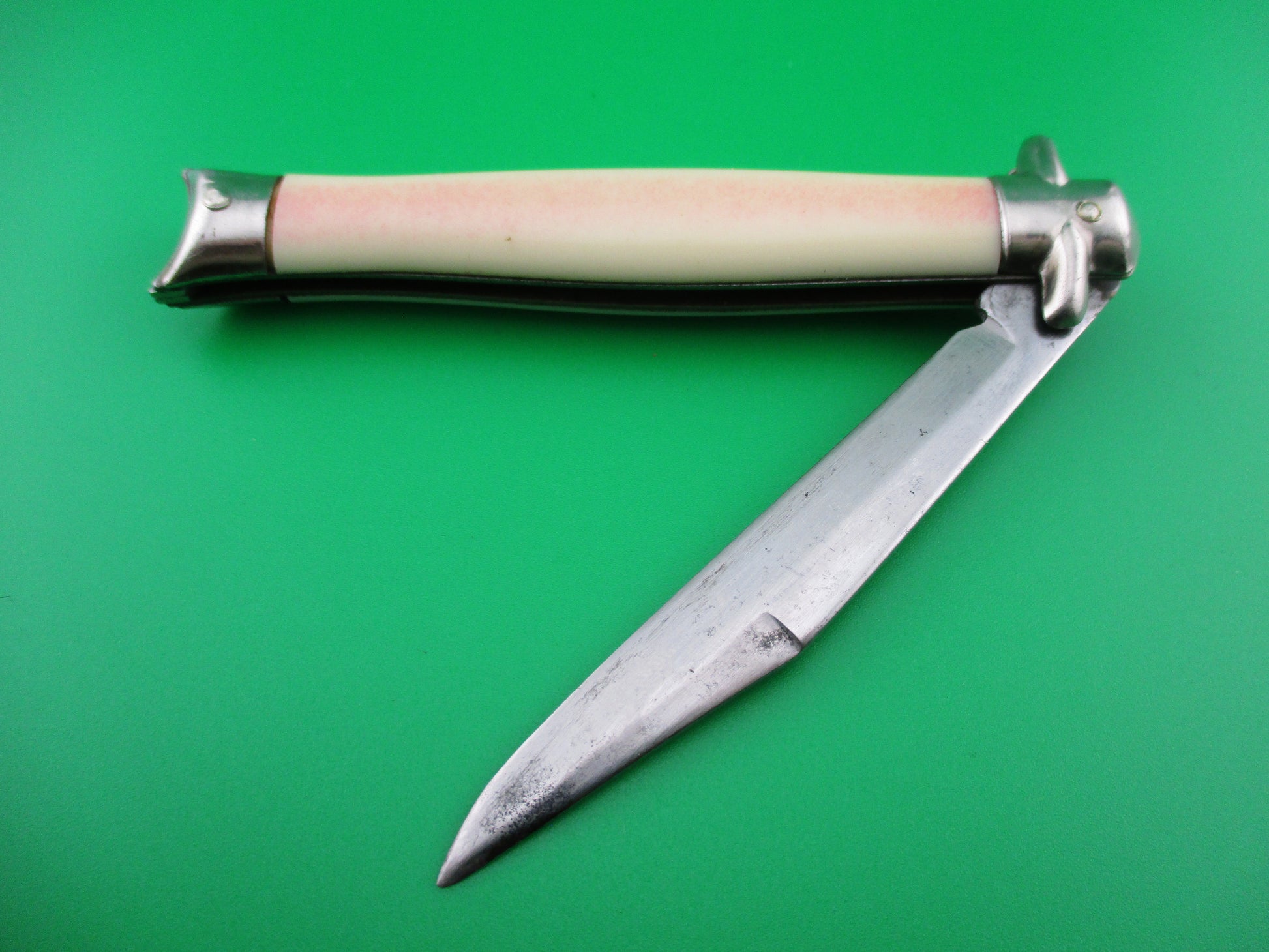 This is a Shur Snap bowtie switchblade with white synthetic scales. The knife was made by the Colonial Knife Co of Providence, RI in the late 1950s, likely 1956-58. It measures 4 inches closed and 7.25 inches open and has steel liners. The tang is stamped SHUR SNAP over Colonial over PROV USA. We can tell it's a later 4th gen knife by the large domed button. The blade is mostly full and has some light scratches, light patina and a bit of peppering, but good blade overall. The scales are in VG condition with no shrinkage. There is a light red streak on the back scale Operates well with blade tip deep closed, opens fully, but a little slow, and average lockup for these with some movement each way when open. Rattles if shaken when open as many of these do. Safety does not work.