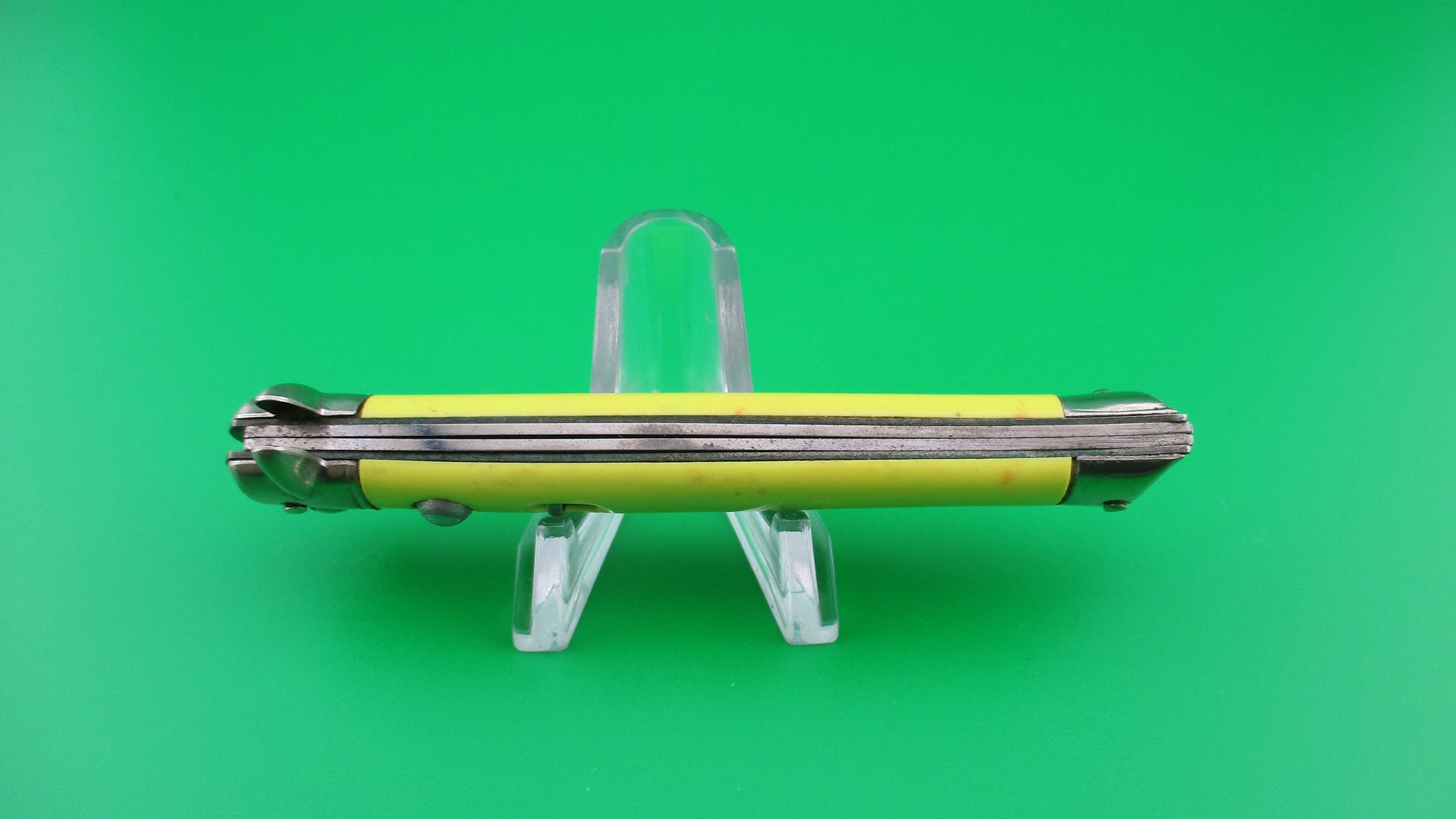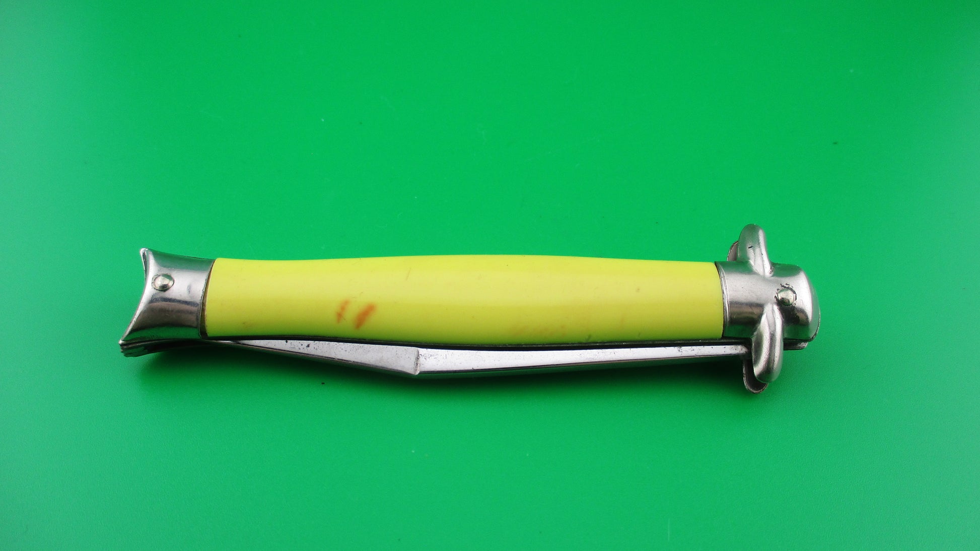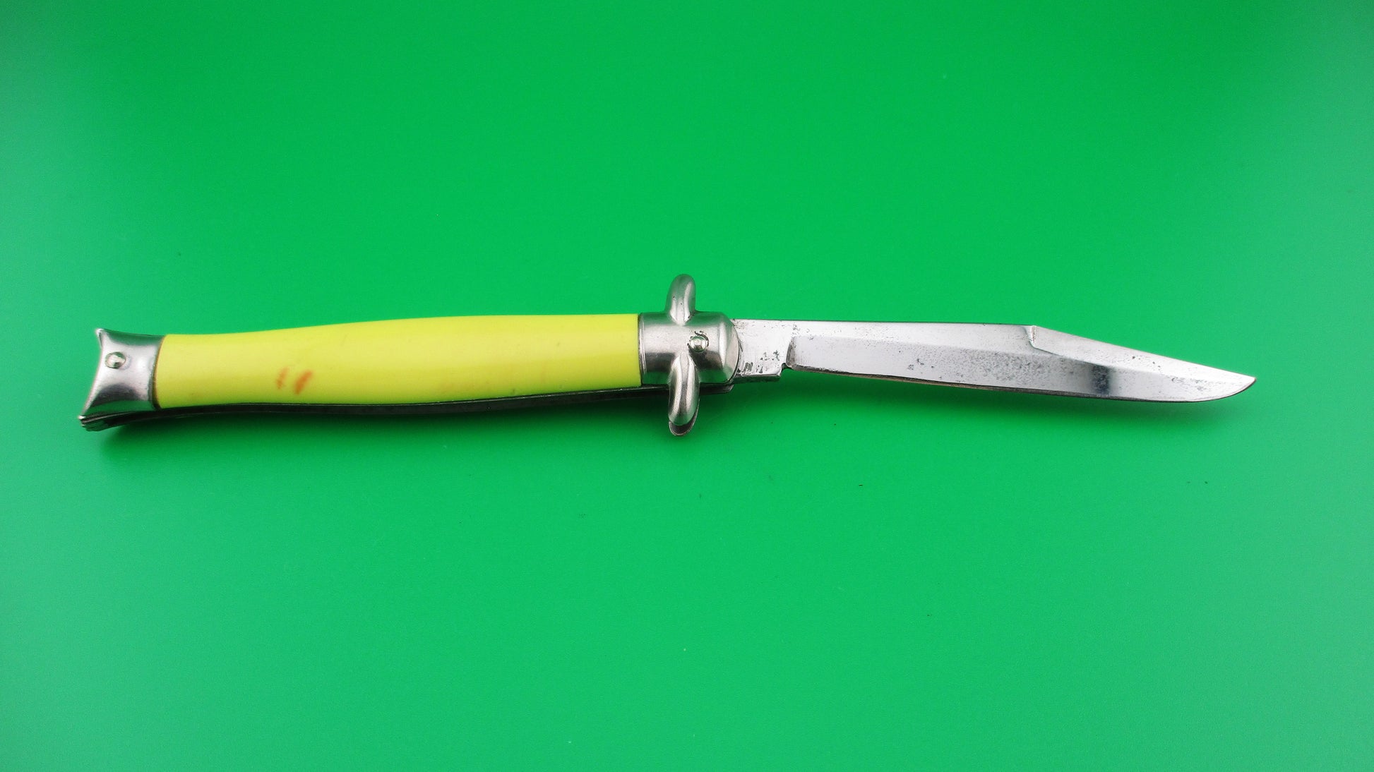 Colonial SHUR SNAP Bowtie Yellow 4th Generation vintage switchblade knife with yellow synthetic scales made by the Colonial Knife Co of Providence, RI in the late 1950s. It measures 4 inches closed and 7.25 inches open and has brass liners, steel bolsters & safety and aluminum domed button. The tang is stamped SHUR SNAP over Colonial over PROV USA. We can tell it's a later 4th gen knife by the large domed button. The blade is 100% full with original finish with some light scratches and light spotting. The pale yellow scales are in good condition with slight shrinkage and a couple of orange spots on the rear scale. Knife works well with blade tip sitting deep closed, good snap and good lockup with about 1/16 inch up and down at the tip and a bit of side to side. The knife does rattle if shaken. Safety works. EX+ condition.