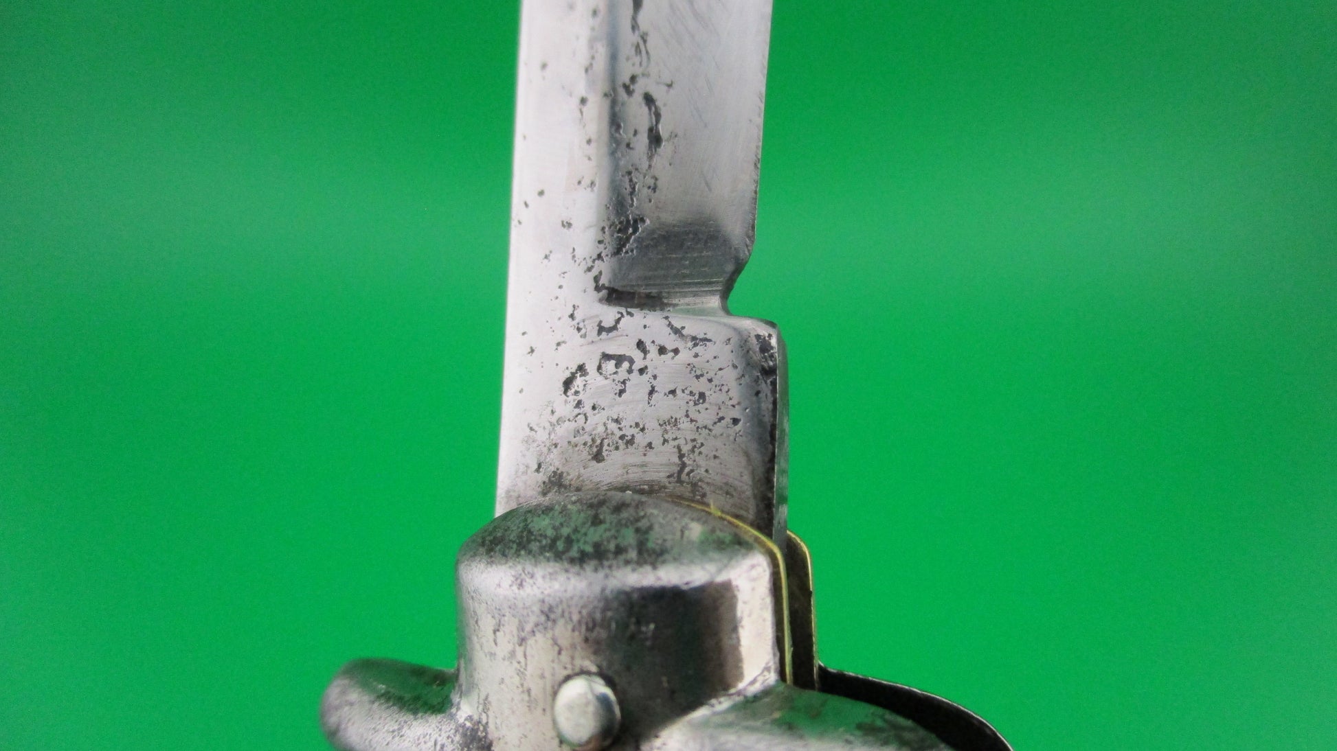 Vintage Shur-Snap bowtie switchblade #1800CB made by the Colonial Knife Co of Providence, RI in the mid 1950s. This is an early generation 3 model made before 1955 which we can date by the characteristics of small domed button and bolsters. This knife measures 4 inches closed and 7 1/8 inches open with brass liners, steel bolsters & button and nickel silver safety. The saber grind blade is mostly full (97%) and shiny with some scratches and shallow pitting and is stamped SHUR SNAP COLONIAL PROV USA on the tang. The scales are tan swirl synthetic and in very good condition with a little shrinkage near the bottom bolster on the back scale. The knife works well, tip about 1/16" above the liners closed, good snap and locks open with about 3/16" up and down and some side to side at the tip. Average lockup for these Shur Snap knives that have seen a fair amount of use over the years. Rattles if shaken with blade open. Safety does not work. VG- condition