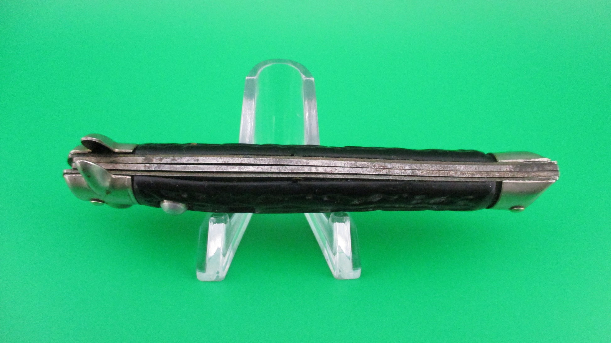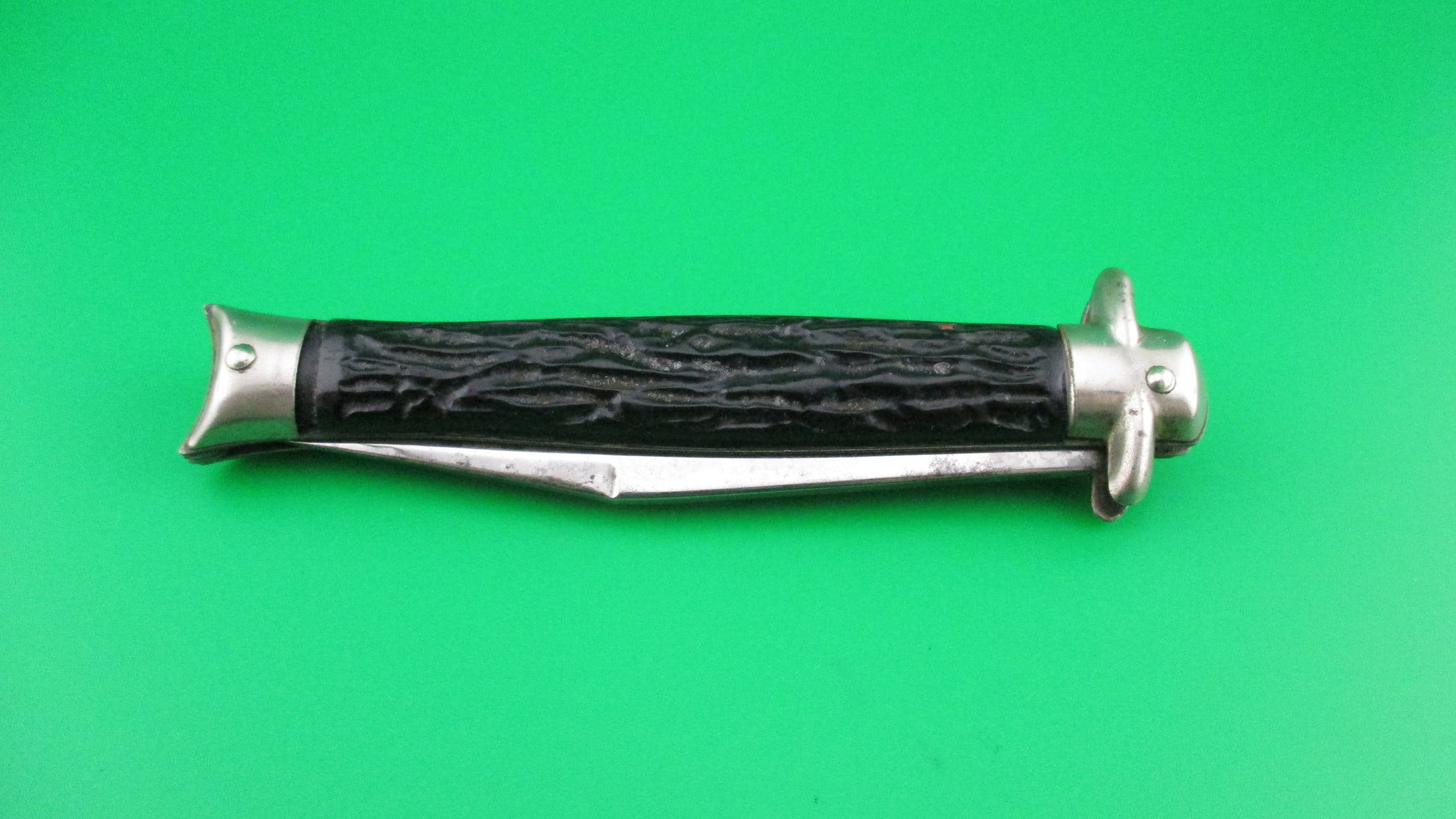 Vintage Shur Snap bowtie fishtail switchblade with Black imitation stag synthetic scales. This knife was made by the Colonial Knife Co of Providence, RI in the late 1950s, likely 1956-58 and designated the model 1800CB. It measures 4 inches closed and 7.25 inches open and has steel liners, bolsters and safety and Aluminum button. The saber grind blade is full with most of the original factory finish stamped SHUR SNAP over Colonial over PROV USA with lots of light spotting . We can tell it's a later 4th generation knife by the large domed button. The Black synthetic (imitation stag) scales are in nice condition with just a little shrinkage. Operates well with blade tip sitting deep closed, good snap and good lockup with about 1/16" up and down at the tip. Barely rattles if shaken with blade open. Could be cleaned to look like new. 100% money back guarantee including return shipping if you're not happy with this knife. Safety works. EX condition.