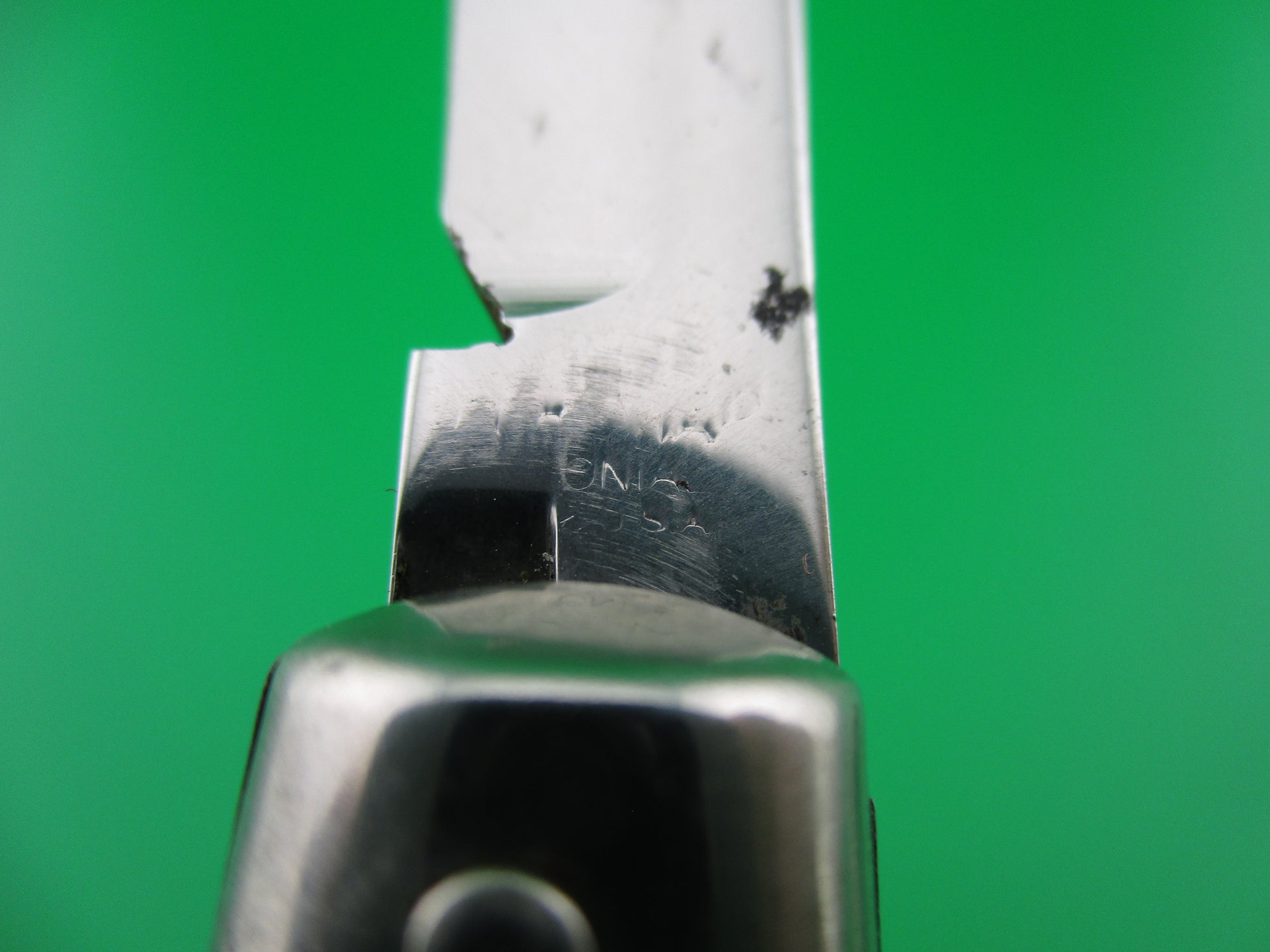 Vintage Shur Snap switchblade with yellow synthetic scales. The knife was made by the Colonial Knife Co of Providence, RI in the late 1950s, likely 1956-58. It measures 4 inches closed and 7.25 inches open and has brass liners. The tang is stamped SHUR SNAP over Colonial over PROV USA, but the stamp is very faint as it often seen on these late 50s knives. We can tell it's a later 4th gen knife by the large domed button. The blade is full and shiny with most of the factory finish intact with lots of very faint scratches. The bright yellow colored synthetic scales are in nice condition with no shrinkage. Operates well with blade tip sitting deep when closed, good snap and good lockup with just a little up and down at the tip. Safety works. EX+ condition. 100% money back guarantee including return shipping if you're not happy with this knife.