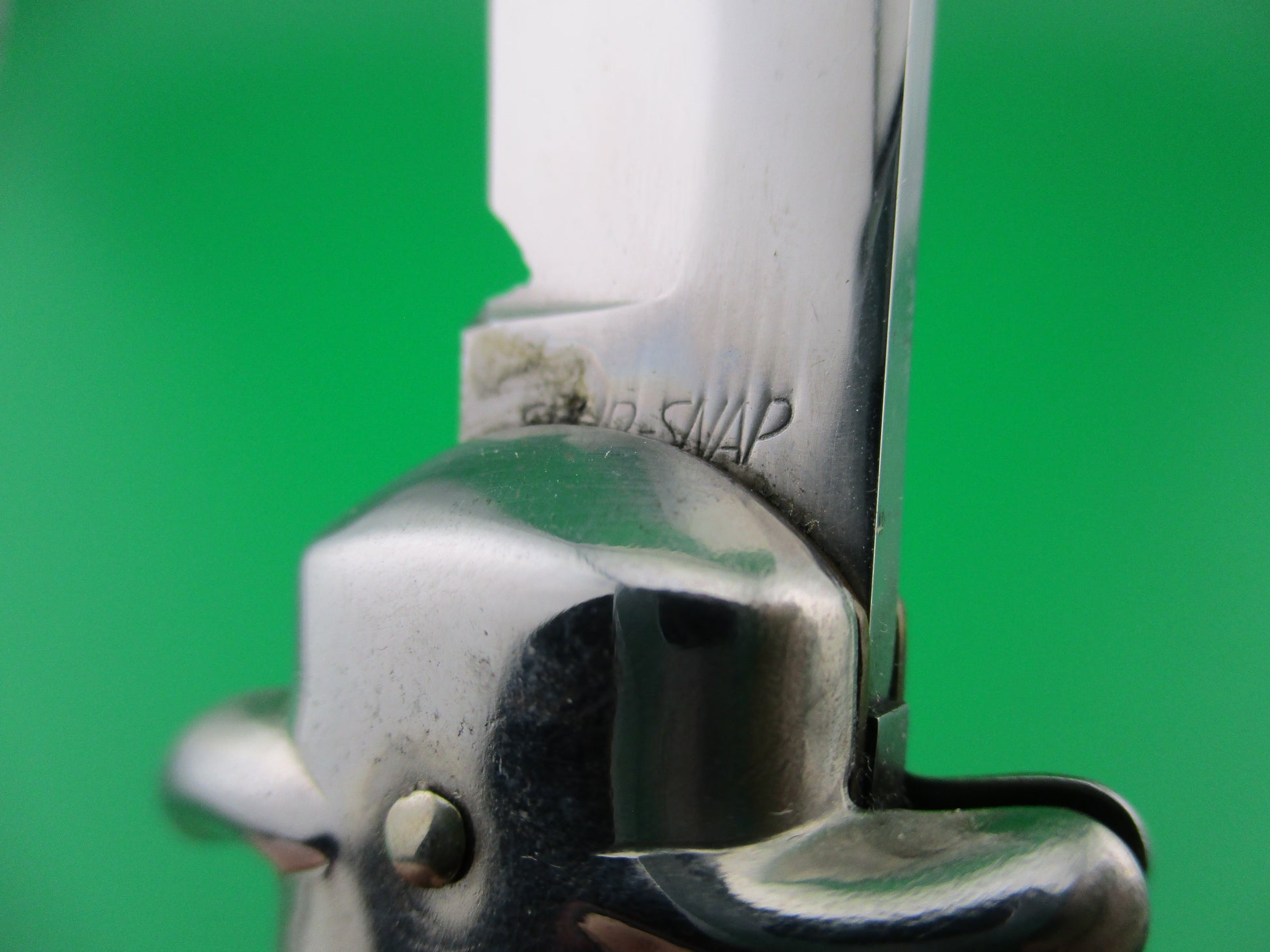 Beautiful Colonial SHUR-SNAP Stubby Fatjack automatic knife. This knife was made by the Colonial Knife Co of Providence, RI in the mid to late 1950s and was designated the model #2200B. It measures 4 1/8 inches closed and 7 1/8 inches open with brass liners and steel bolsters & button. The blade is Gorgeous & full with original factory finish and is stamped SHUR-SNAP COLONIAL PROV USA, though it's partially obstructed by the liners. The scales are brown swirl and are in great condition with just a little shrinkage, which most of these have after nearly 70 years. The knife works great with the blade tip seating deep, opens well and nice lockup. Safety works. This knife is in EX++ condition.