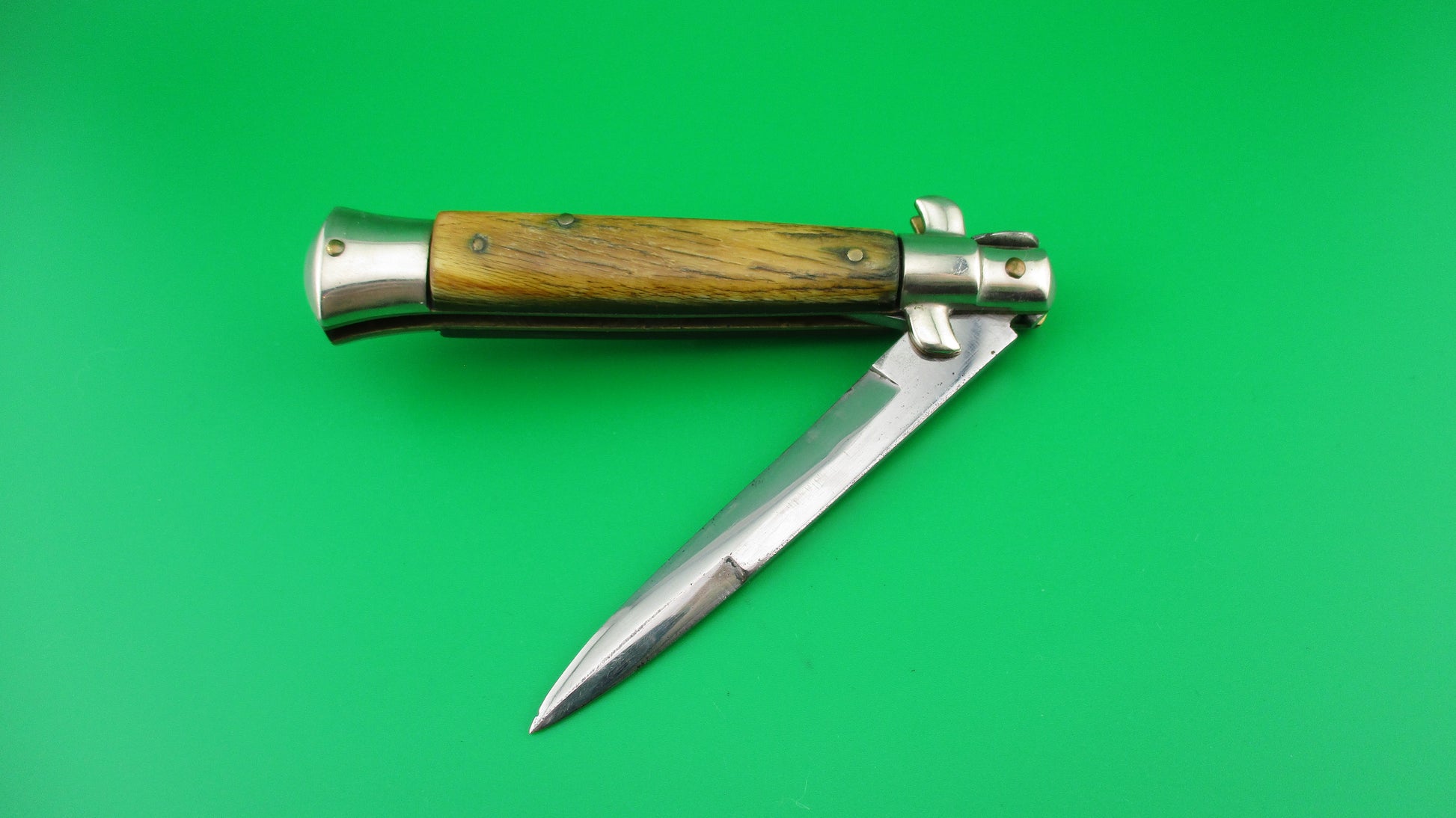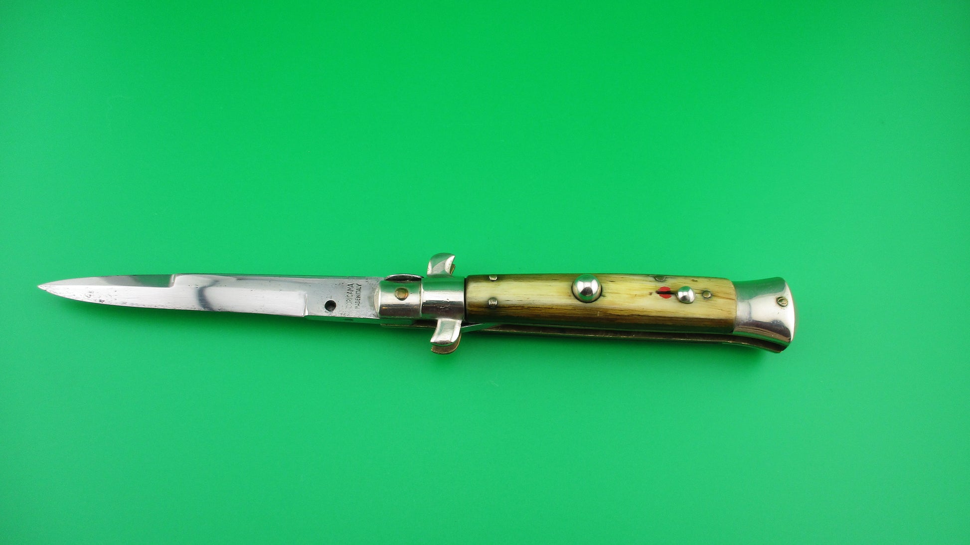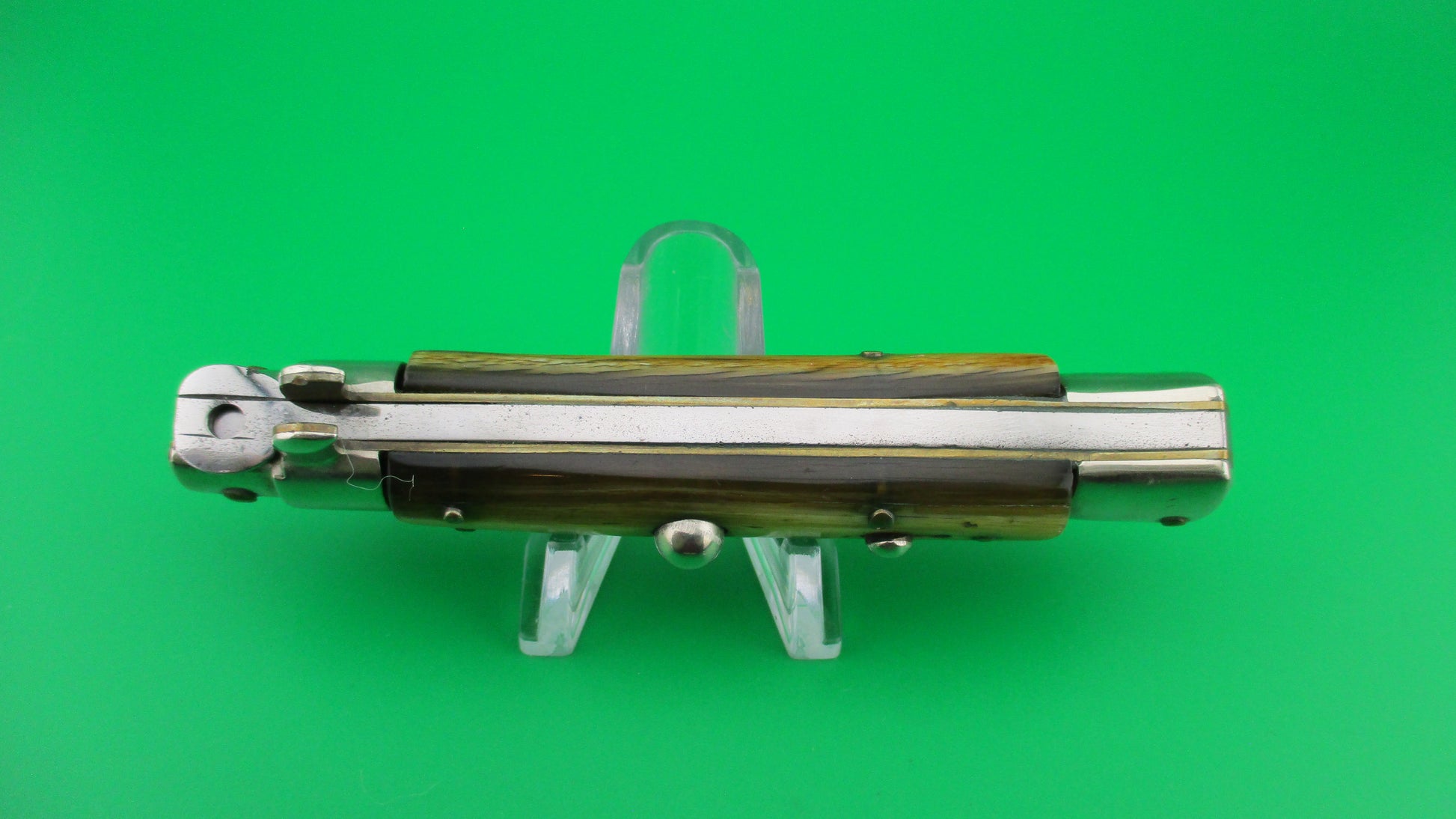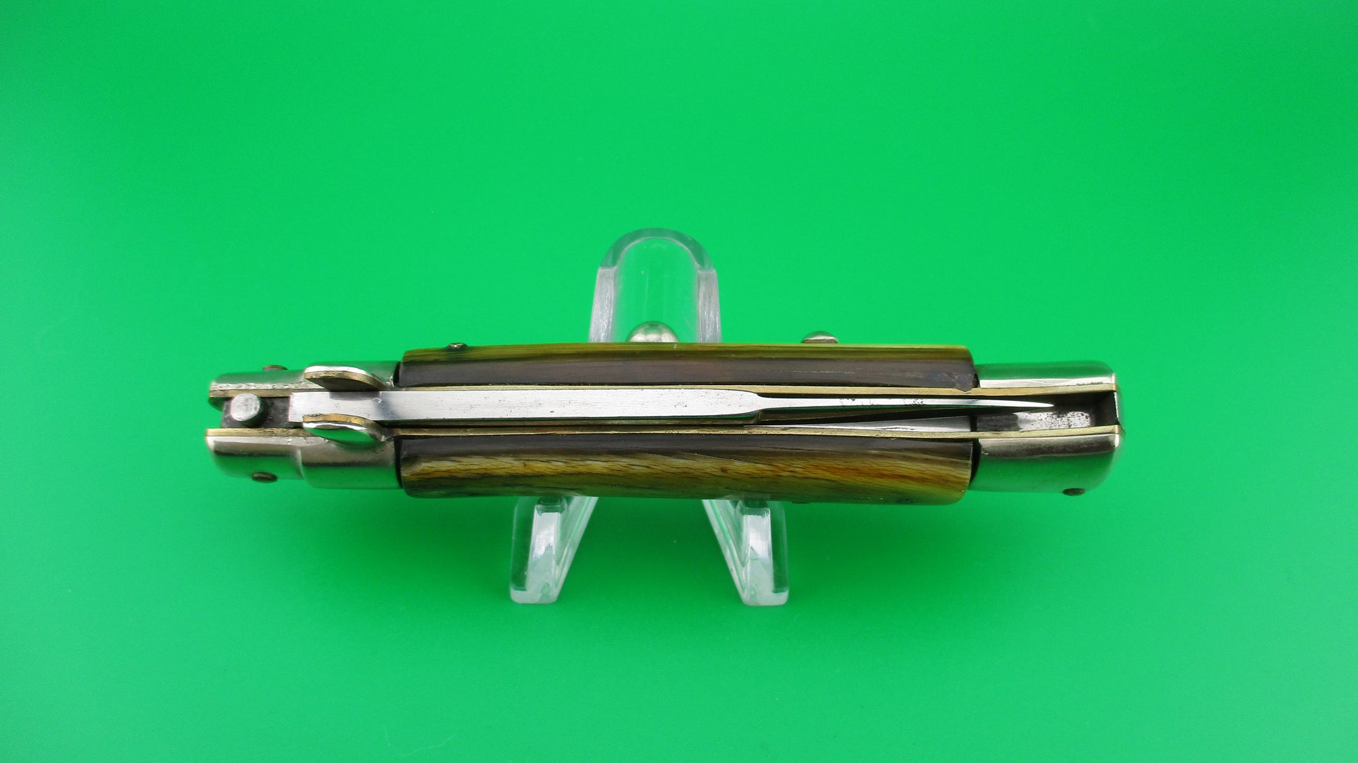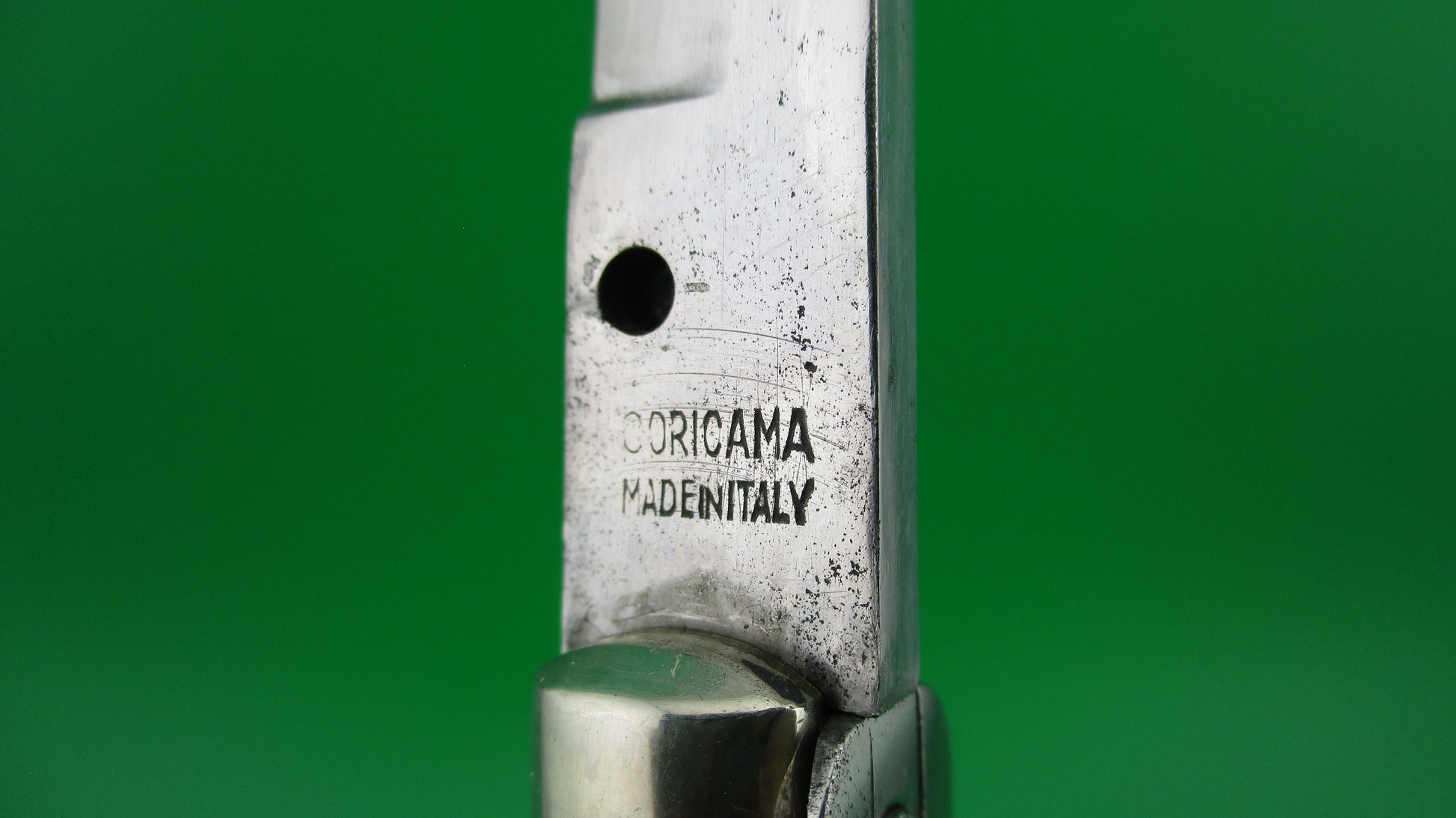Vintage CORICAMA 20cm Italian Picklock Horn Red Dot safety switchblade knife measures 19.8cm (7 7/8 inches) open with D Stamped brass liners and nickel silver bolsters, button and safety cap. Bayonet blade is mostly full and shiny with a little loss & ricasso stamped CORICAMA MADE IN ITALY. The horn scales are gorgeous with front scale mostly tan and cream and the back scale mostly tan and both have translucent green along the edges. Knife works great with blade tip below liners and centered, good snap and good lockup. Red dot safety works. VG+ condition.