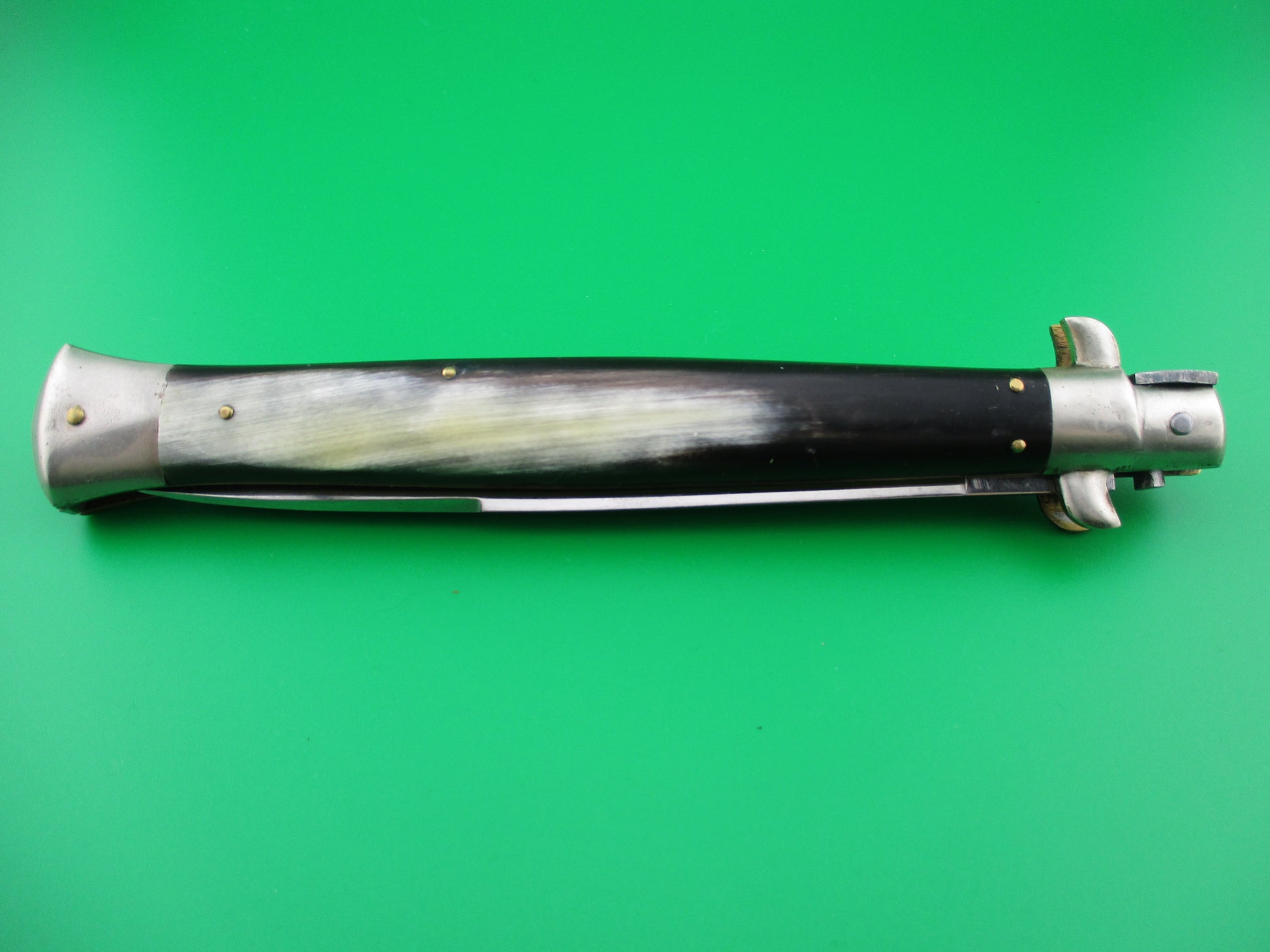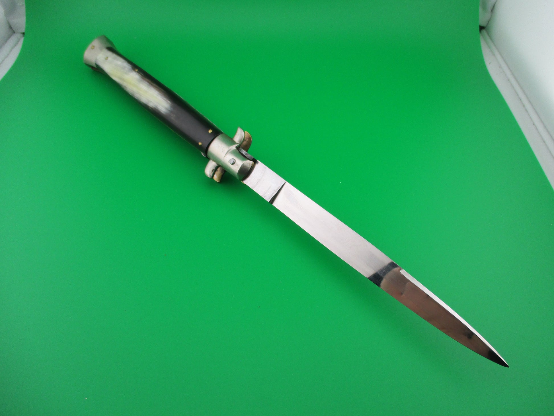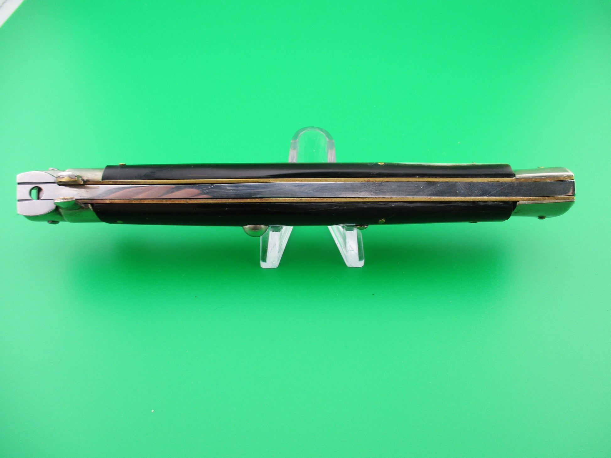 Vintage 33cm Italian transitional stiletto switchblade knife with Thick 5mm backspring/blade. The knife measures just over 13 inches open with brass liners and nickel silver bolsters, button and safety cap. The thick flat grind swedge blade is full with original factory finish and is marked CORICAMA INOXID on the ricasso. It is a swivel bolster, so you have to push down on the right front finger guard to pivot/swivel the bolster to release the blade for closing. The horn scales (handles) are in excellent condition and are mostly black with cream/white streaking on the rear scale and a Red dot safety. The knife works well with the blade tip seating Deep and centered, strong snap and great lockup. Safety works. Beautiful old Italian Coricama 13 inch transitional stiletto automatic knife.