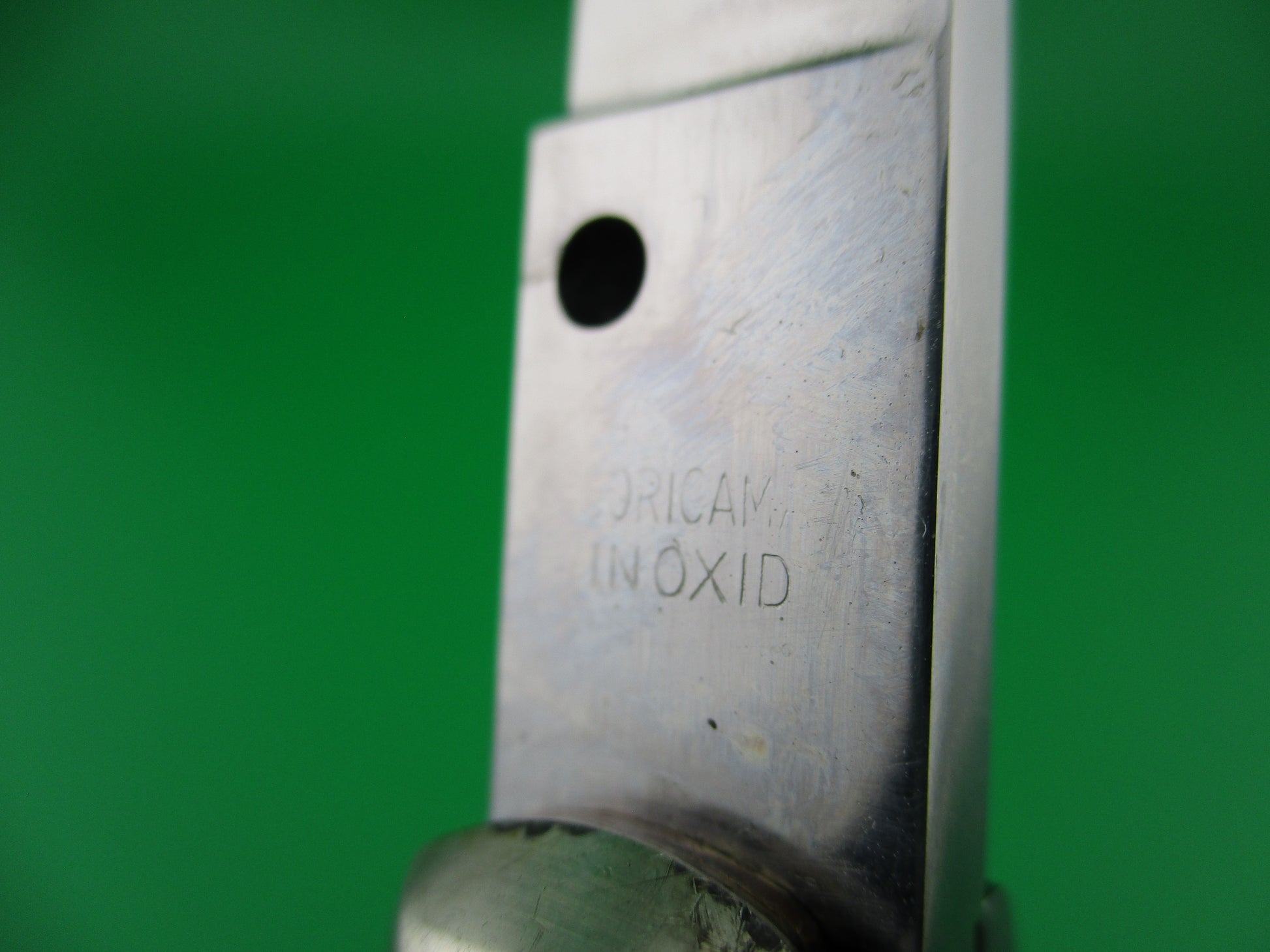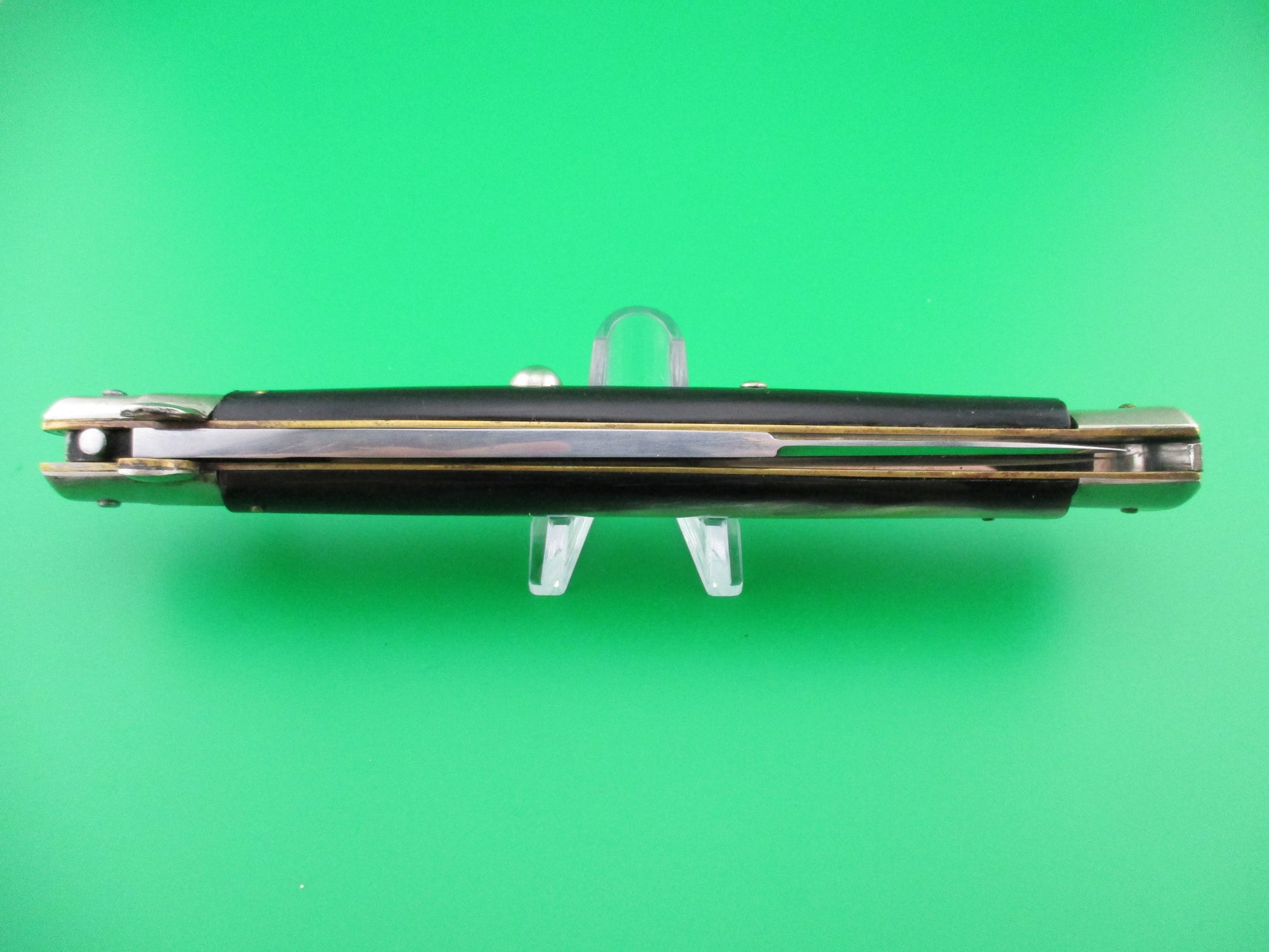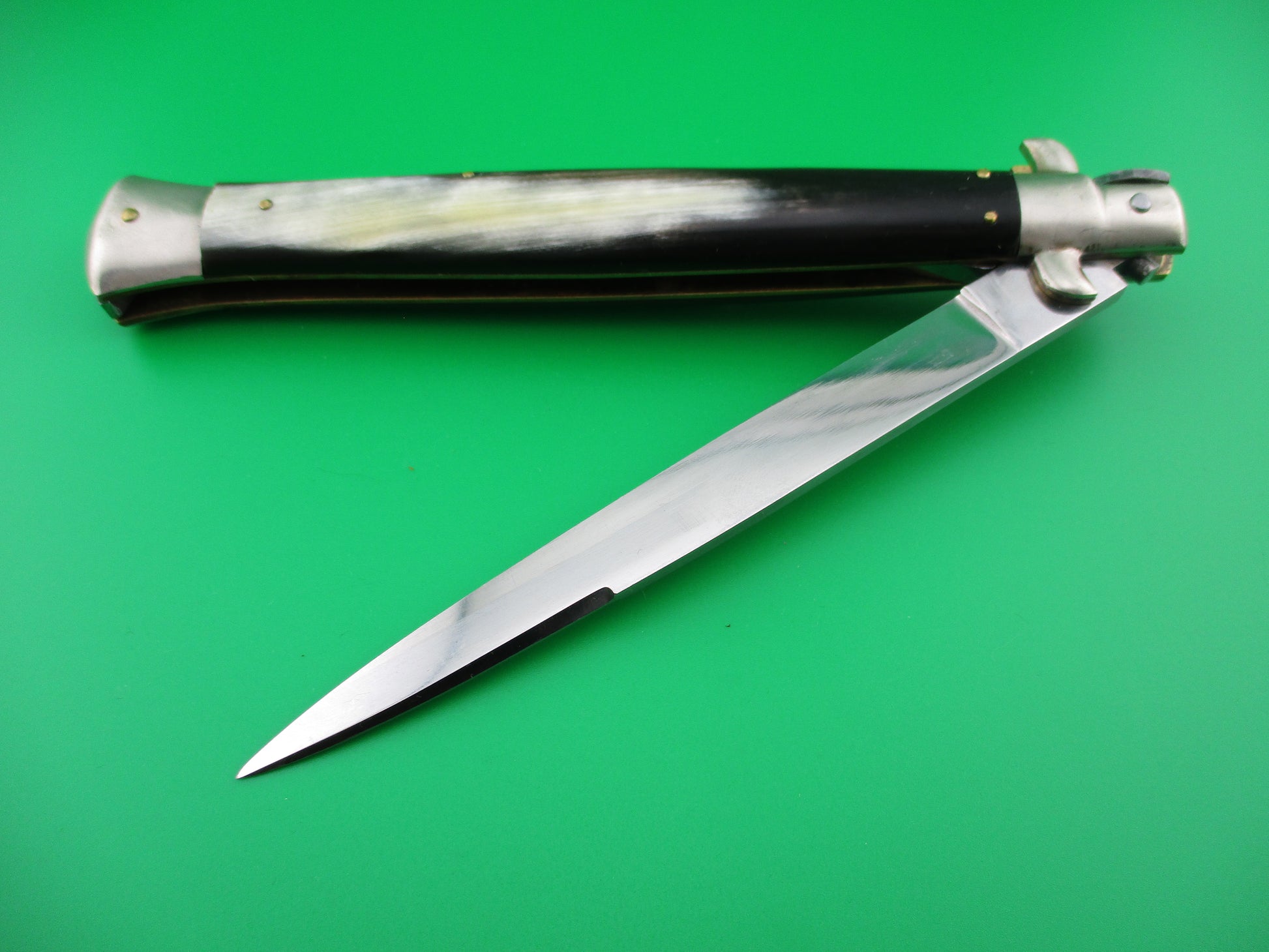 Vintage 33cm Italian transitional stiletto switchblade knife with Thick 5mm backspring/blade. The knife measures just over 13 inches open with brass liners and nickel silver bolsters, button and safety cap. The thick flat grind swedge blade is full with original factory finish and is marked CORICAMA INOXID on the ricasso. It is a swivel bolster, so you have to push down on the right front finger guard to pivot/swivel the bolster to release the blade for closing. The horn scales (handles) are in excellent condition and are mostly black with cream/white streaking on the rear scale and a Red dot safety. The knife works well with the blade tip seating Deep and centered, strong snap and great lockup. Safety works. Beautiful old Italian Coricama 13 inch transitional stiletto automatic knife.