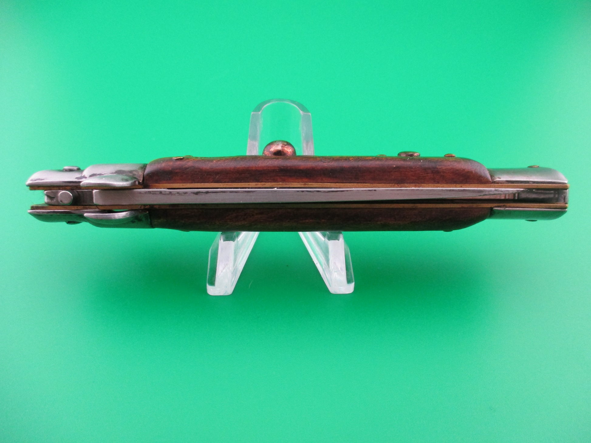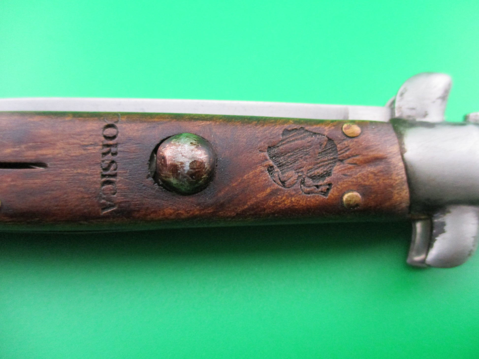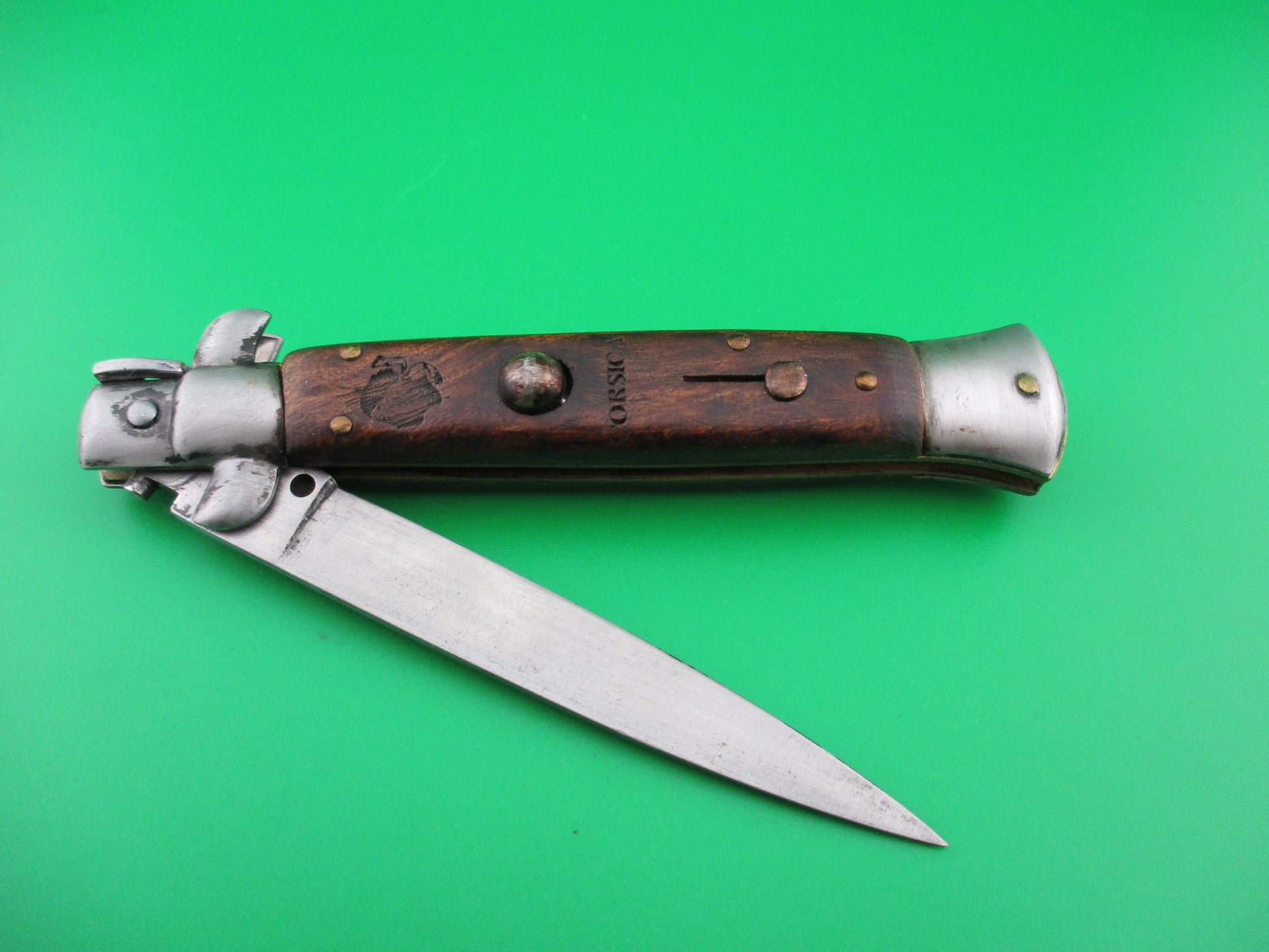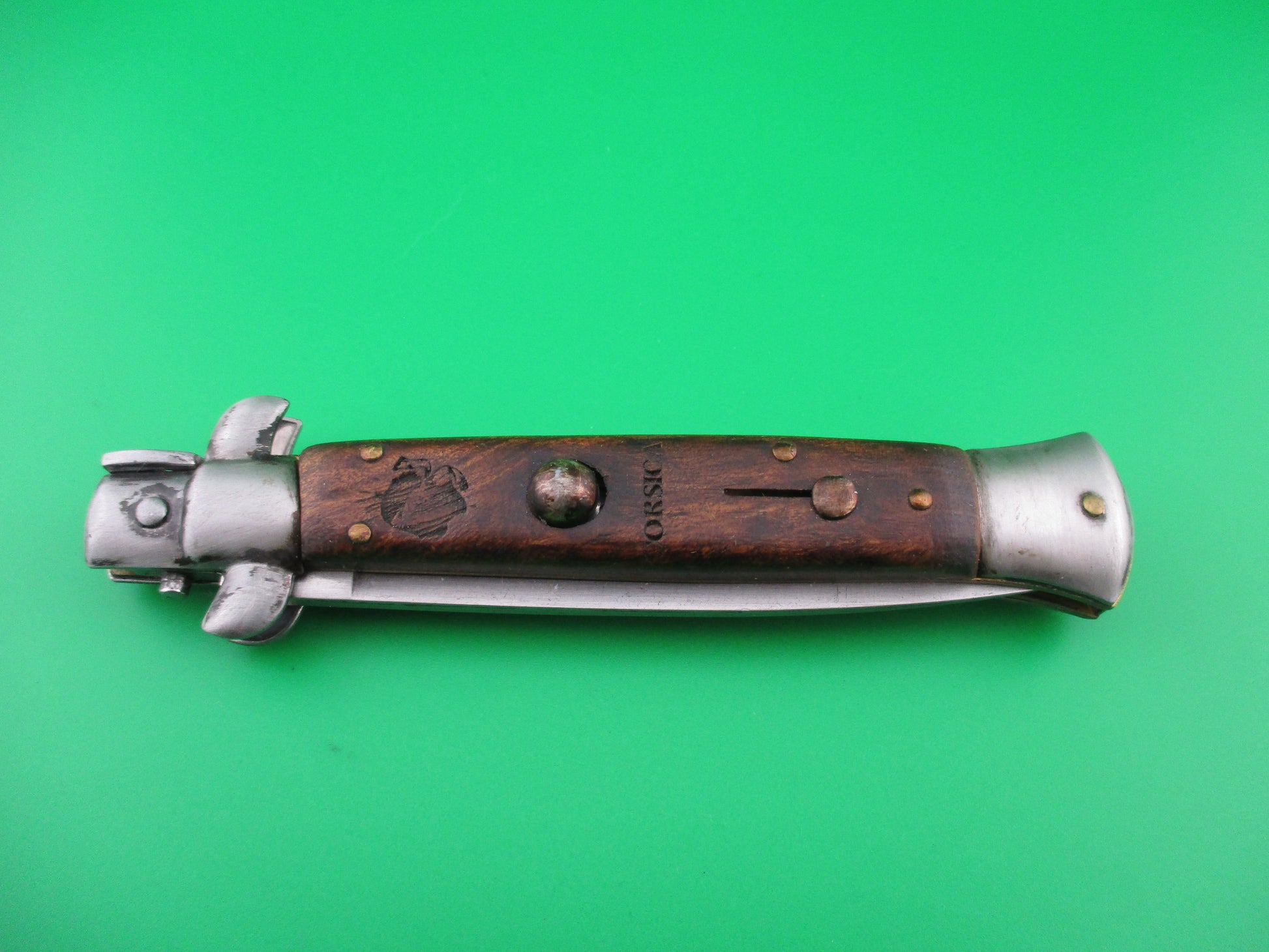 Corsican Vendetta 23cm Italian stiletto Swivel bolster automatic knife. This knife was made in Italy, most likely in the 1980s and commemorates the history and struggle of the Moor people of the island of Corsica. It measures a little over 22cm (8 7/8 inches) open with brass liners and steel bolsters. The blade is mostly full with patina and scratches and is etched with the word Vendetta and picture of a Moor's head. The wood scales have an emblem with a Corsican Moor's Head and the word Corsica stamped into them and are in good condition. The knife works well with the blade tip below liners closed, good snap and very good lockup. Looks like someone might have tried to age it a bit. Safety works. VG+ condition.