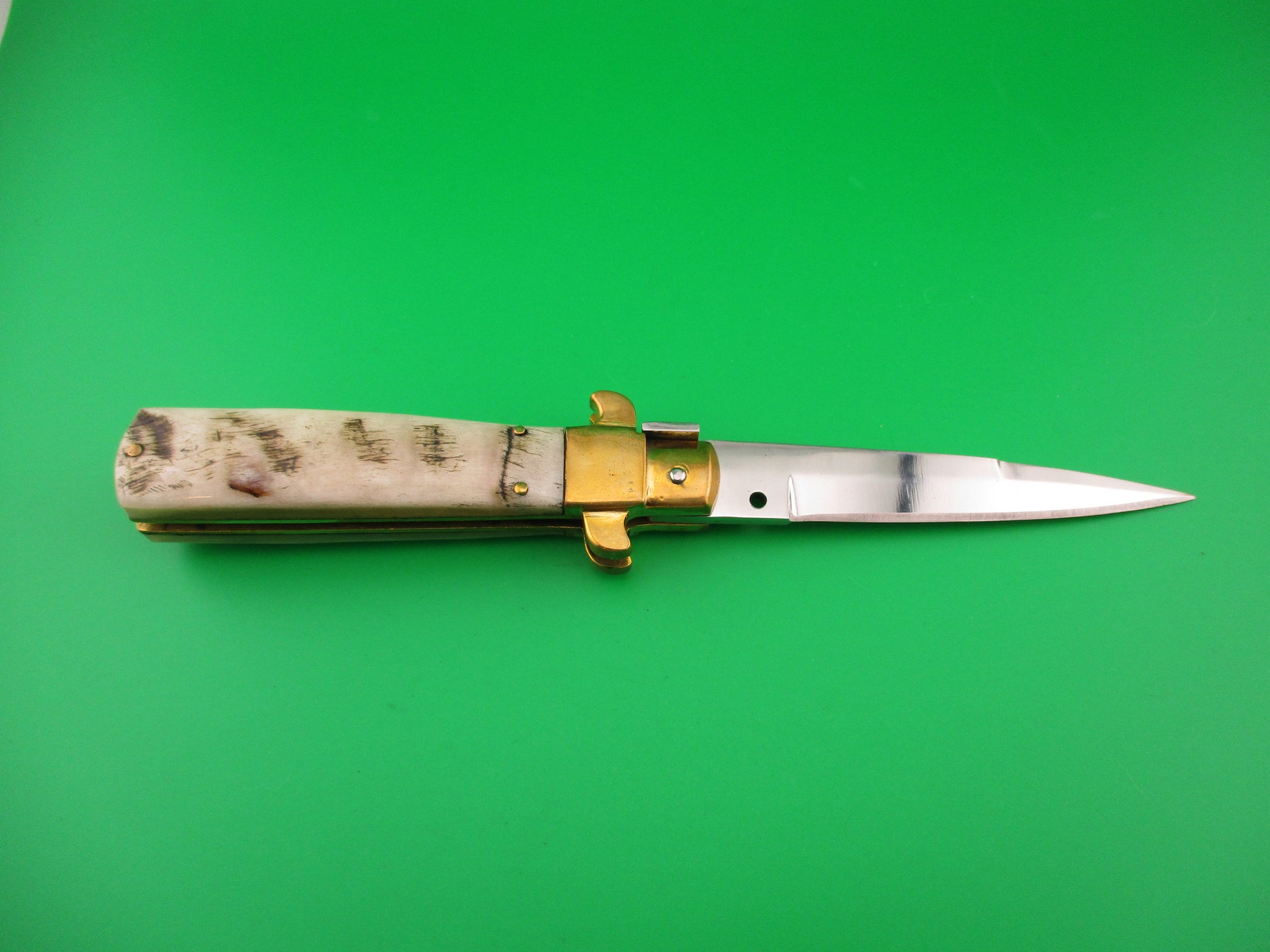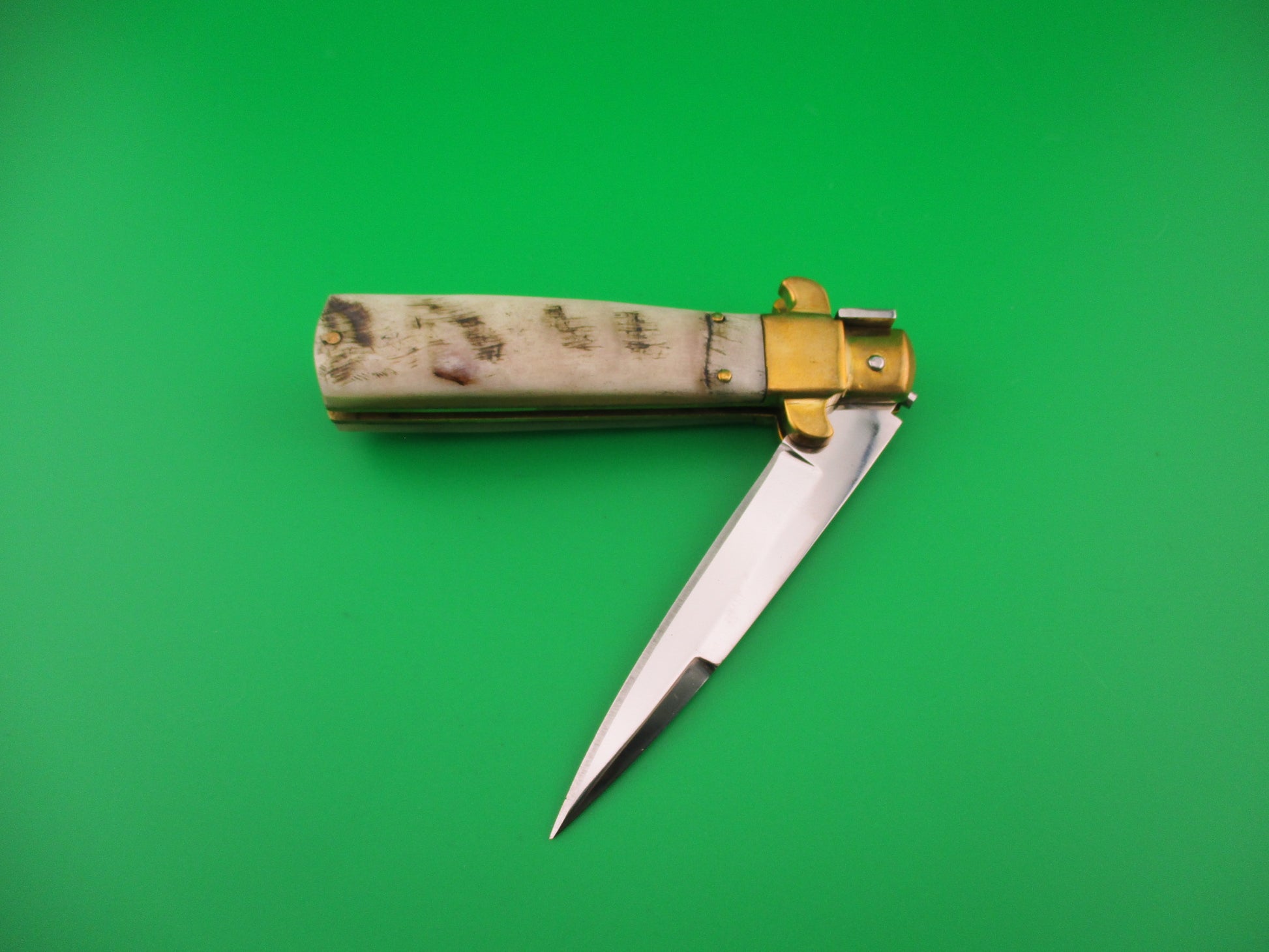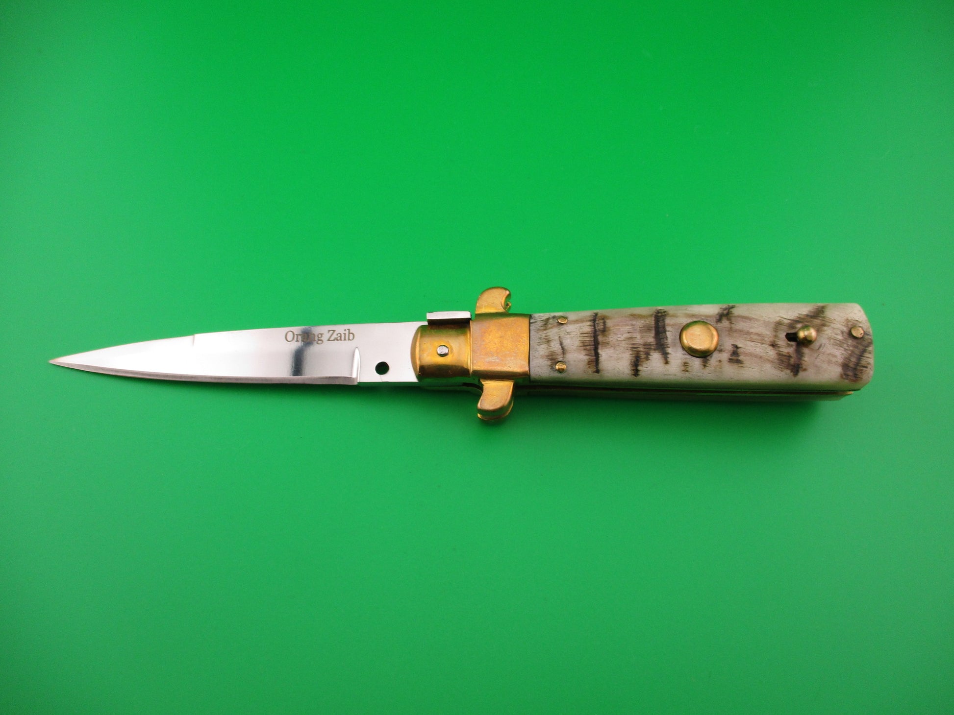 Custom 21cm Frosolone Style Horn handled picklock automatic knife by Orang Zaib a second generation knife maker. This knife is inspired by switchblade knives made in Frosolone Italy in the 1940s and 50s. It measures 21cm (8 3/16 inches) open and 4 3/8 inches closed with brass liners, bolsters, button, safety & scale pins. The bayonet style blade is full with original finish and is etched Orang Zaib along the spine. The genuine Ram's horn scales (handles) are in great condition and light colored with lots of character. The knife works Great with blade tip below the liners closed, nice smooth snap and tight lockup. Does not rattle if shaken with blade open. Safety works. Like new condition.