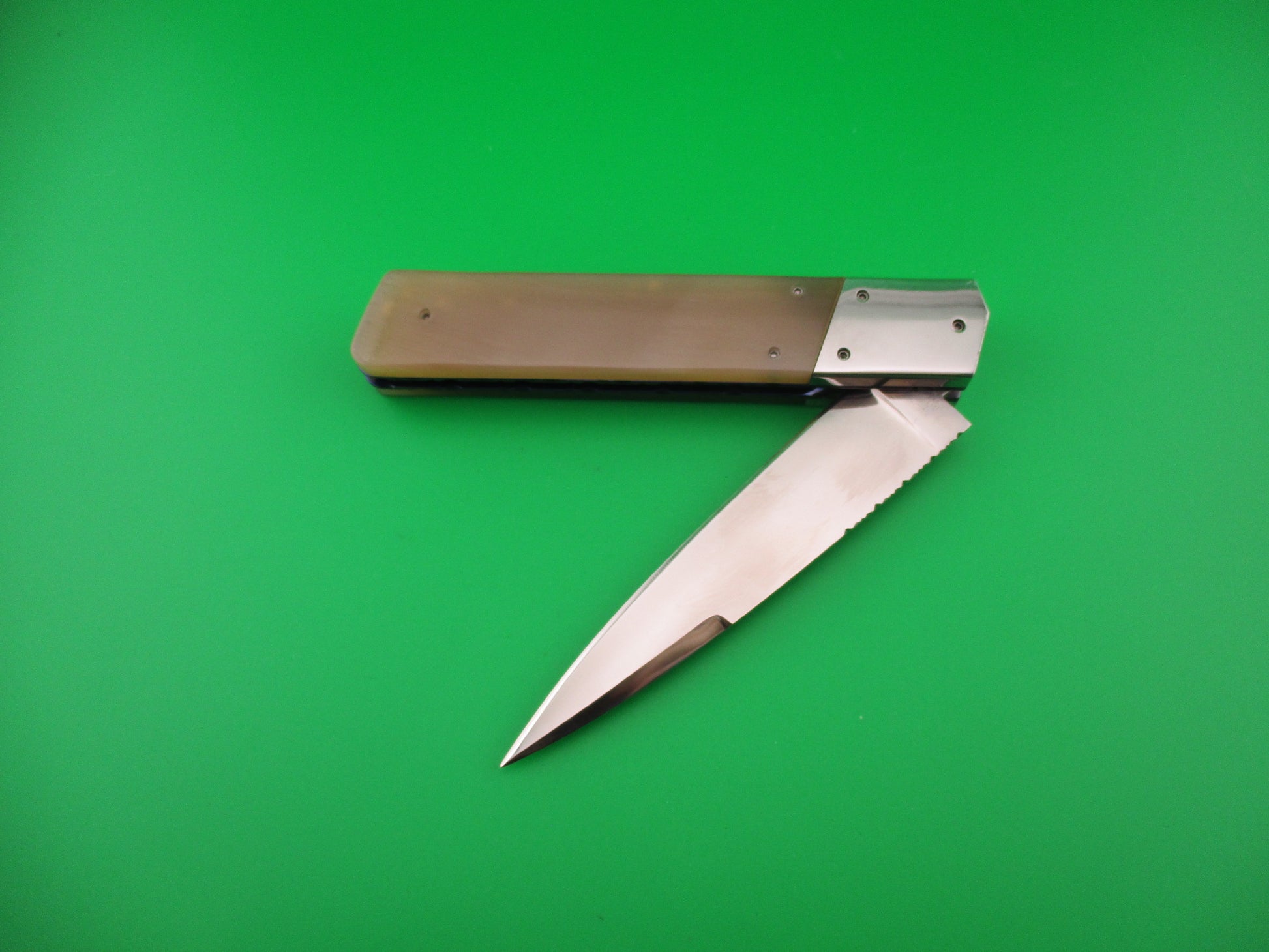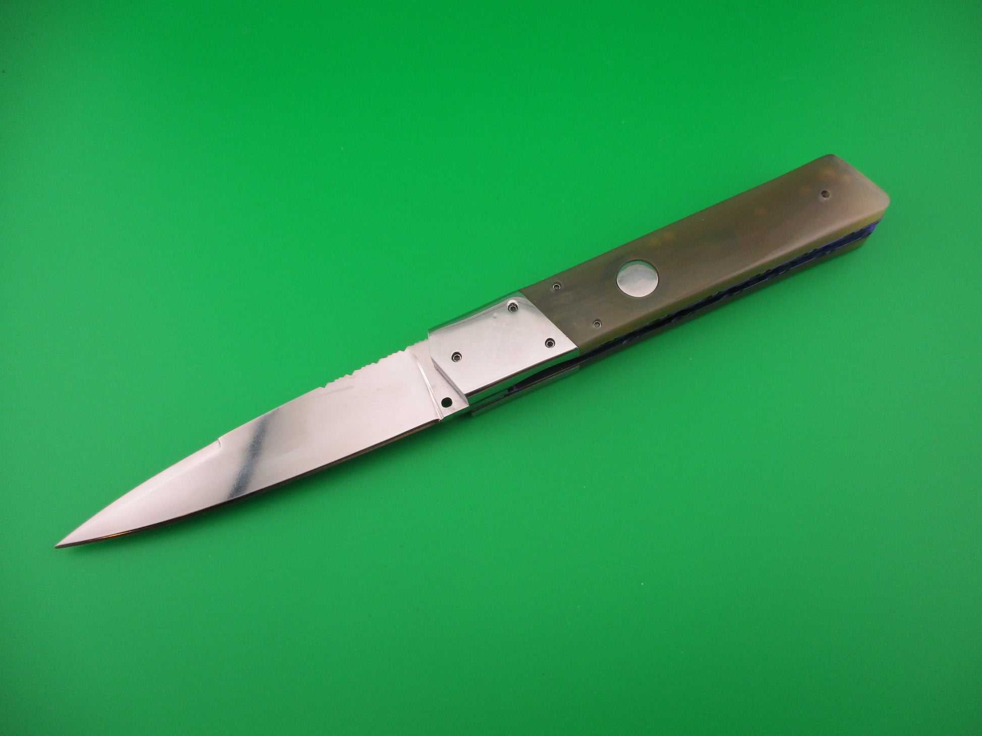 Custom 23cm Round flush button Spear swedge Honey horn w filework automatic knife