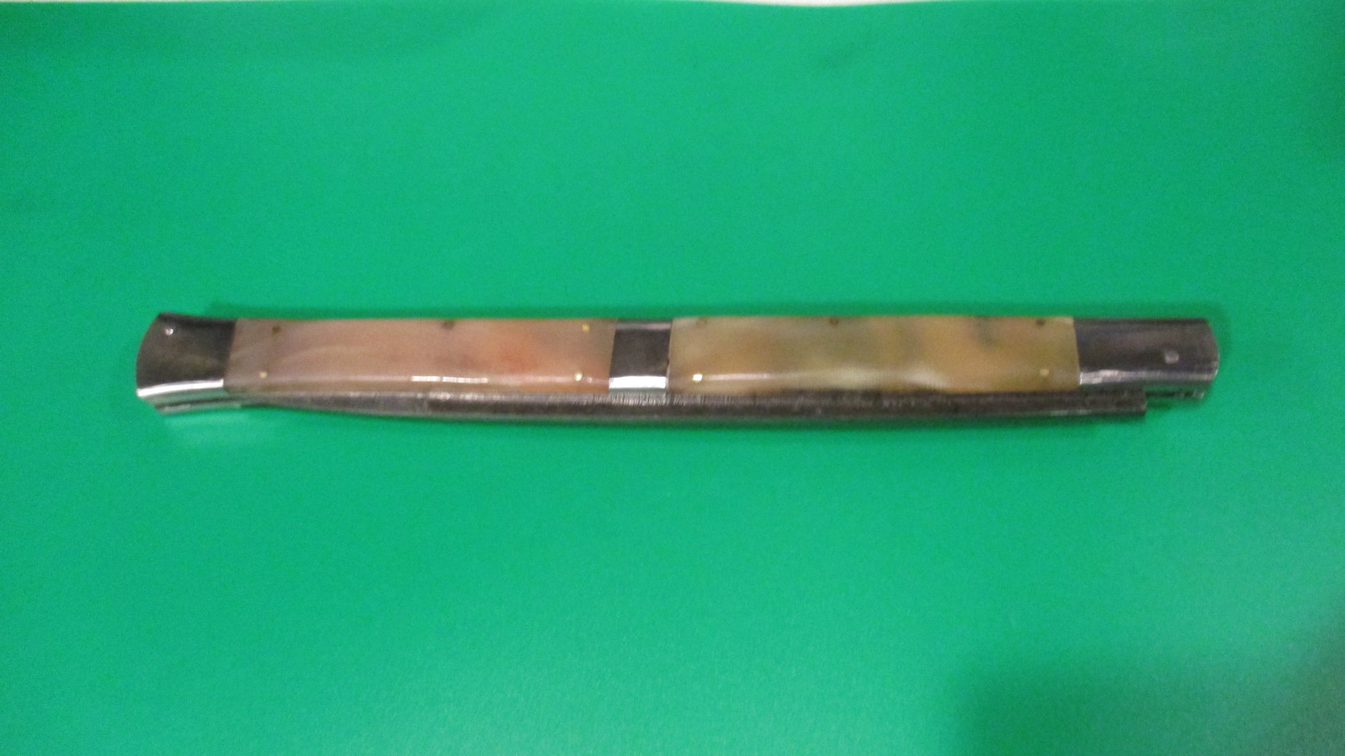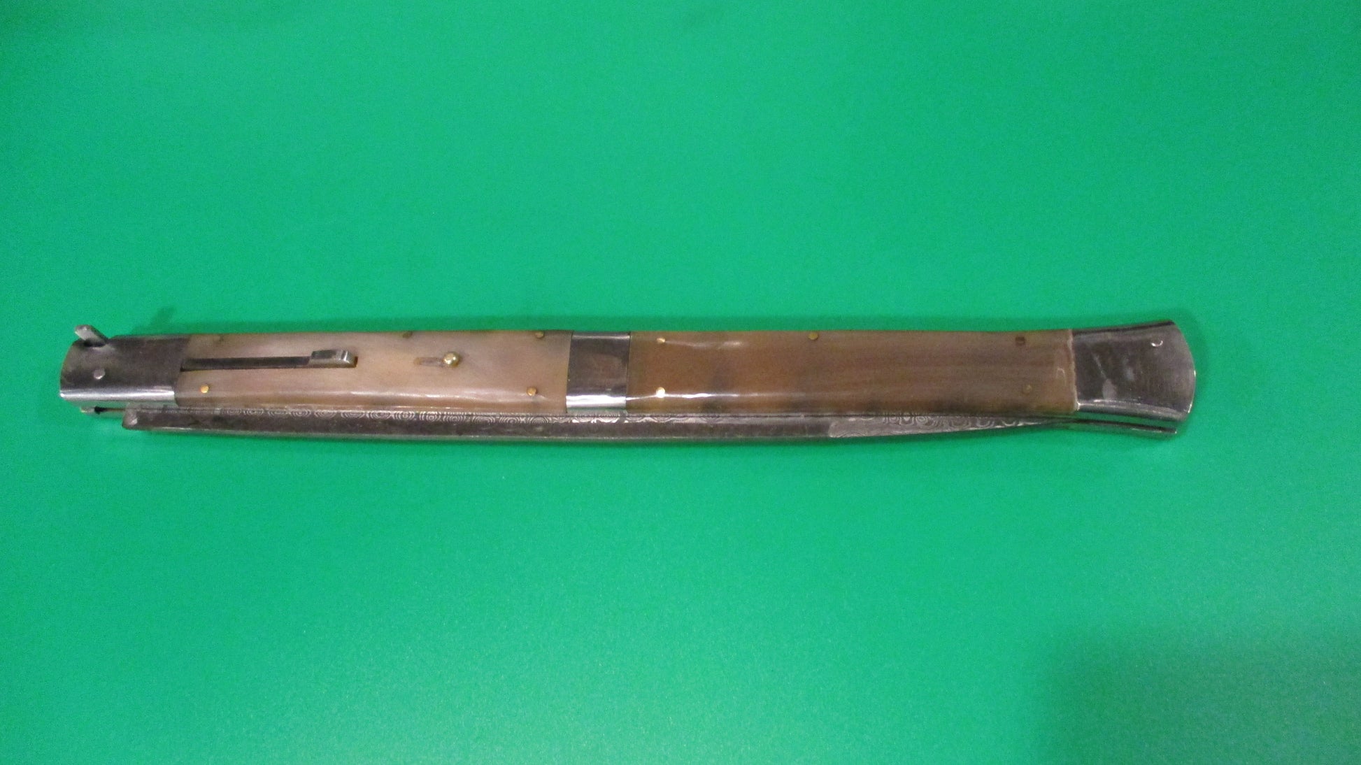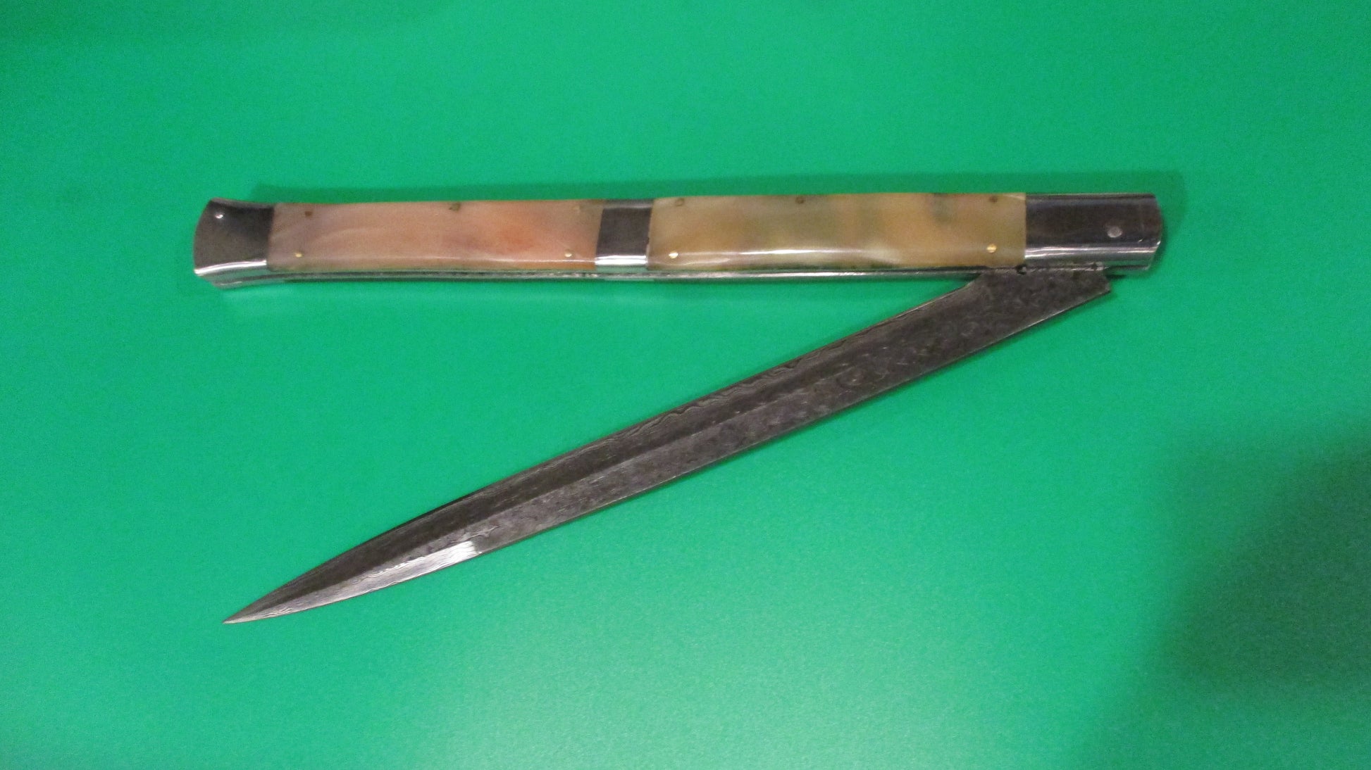 Custom 61cm Italian Prioletta inspired Monster Damascus & Horn Automatic knife by Samir Ahmad. This knife measures a whopping 61.2cm (24 1/8 inches) open and weighs in at 580 grams (1.2 pounds)! It has steel liners bolsters and rectangular button and a brass fixed (non moving) faux safety. The 12 inch Damascus bayonet style blade is 100% full and has original SHARP edge. Really gorgeous hand made Damascus. The light horn scales are very attractive and in great condition. The knife functions perfectly with the blade tip deep and centered, opens fully with a lout "THWACK" and locks up tight! This knife is an EXPERIENCE to open and fun to Play with!! It really is a MONSTER! Made by master cutler Samir Ahmad. New condition.